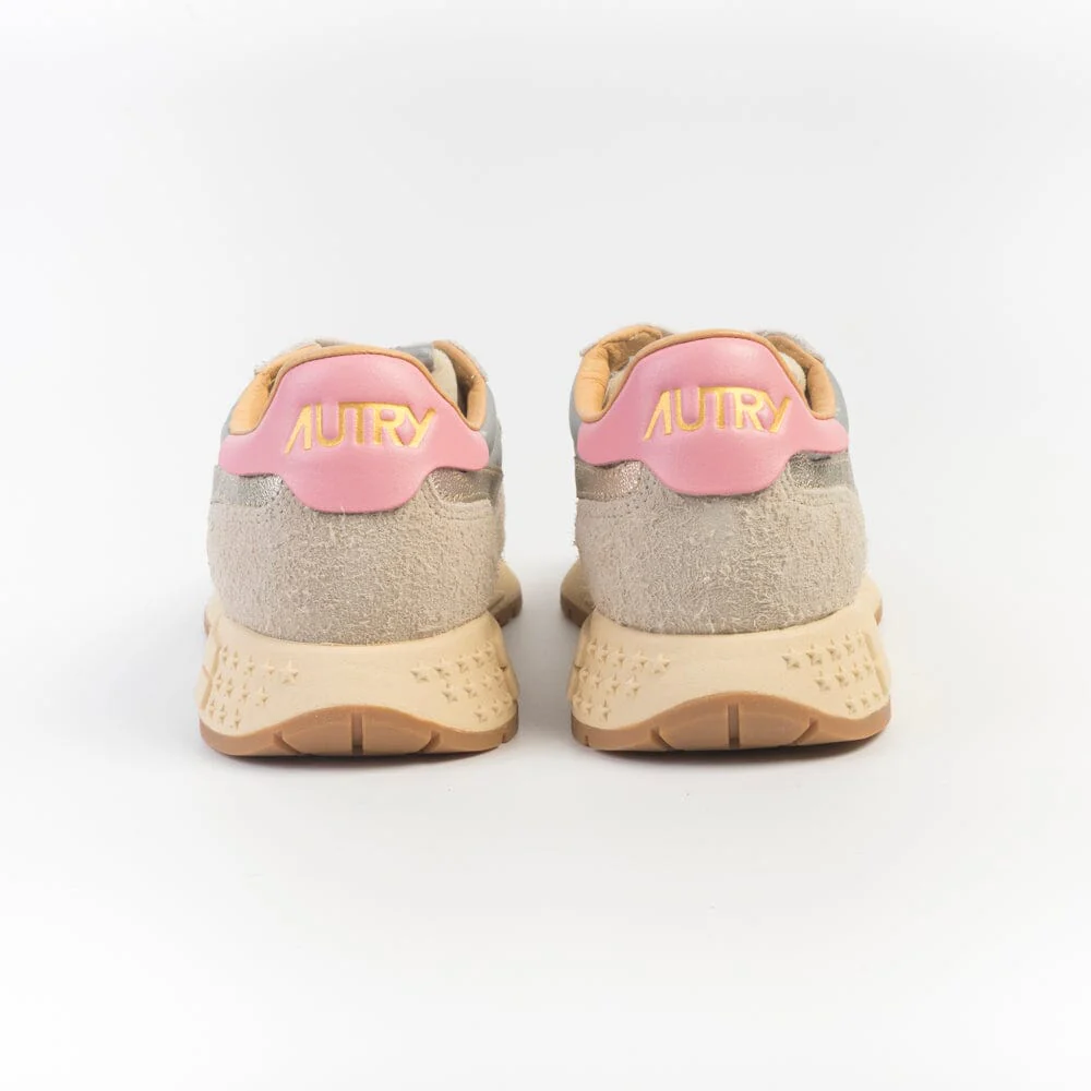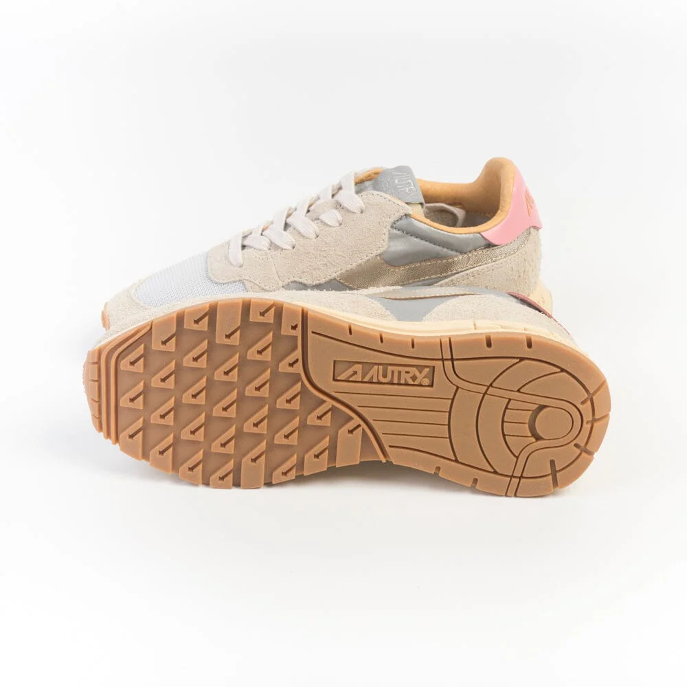 Nuove sneakers ReelWind di Autry, realizzate in camoscio di colore beige, tessuto tecnico e mesh di colore grigio, con dettagli in pelle di colore laminato oro e rosa. Applicazione di logo del marchio con bandiera americana sui lati esterni. Lacci in cotone di colore avorio.