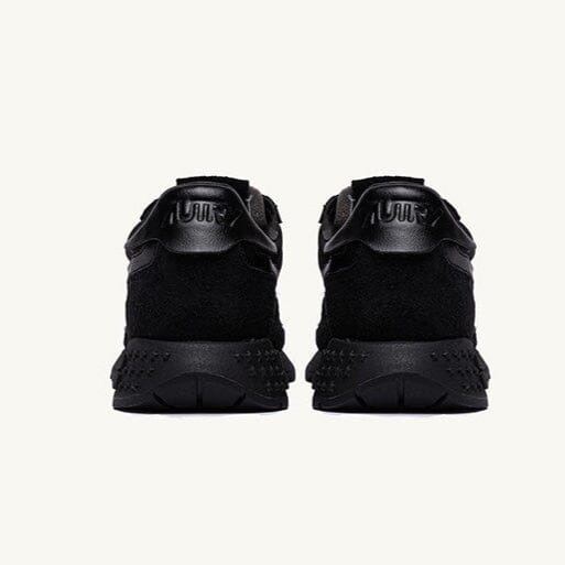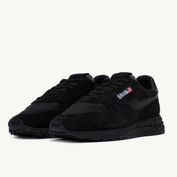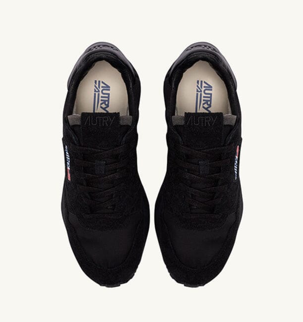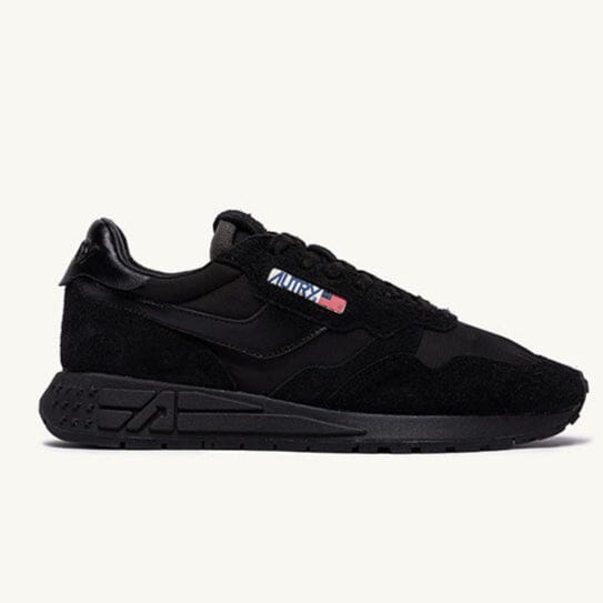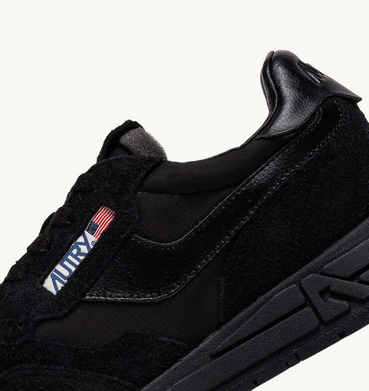 Nuove sneakers ReelWind di Autry, realizzate in camoscio, tessuto tecnico e mesh di colore nero, con dettagli in pelle in nuances. Applicazione di logo del marchio con bandiera americana sui lati esterni. Lacci di cotone di colore nero. Suola ultraleggera in gomma Phylon, la quale offre comfort e versatilità al tempo stesso.