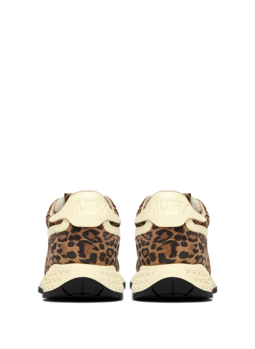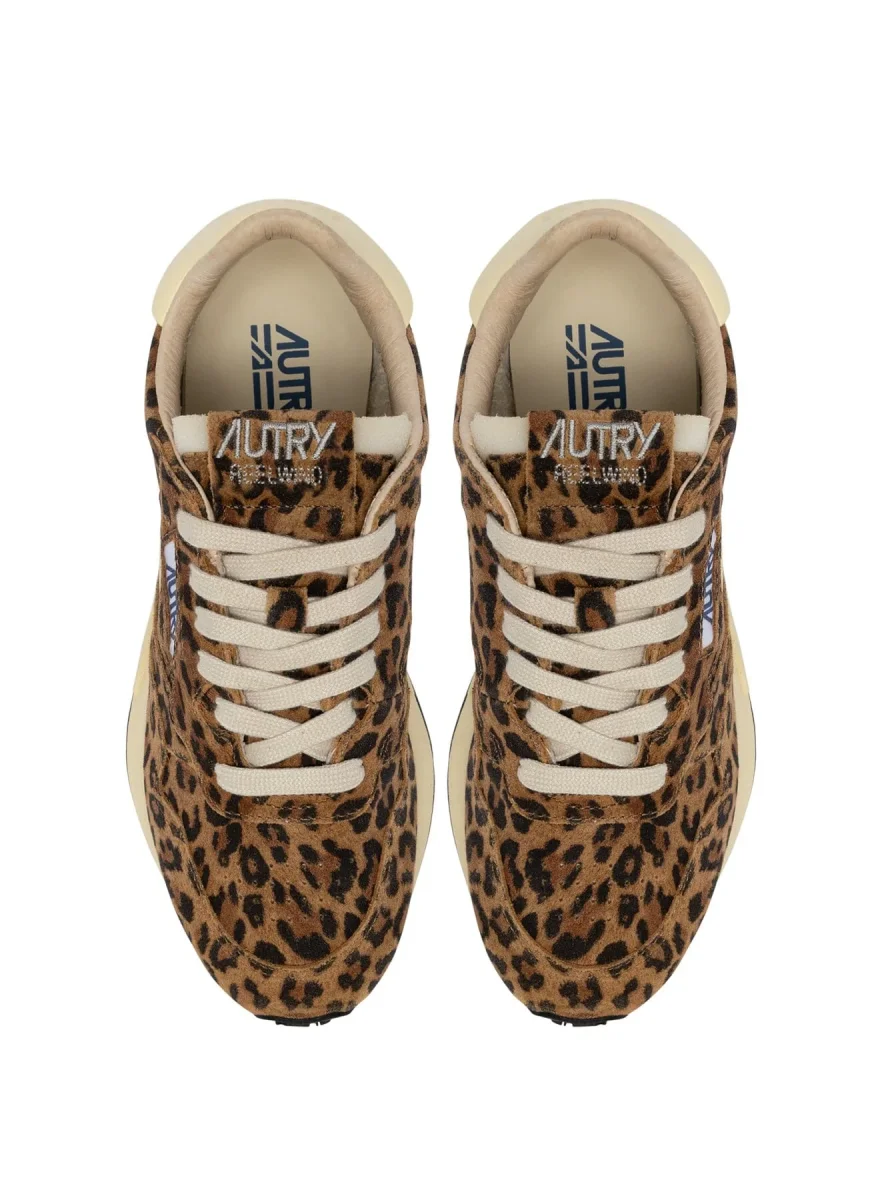 Nuove sneakers ReelWind di Autry, realizzate in camoscio a stampa animalier nei colori cuoio, marrone e nero, dettagli in pelle di colore avorio. Applicazione di logo del marchio con bandiera americana sui lati esterni. Lacci in cotone di colore avorio. Suola ultraleggera in gomma Phylon, la quale offre comfort e versatilità al tempo stesso.