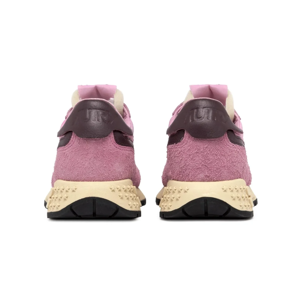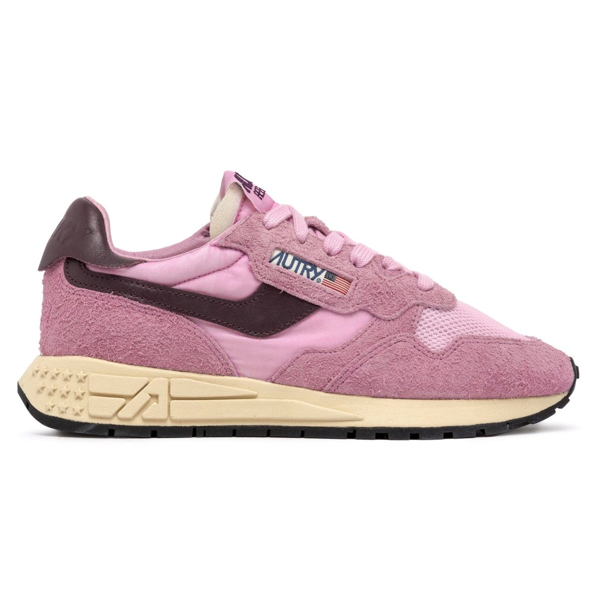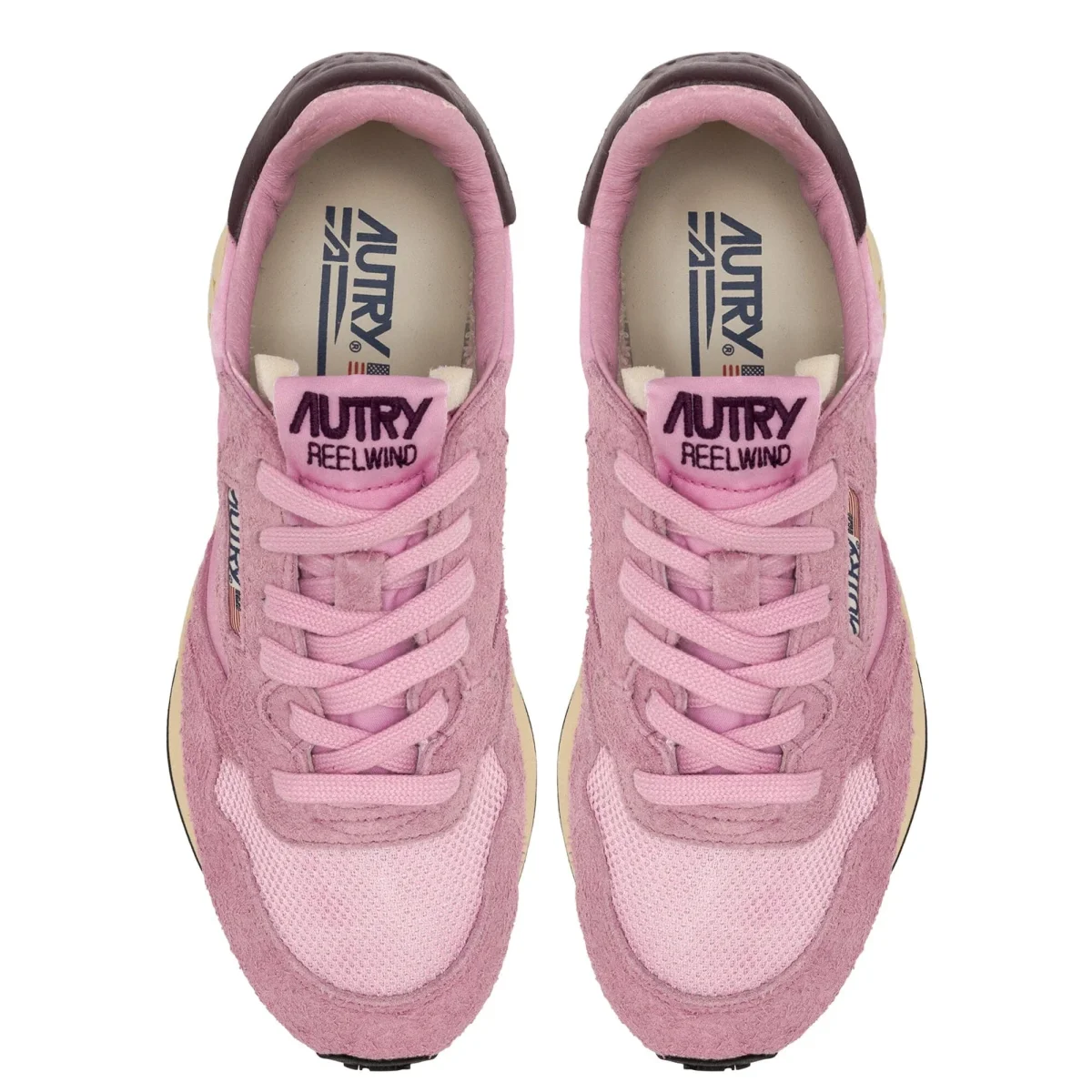 Nuova sneaker ReelWind di Autry, realizzata in camoscio e tessuto tecnico di colore rosa orchidea, con dettagli in pelle di colore bordeaux. Applicazione di logo del marchio con bandiera americana sui lati esterni. Suola ultraleggera in gomma Phylon, la quale offre comfort e versatilità al tempo stesso. Lacci di cotone di colore in nuance.