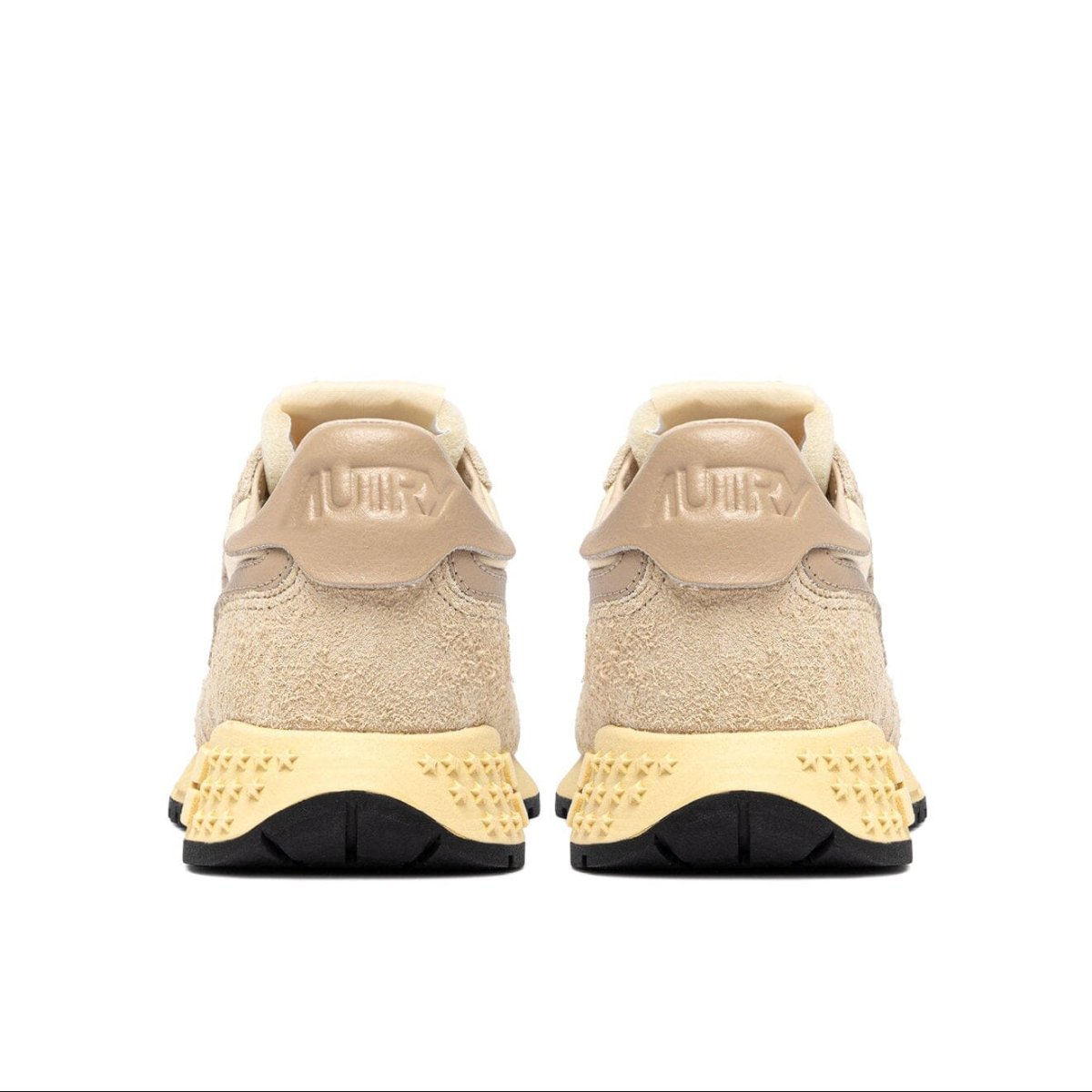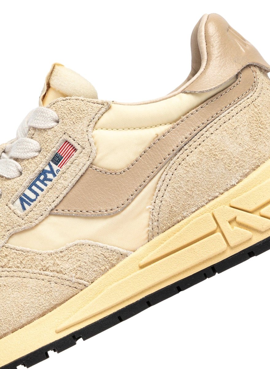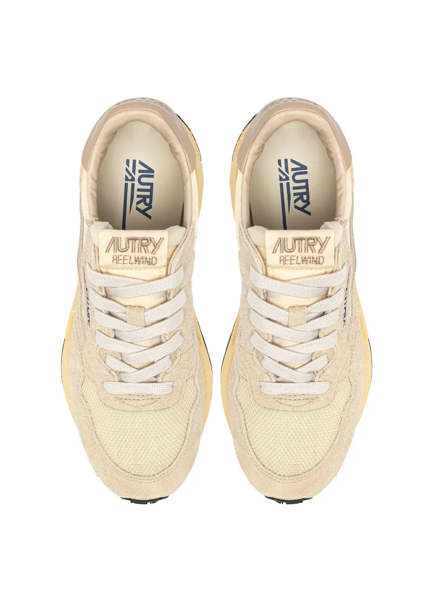 Nuove sneakers ReelWind di Autry, realizzate in camoscio e pelle di colore beige, tessuto tecnico e mesh di colore avorio. Applicazione di logo del marchio con bandiera americana sui lati esterni. Lacci in cotone di colore avorio. Suola ultraleggera in gomma Phylon, la quale offre comfort e versatilità al tempo stesso.