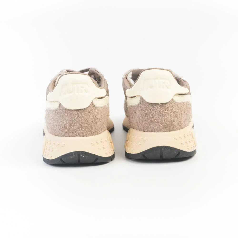 Nuove sneakers ReelWind di Autry, realizzate in camoscio, tessuto tecnico e mesh di colore tortora, con dettagli in pelle di colore panna. Applicazione di logo del marchio con bandiera americana sui lati esterni. Lacci in cotone di colore tortora. Suola ultraleggera in gomma Phylon, la quale offre comfort e versatilità al tempo stesso.