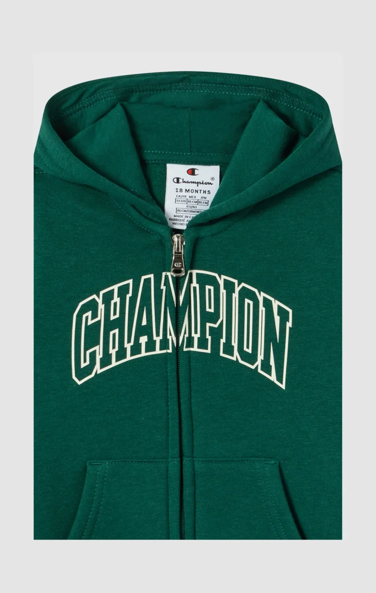 A practical and cozy set ideal for every moment of your day. The full-zip hoodie features a contrasting Champion logo on the chest, while the elastic cuff pants complete the look with functionality and style. The fleece fabric with brushed interior provides warmth and softness.@@@Fabric: Compact and soft fleece 240 g/m² |Composition: 54% Cotton, 46% Polyester |Brushed interior for superior thermal comfort |Fixed hood |Fleece with front pockets |Full-length front zip |Front graphic print |Pants with drawstring and ribbed cuffs |Fit: Standard Fit – versatile and comfortable with standard widths and lengths. Close to the body with simple lines that don’t cling. Regular shoulder cut.