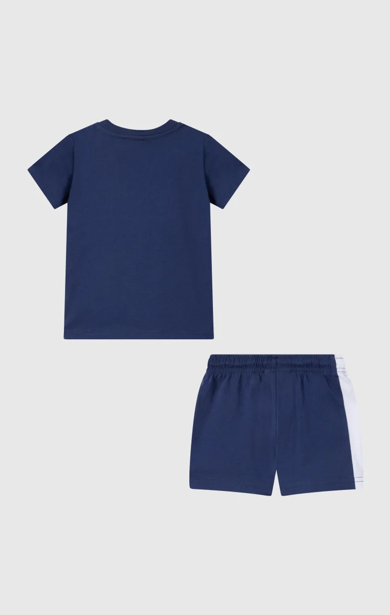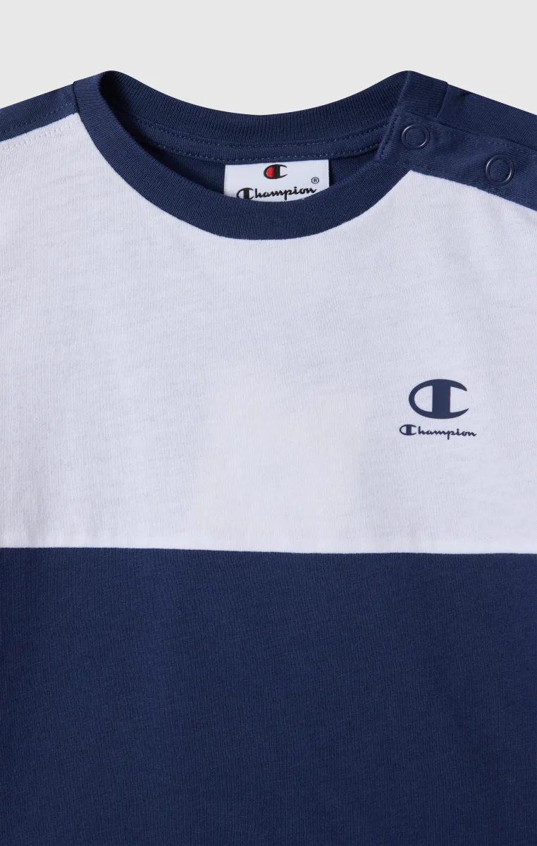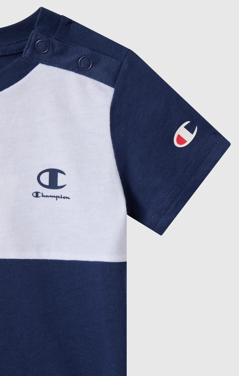 This infant set features a clean and contemporary sportswear aesthetic, in line with the Champion DNA. The set includes a short-sleeved T-shirt and matching shorts, both made from lightweight cotton jersey to provide softness and comfort for everyday wear. The Standard Fit ensures a regular and comfortable silhouette, ideal for playtime and relaxation. The color-block design and the Champion logo printed on the chest complete the look with a clean and recognizable style.@@@Standard Fit, comfortable with a regular silhouette |Lightweight cotton jersey |Composition: 100% Cotton |Fabric weight: 150 g/m² |Set includes a short-sleeved T-shirt and shorts |Crewneck |Elasticated waistband on the shorts