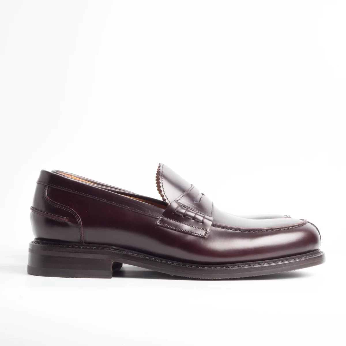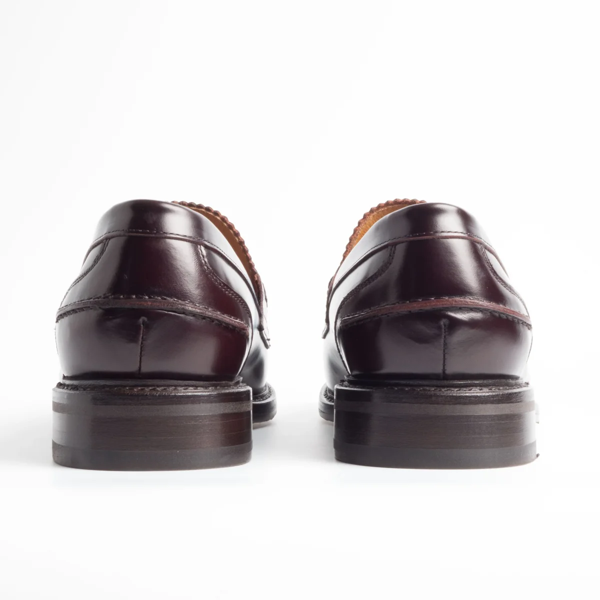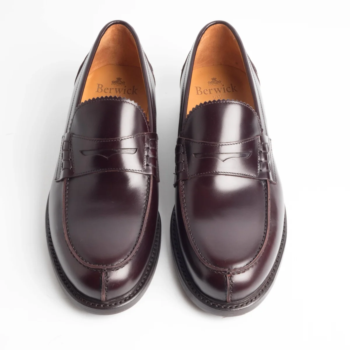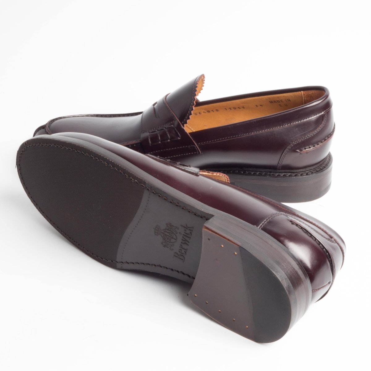 Mocassino Berwick 1707 in pelle di vitello colore marrone/bordeaux, costruzione Goodyear, interno e sottopiede foderato in pelle, suola in gomma. Tacco 3 cm.