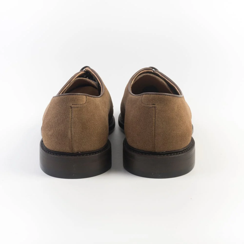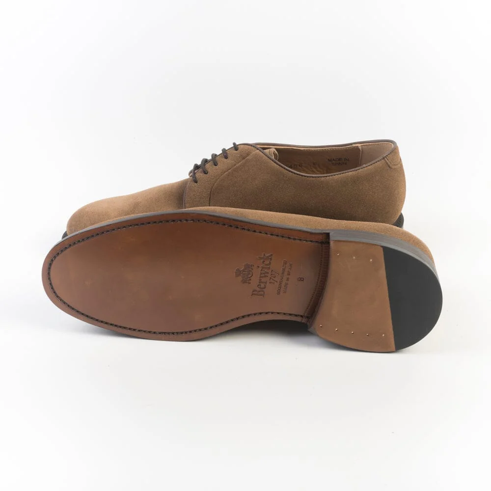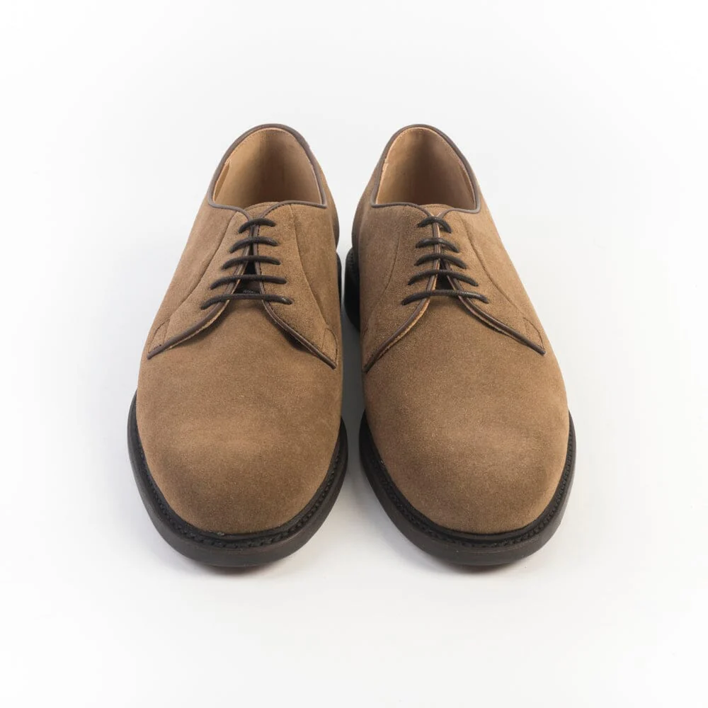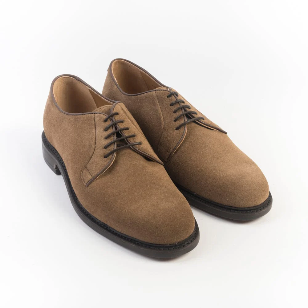 Derby di Berwick, realizzato in camoscio di colore nocciola. Punta tondeggiante, interno sfoderato, 5 fori con lacci in cotone cerato. Sottopiede in pelle. Suola in cuoio. Lavorazione Goodyear.