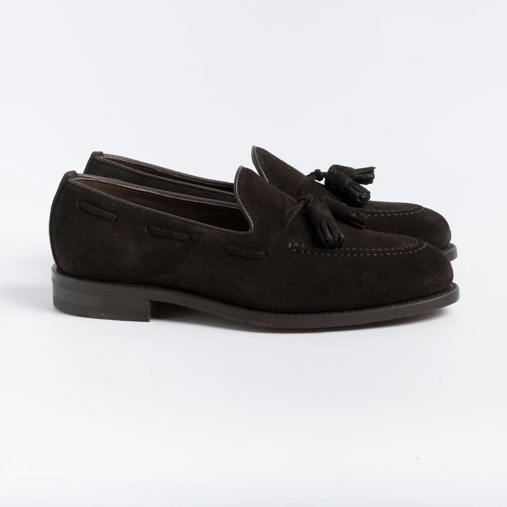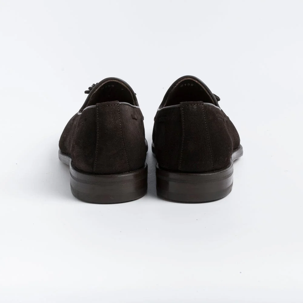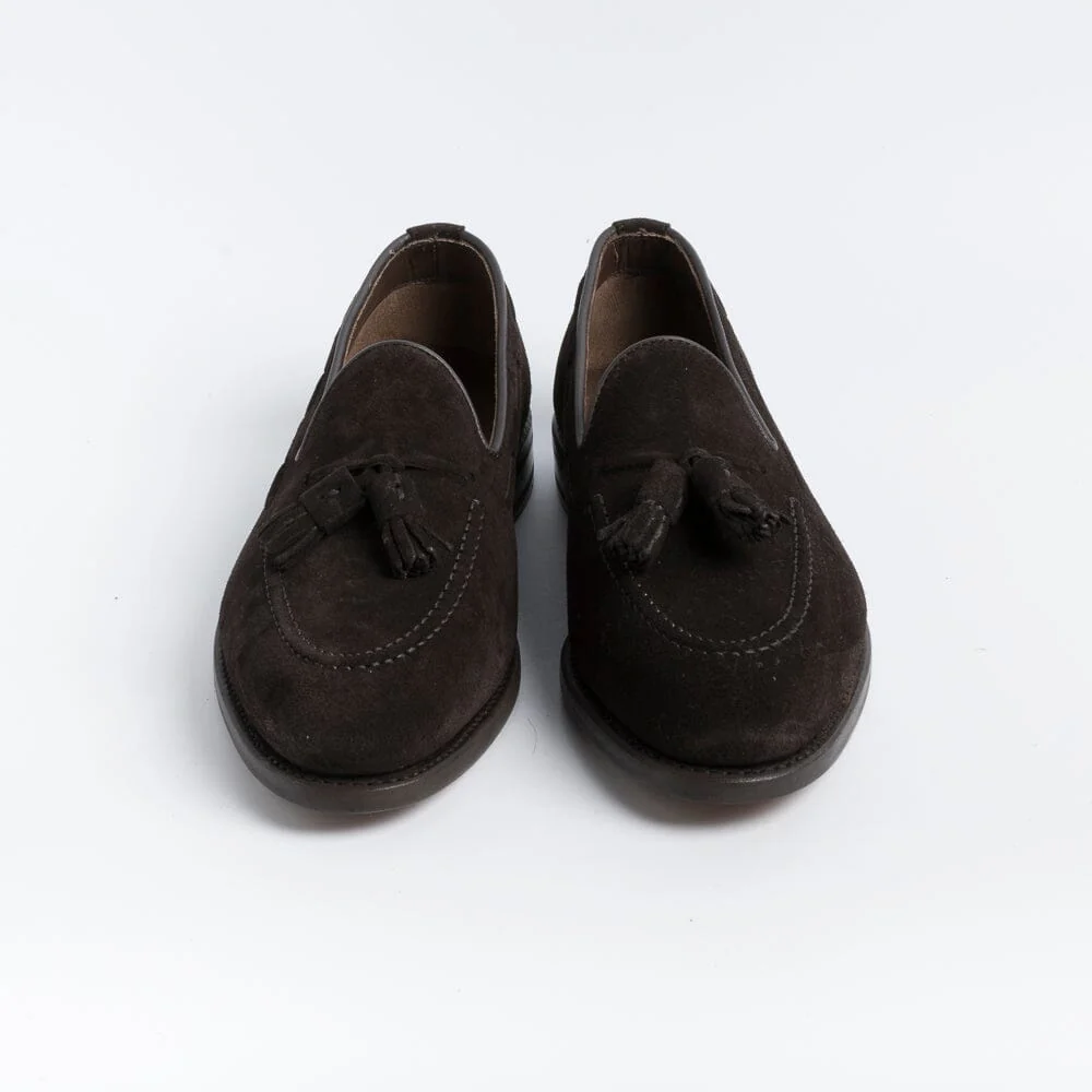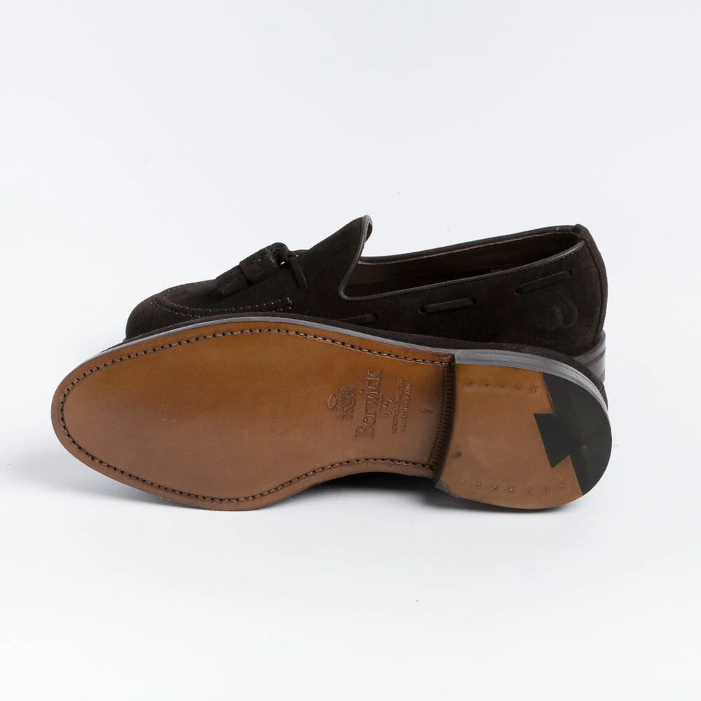 Mocassino con nappine di Berwick realizzato in morbida pelle scamosciata di colore testa di moro. Punta affusolata, interno sfoderato e sottopiede in pelle. Suola in cuoio. Lavorazione Goodyear.