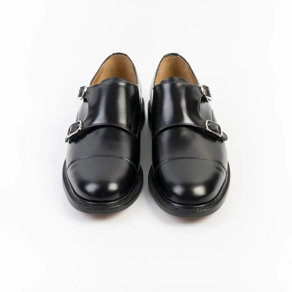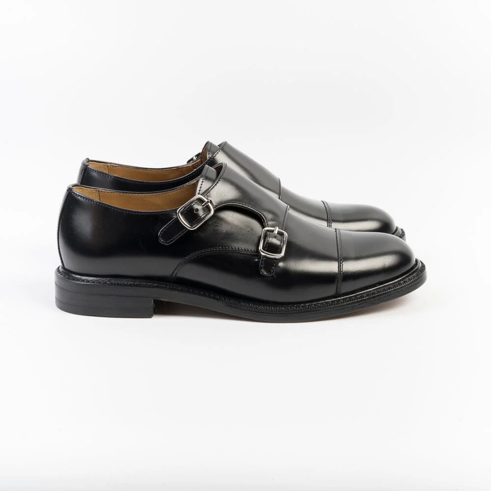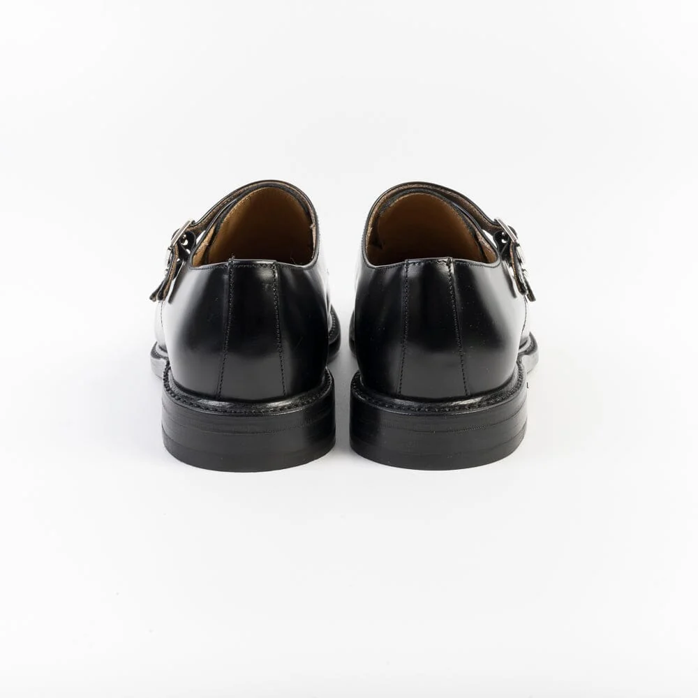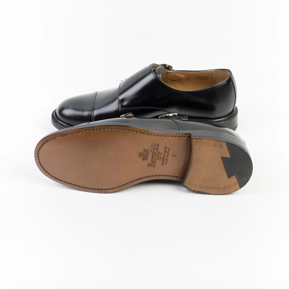 Doppia fibbia di Berwick 1707, realizzata in pelle di vitello di colore nero spazzolato. Punta a forma tondeggiante. Chiusura con doppia fibbia in nickel regolabile. Interno e sottopiede foderato in pelle. Fondo in cuoio con costruzione Goodyear.