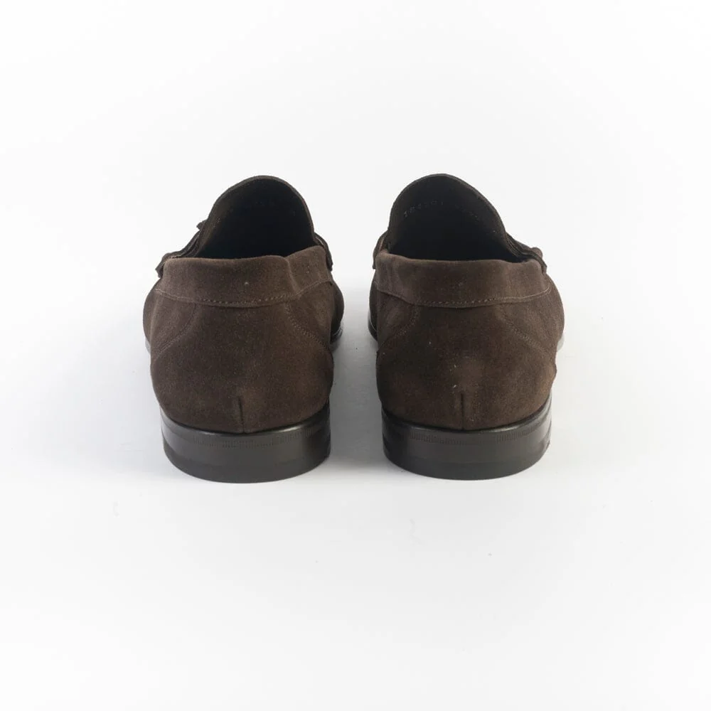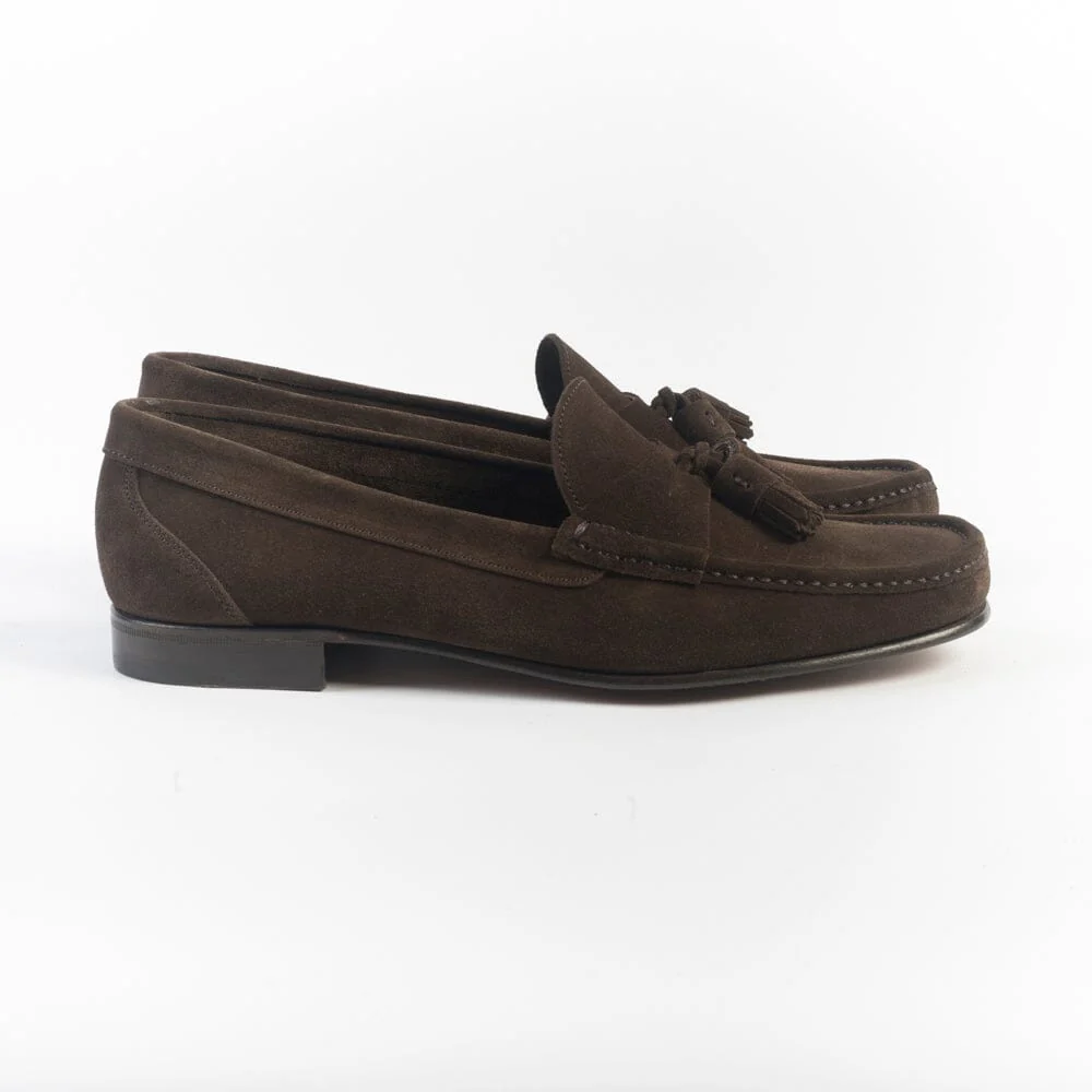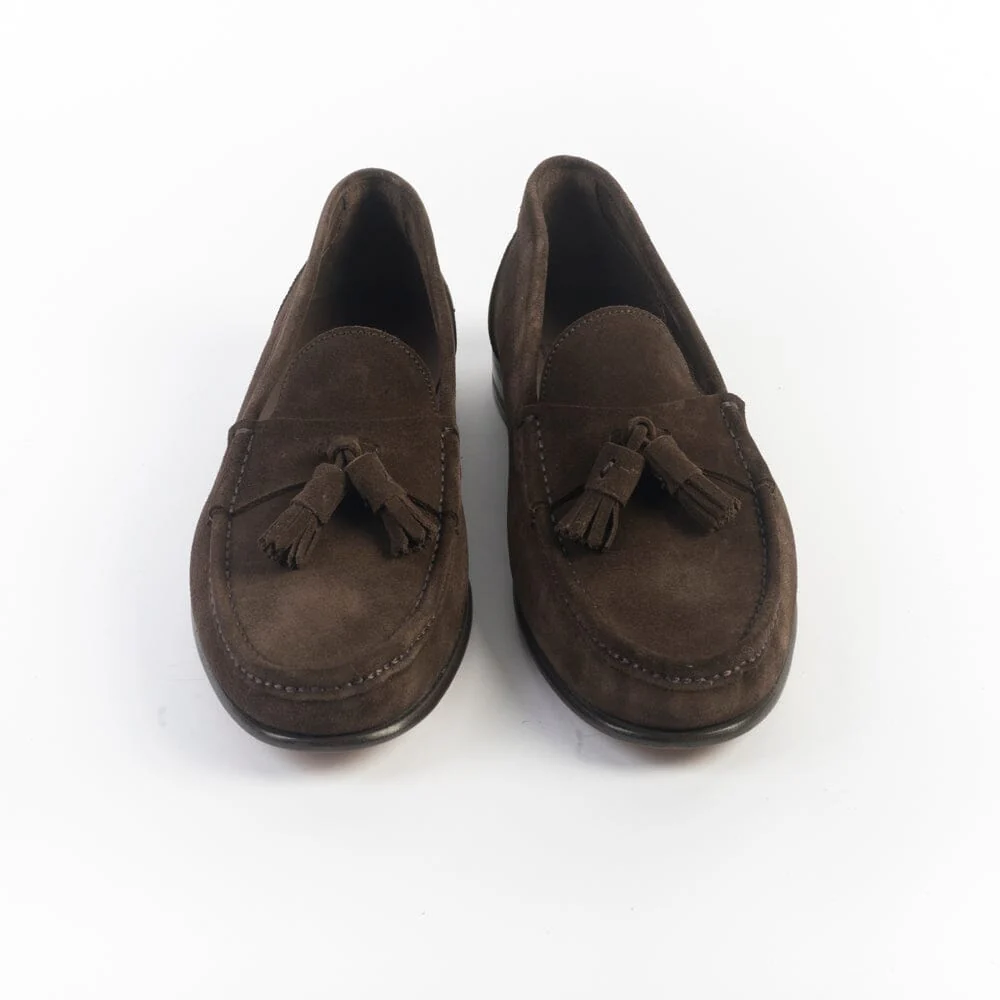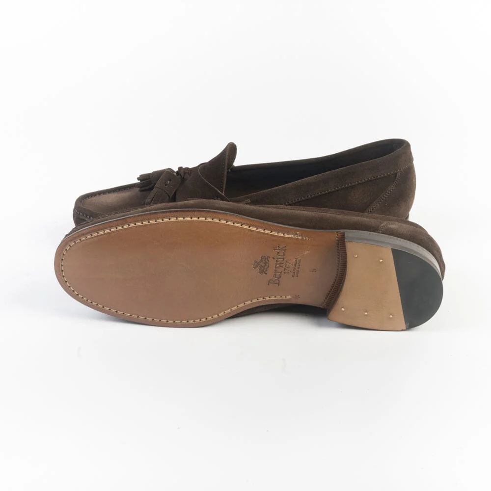 Mocassino con nappine, leggerissimo, di Berwick realizzato in camoscio di colore testa di moro. Interno sfoderato. Sottopiede in pelle. Suola in cuoio.