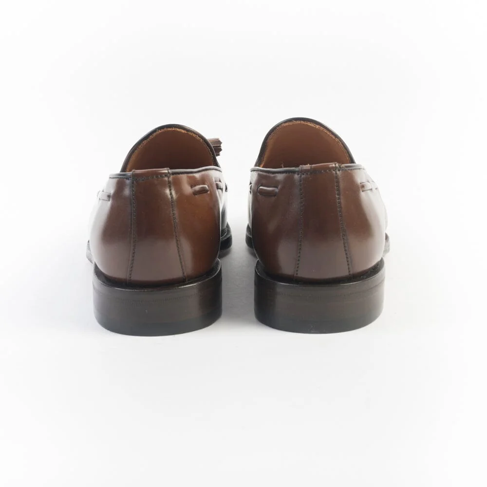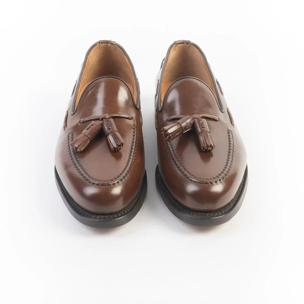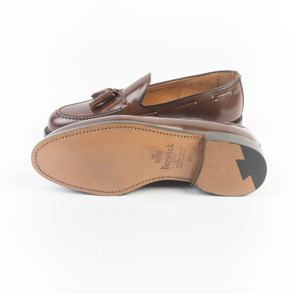 Mocassino classico di Berwick realizzato in pelle di cavallo con nappine di colore marrone chiaro lucido. Punta affusolata, interno foderato. Sottopiede in pelle. Suola in cuoio.