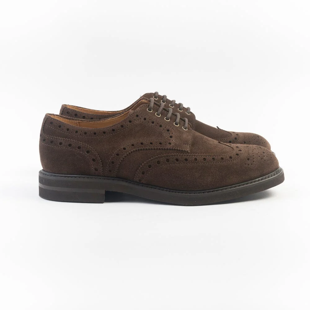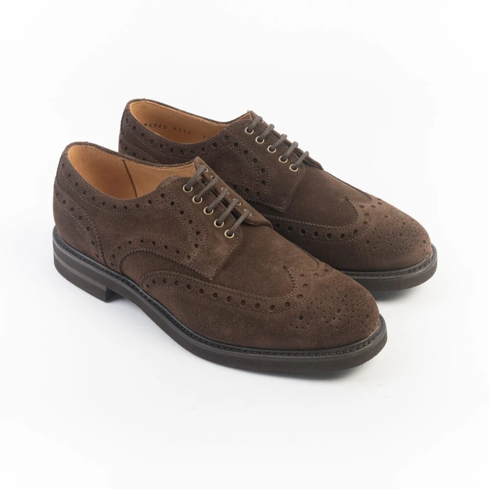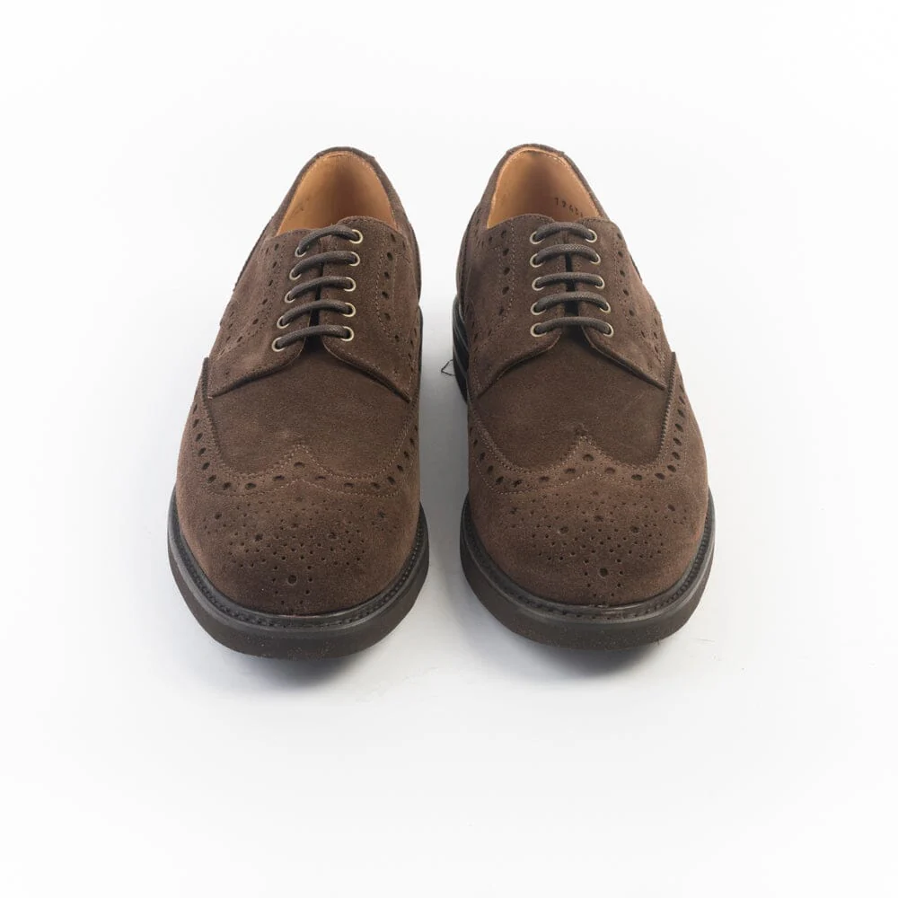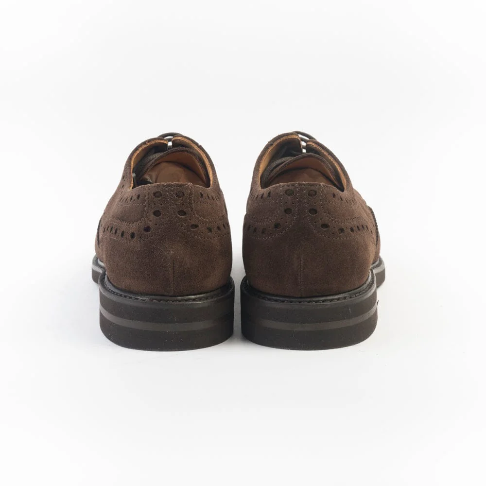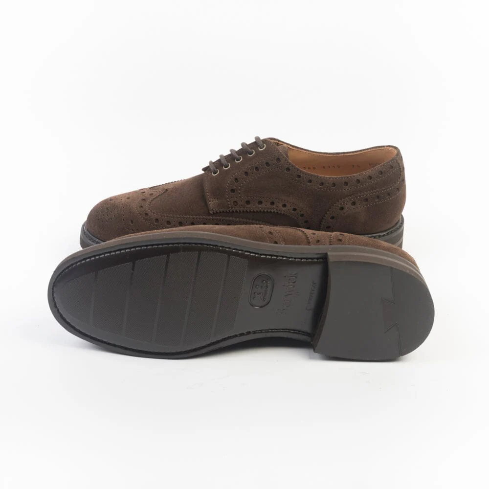 Scarpa allacciata di Berwick 1707, realizzata in camoscio di colore testa di moro. Lavorazione duillio, cinque fori e lacci cerati in nuance. Interno foderato in pelle. Suola in gomma. Costruzione Goodyear.