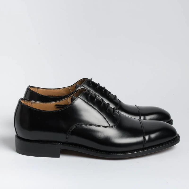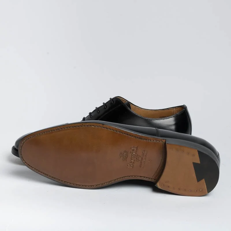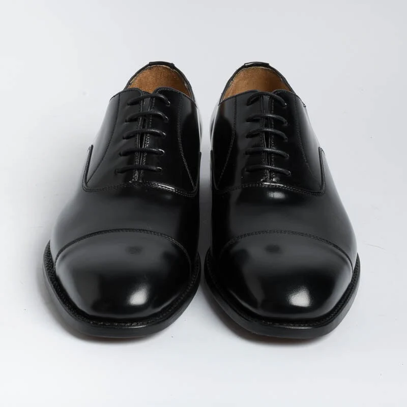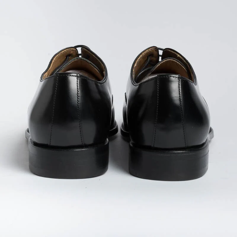 Francesina di Berwick 1707 , realizzata in pelle lucida di vitello di colore nero. Cinque fori, lacci in cotone cerato in sfumatura, fondo in cuoio, costruzione Goodyear, interno e sottopiede foderato in pelle. Tacco 3 cm