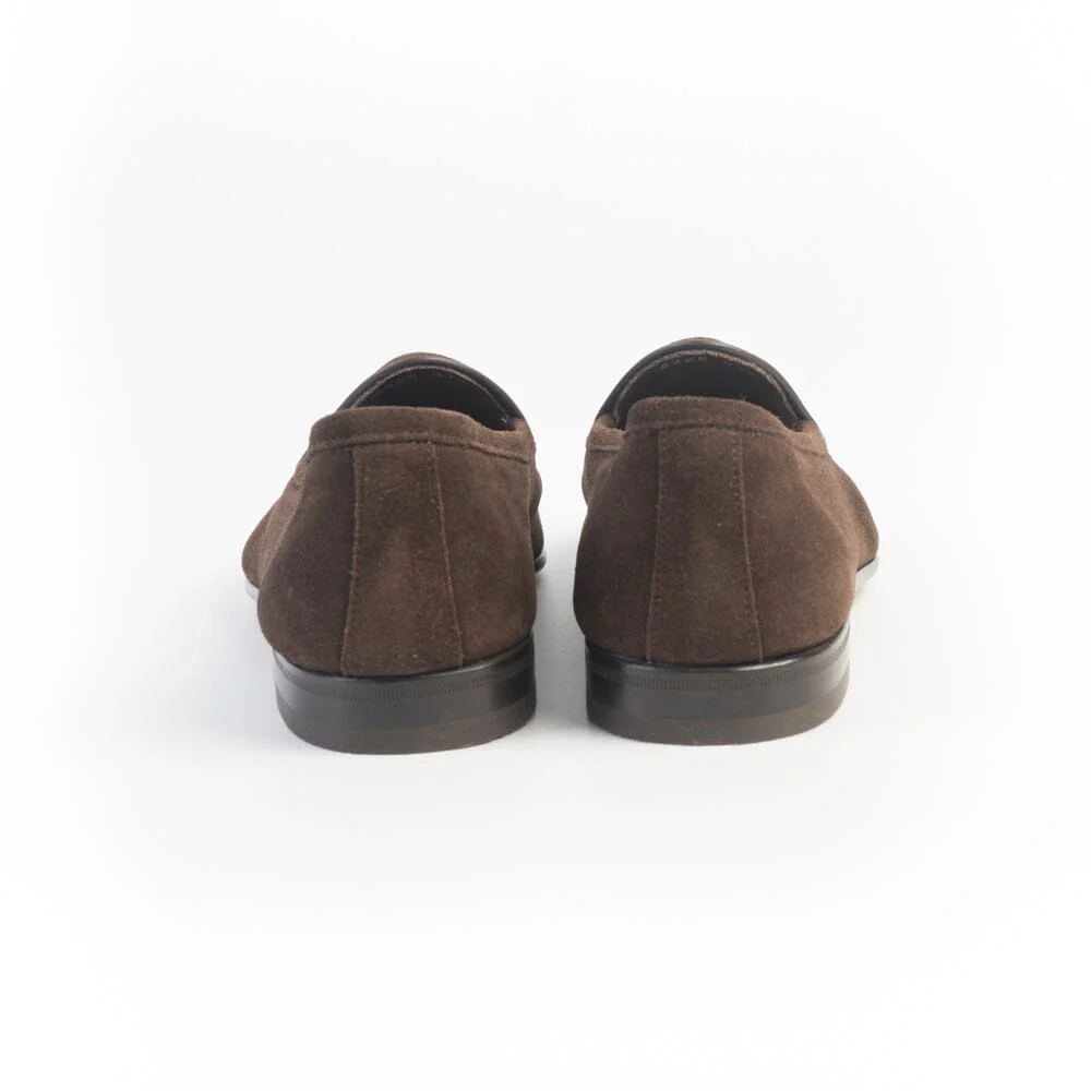 Mocassino stile belgian elegante Berwick realizzato in camoscio di colore testa di moro con punta affusolata e profili in pelle in nuance. Costruzione Blake, interno e sottopiede sfoderato in pelle, sottopiede in pelle, suola in cuoio e gomma.