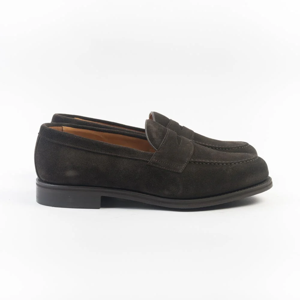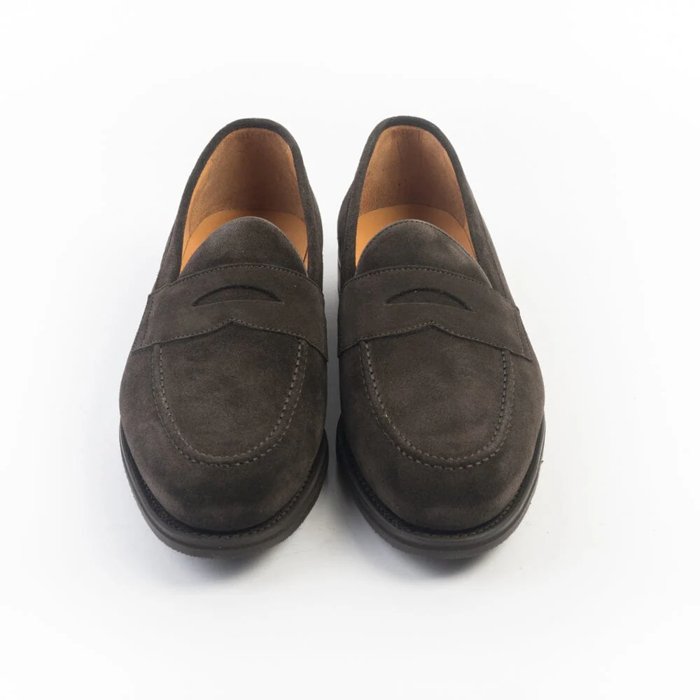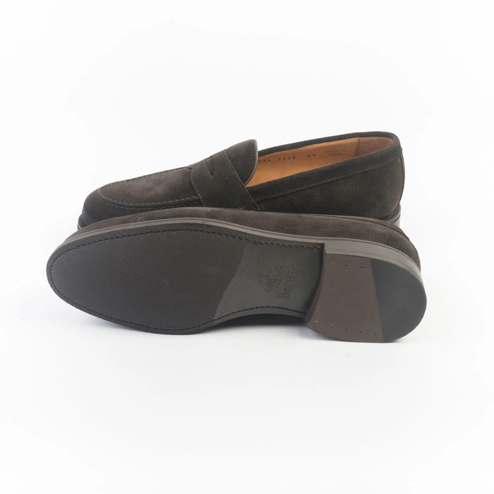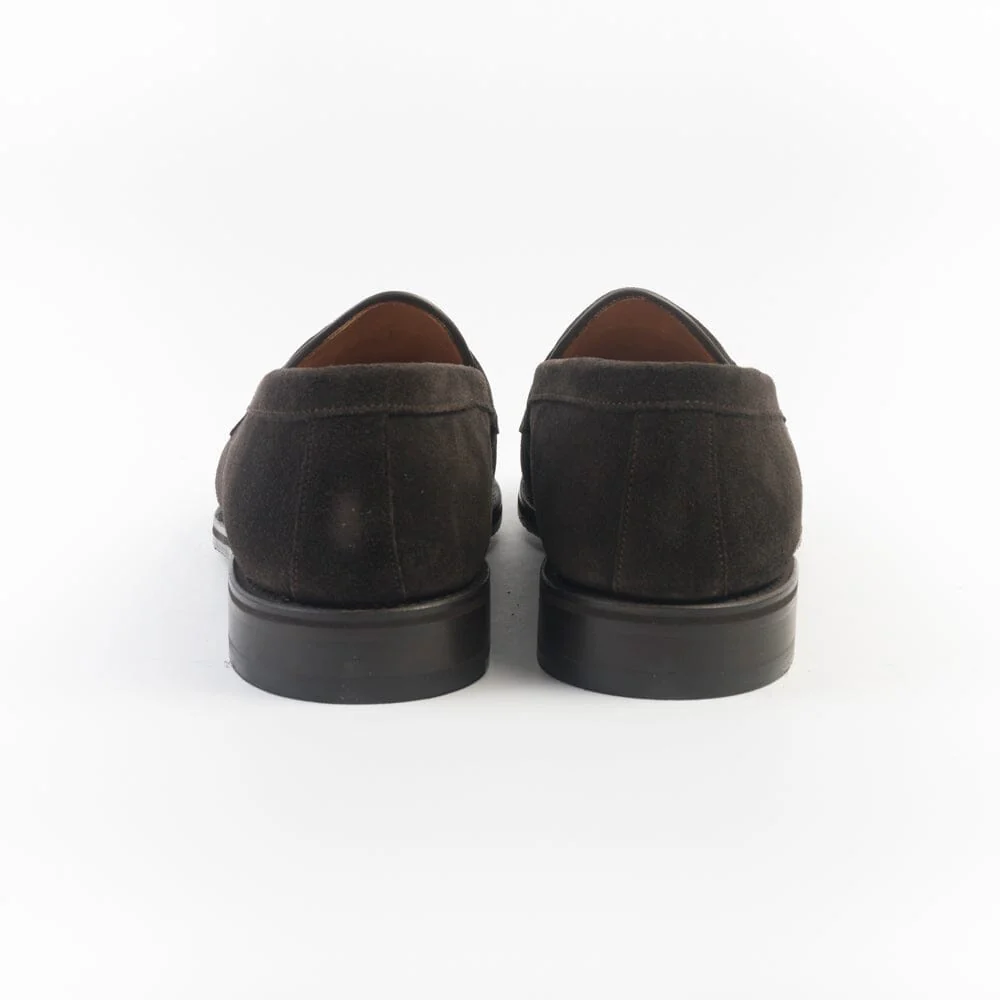 Mocassino Berwick 1707 con mascherina e punta sfilata realizzato in camoscio di colore testa di moro, interno e sottopiede foderato in pelle. Costruzione Goodyear, suola in gomma.