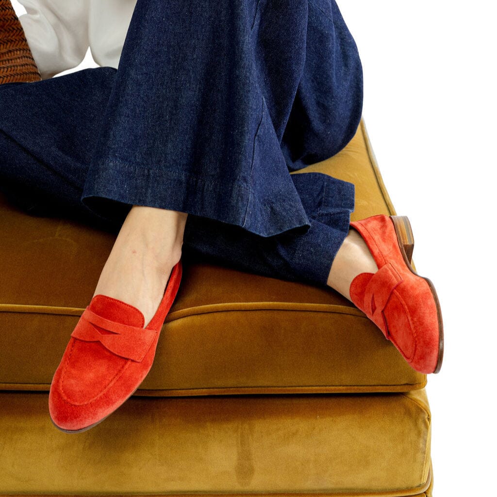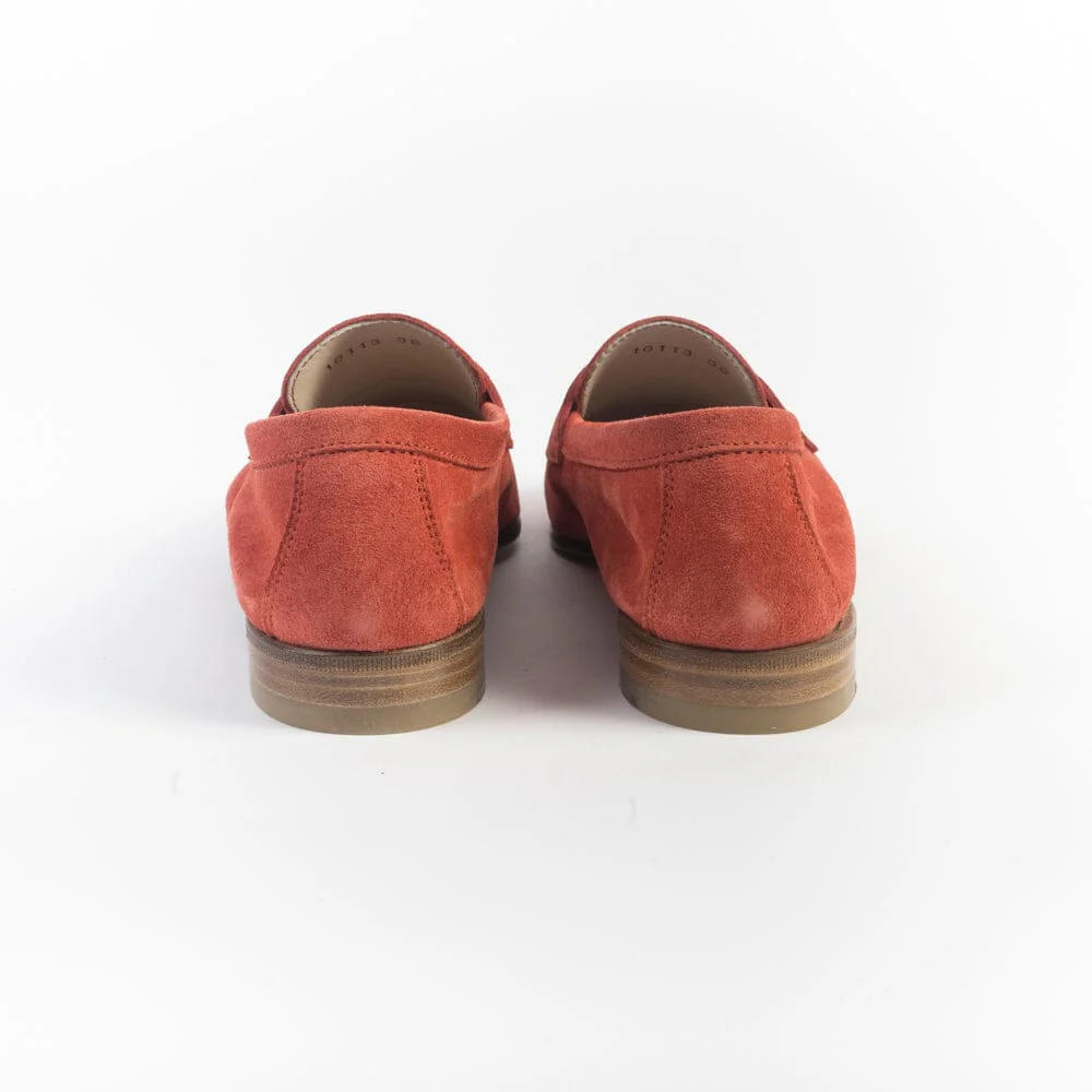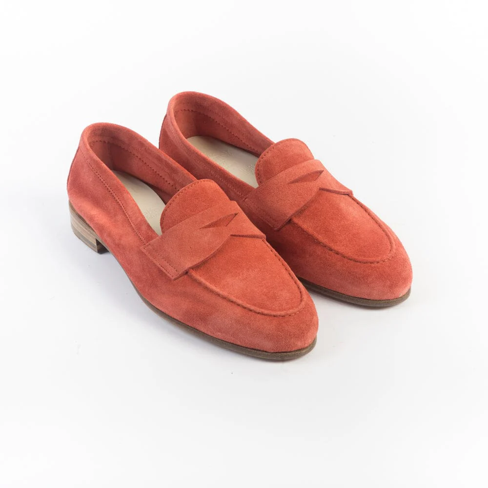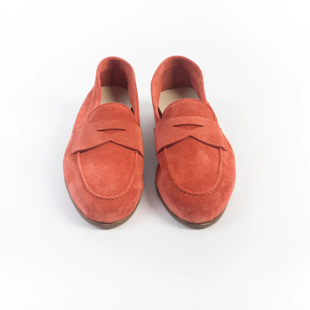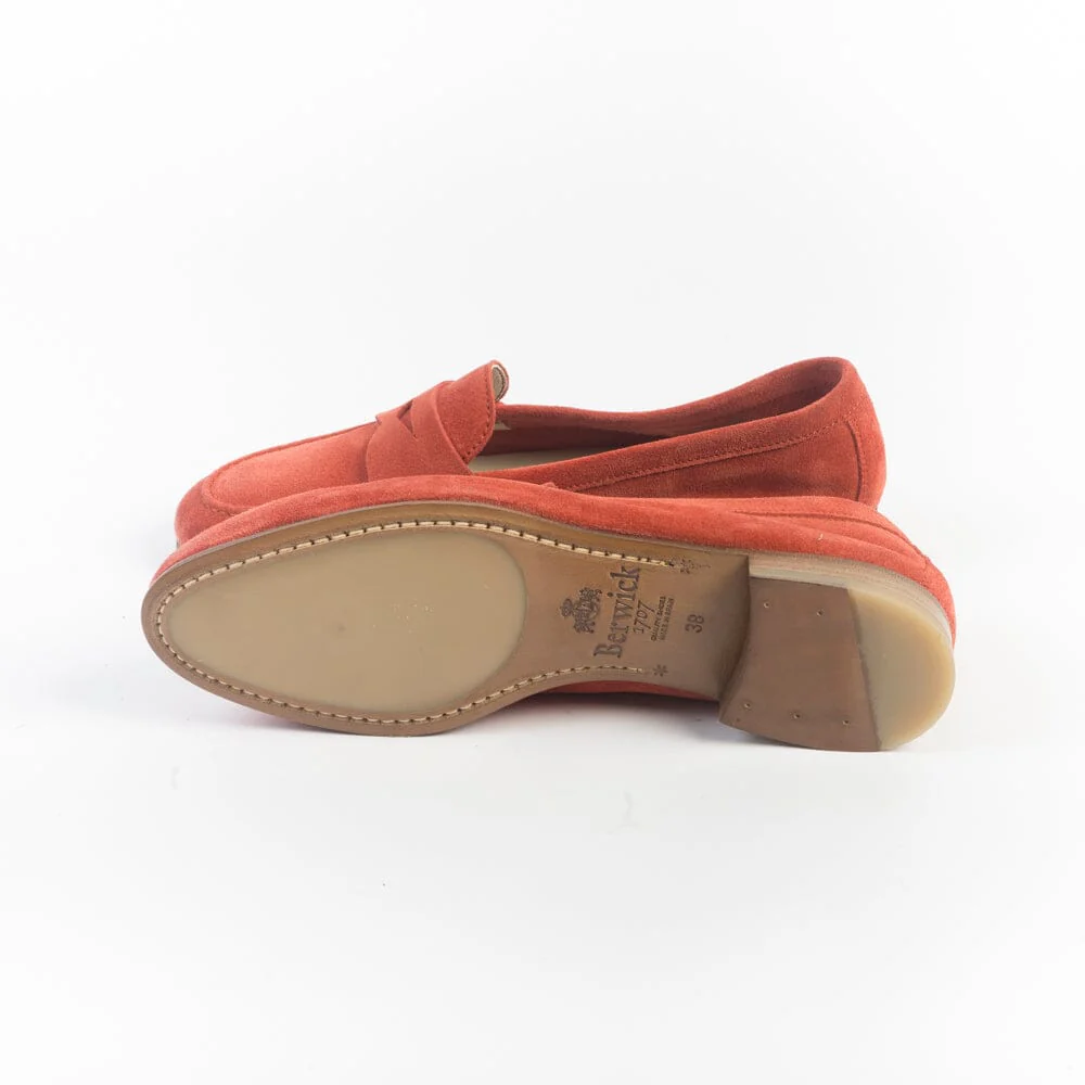 Mocassino con mascherina di Berwick, realizzato in camoscio di colore rosso; cuciture in nuance. Interno sfoderato. Fondo in cuoio con cucitura Goodyear, inserto in gomma. Tacco di altezza 2 cm. Calzata regolare.