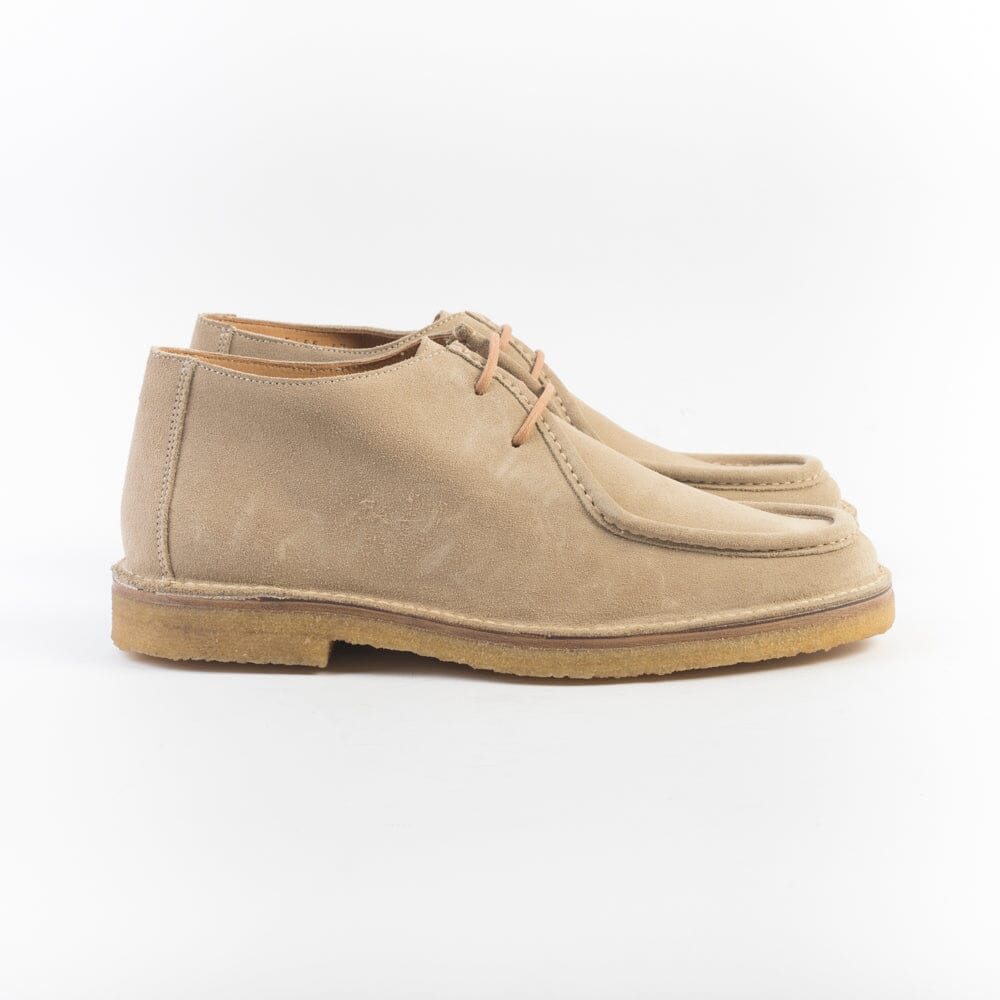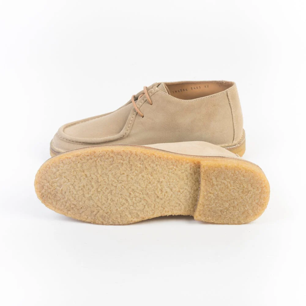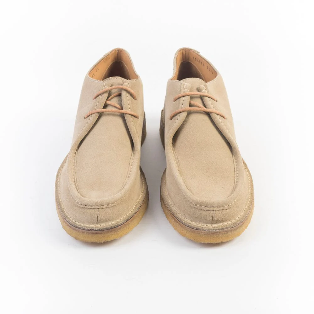Polacco alla caviglia di Berwick 1707, realizzato in pelle scamosciata di colore beige. Modello dal gusto sportivo, cucitura norvegese, due fori e lacci in cotone cerato in nuance. Interno e sottopiede in pelle, fondo para in gomma naturale. Tacco 2 cm.