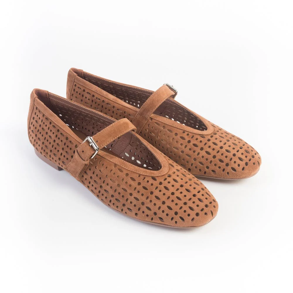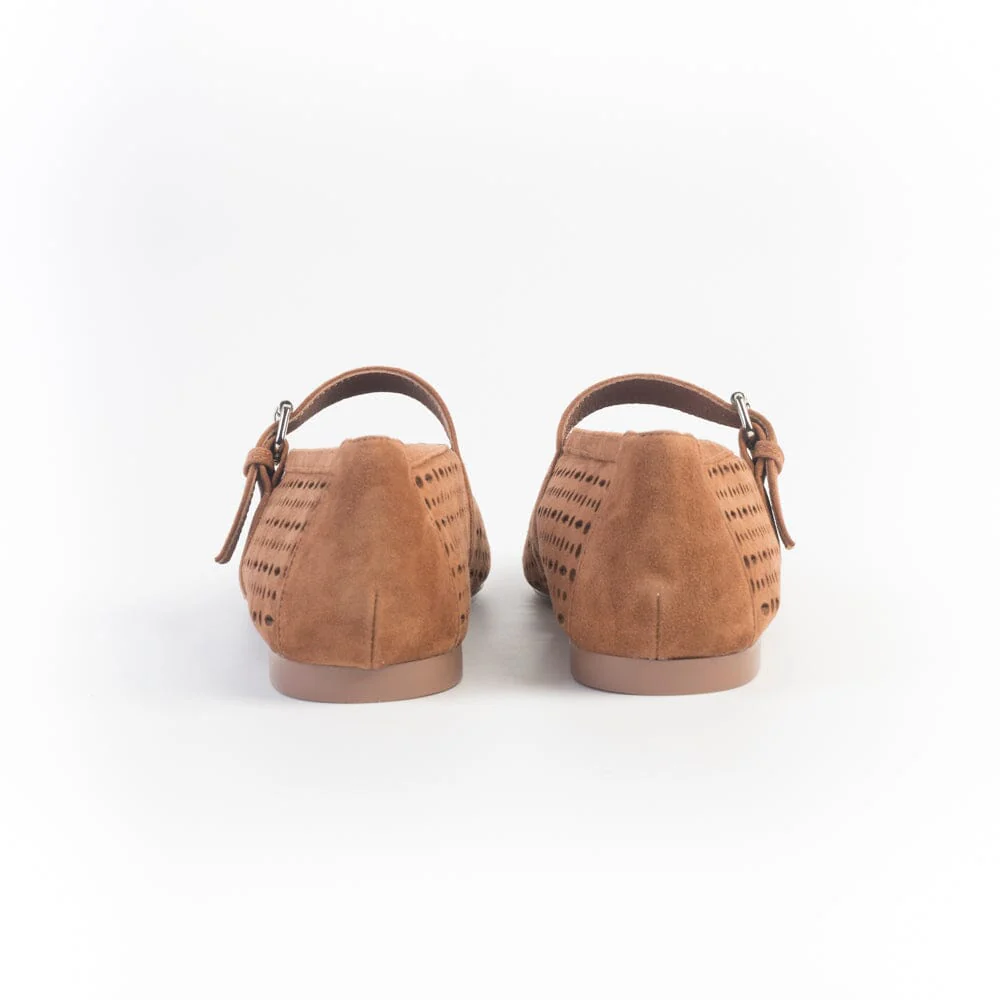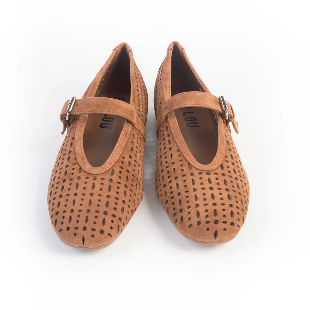 Mary Jane di Bibi Lou realizzate in camoscio traforato di colore cuoio. Chiusura con cinturino in camoscio sul collo del piede con fibbia regolabile. Sottopiede imbottito in pelle, suola cuoio con inserto in gomma.