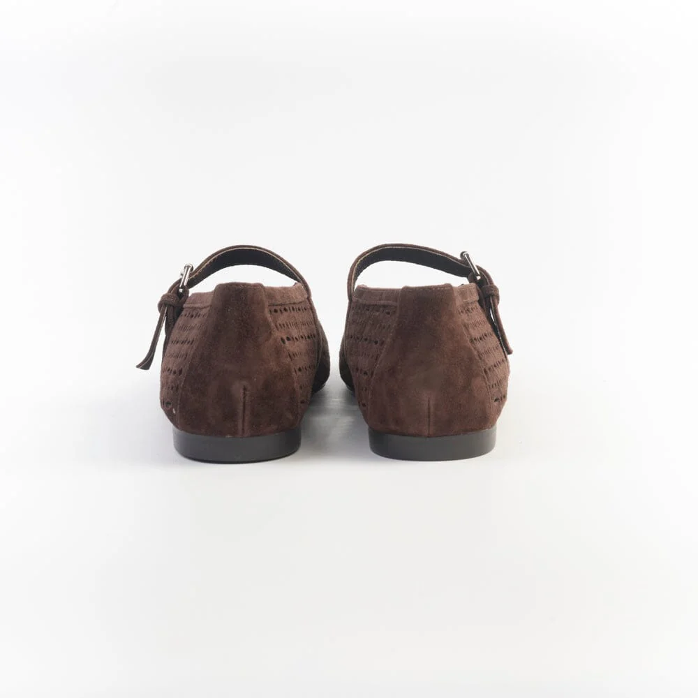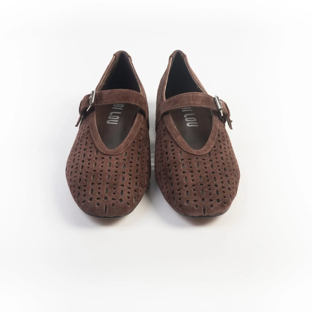 Mary Jane di Bibi Lou, realizzate in camoscio traforato di colore marrone. Chiusura con cinturino in camoscio sul collo del piede con fibbia regolabile. Sottopiede imbottito in pelle, suola cuoio con inserto in gomma.