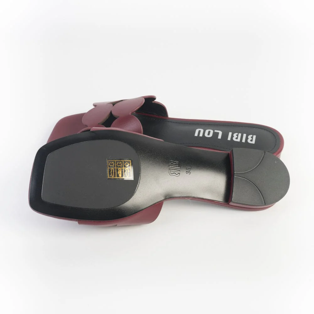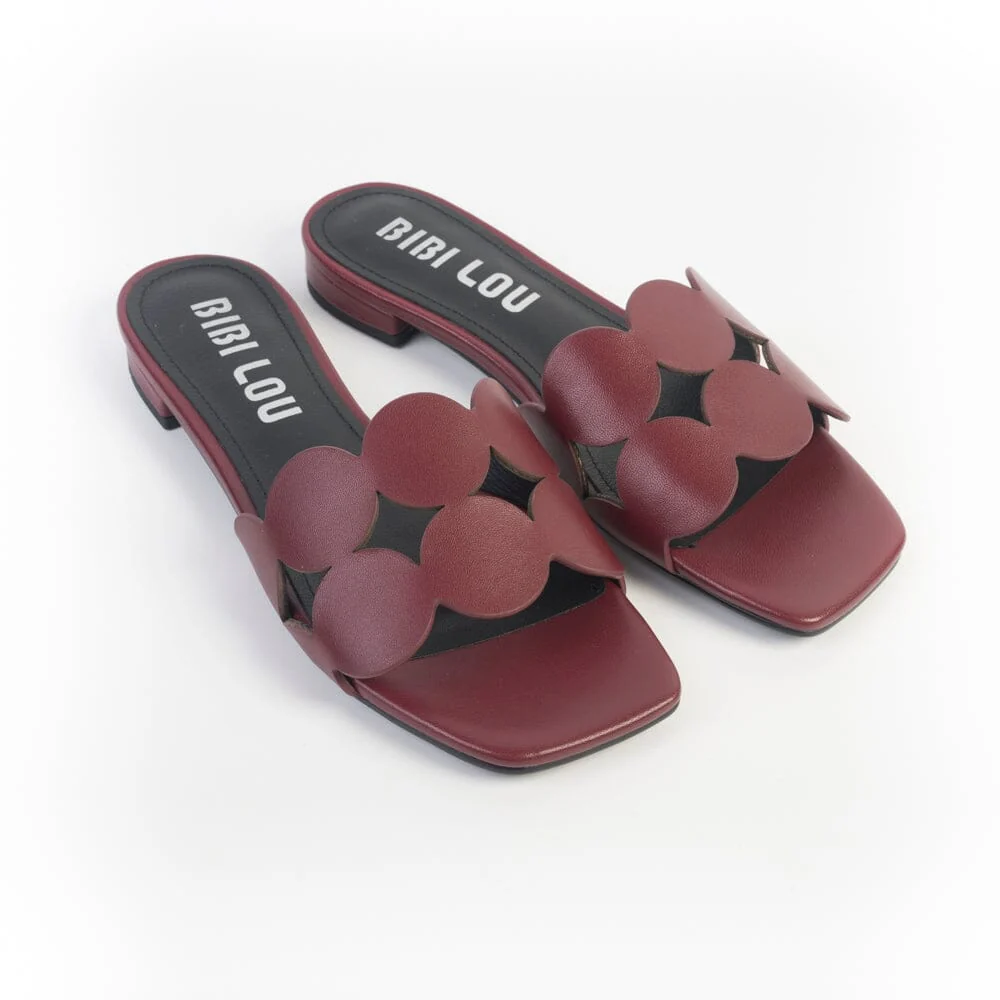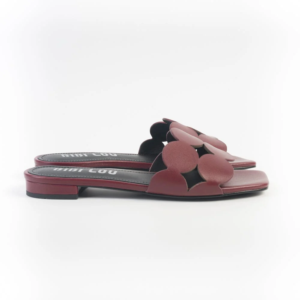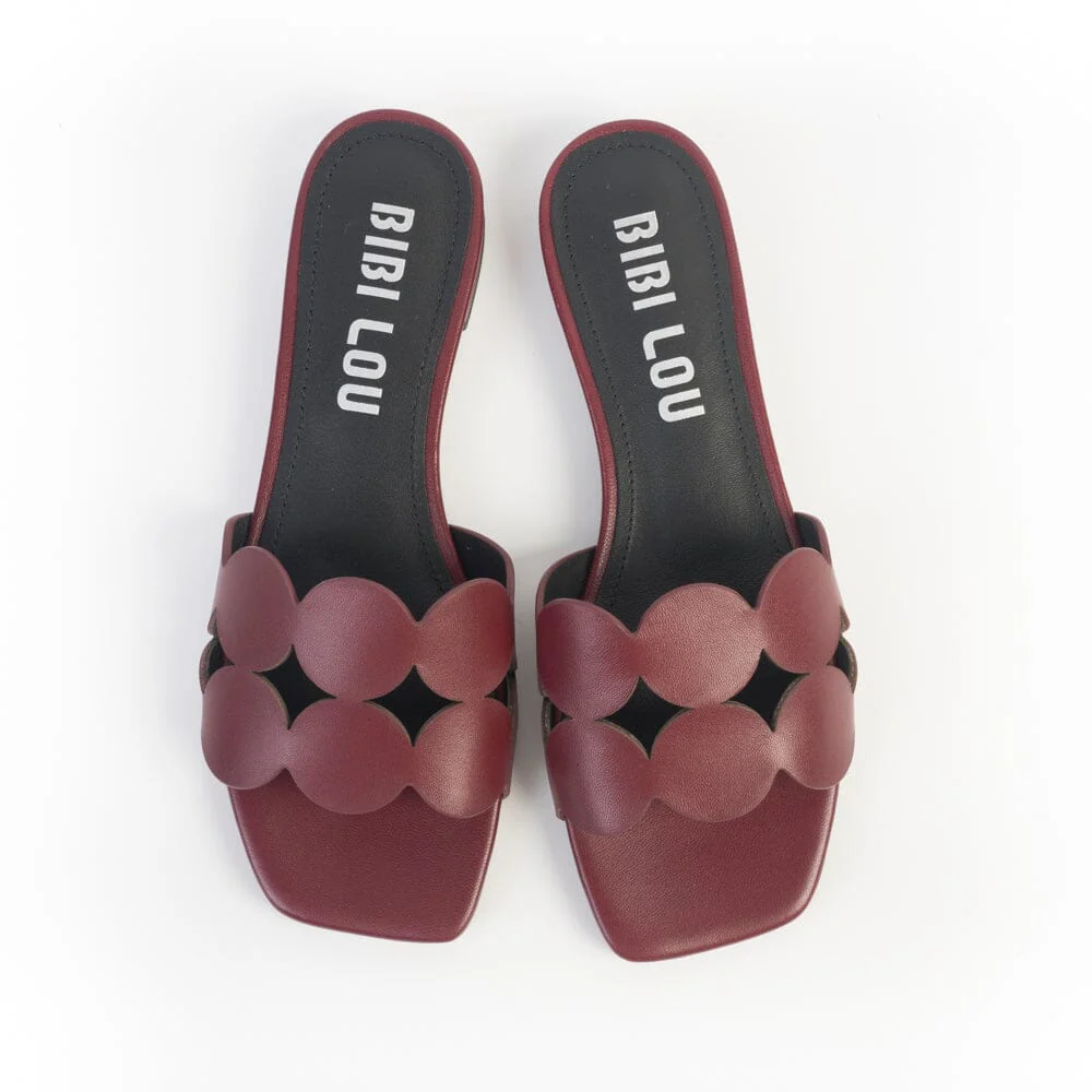 Mules di Bibi Lou a punta leggermente squadrata, realizzate in pelle di colore bordeaux. Doppia fascia su avampiede con disegno a cerchi. Sottopiede in pelle. Suola in cuoio con inserto in gomma e tacco di 2 cm. Calzata regolare.