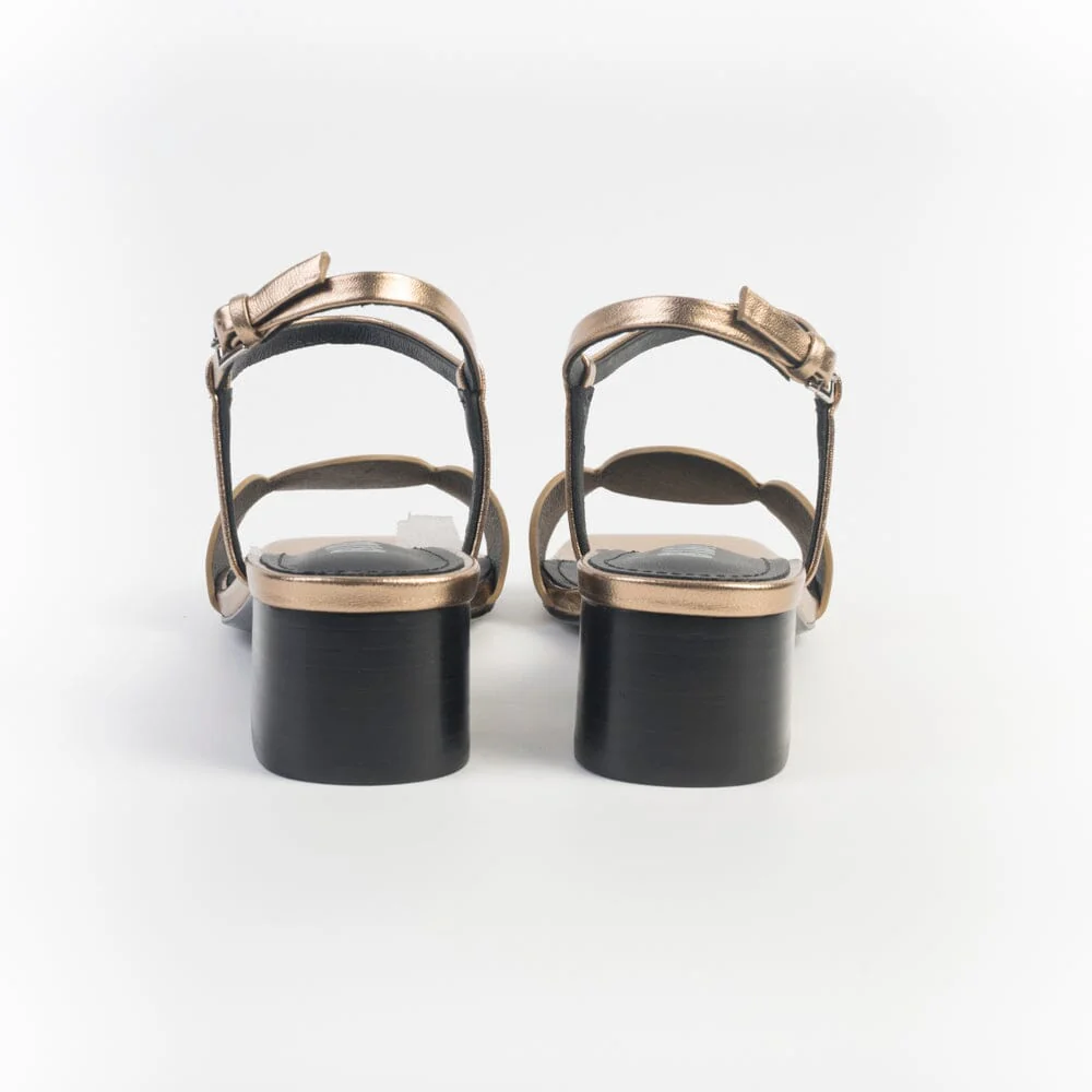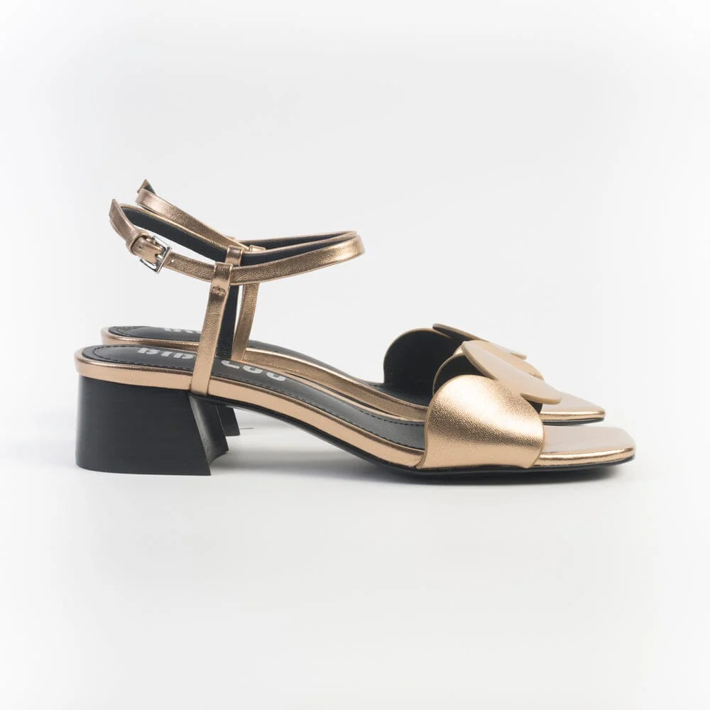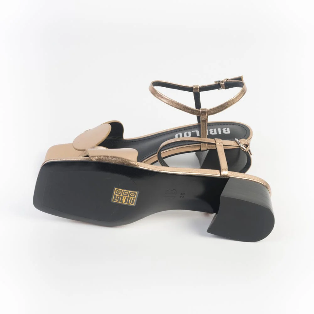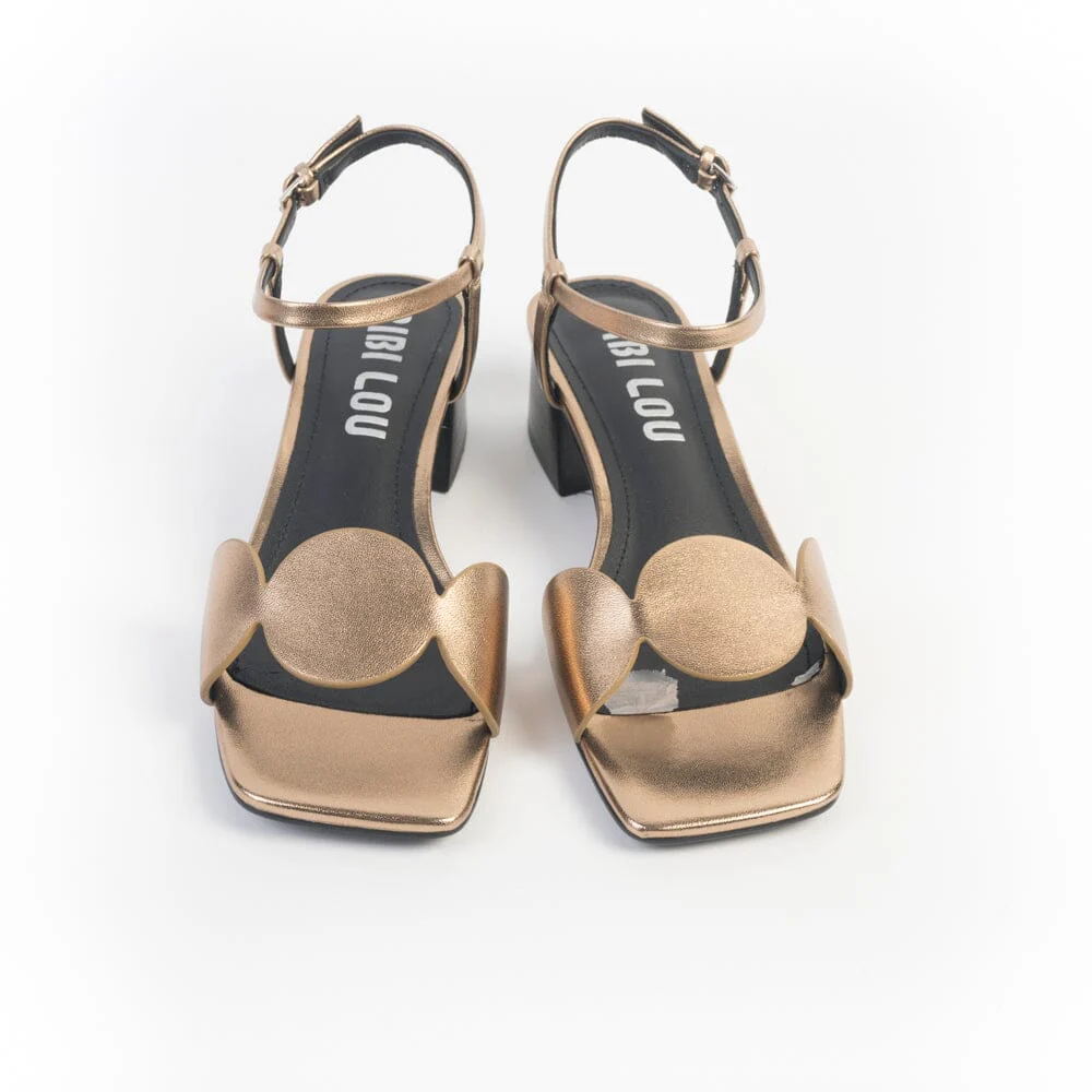 Sandali di Bibi Lou, realizzati in pelle laminata di colore bronzo con punta leggermente squadrata. Decorazione con fascia a cerchi sull’avampiede e cinturino regolabile alla caviglia. Sottopiede in pelle, tacco colonna di cm 4 circa. Suola in cuoio con inserto in gomma.