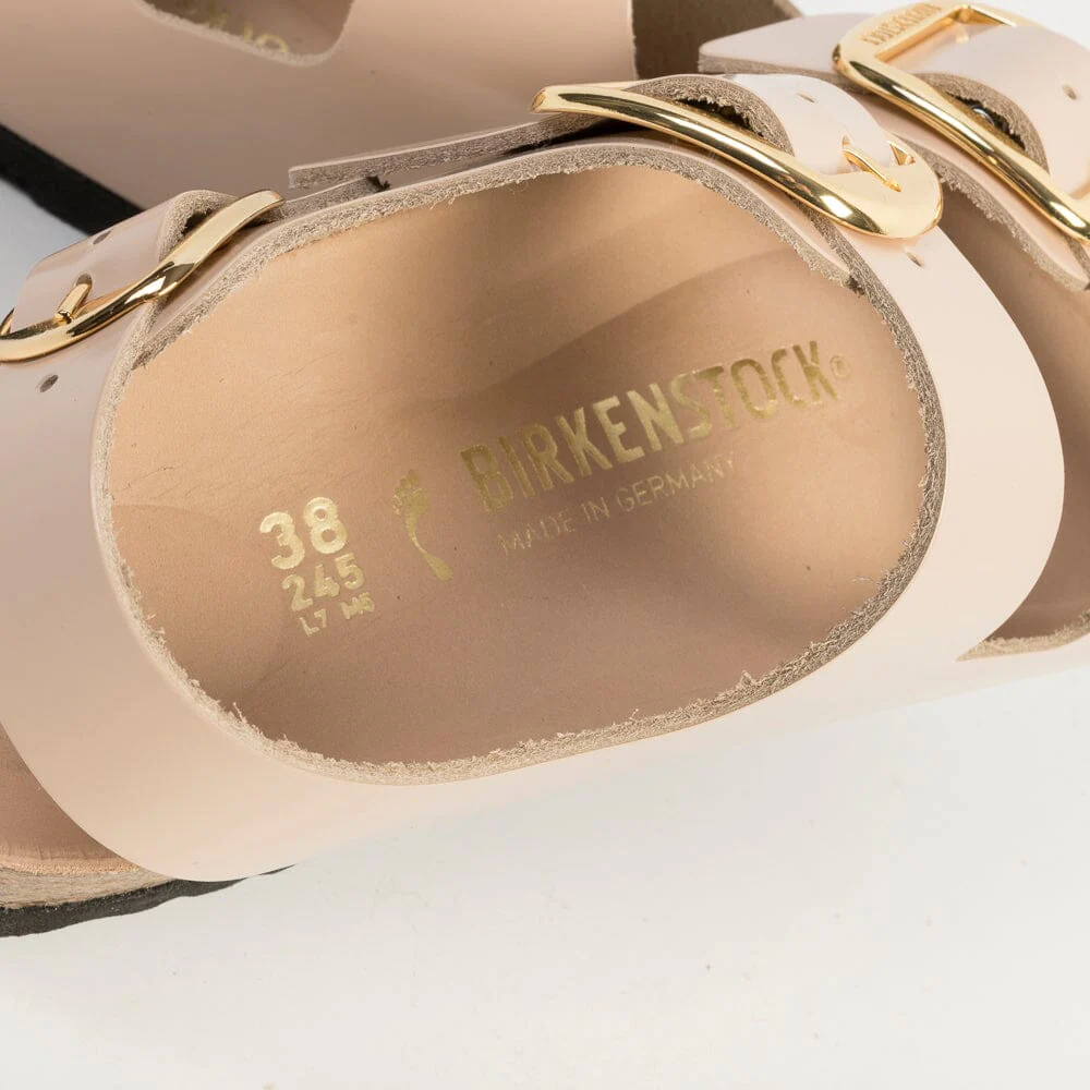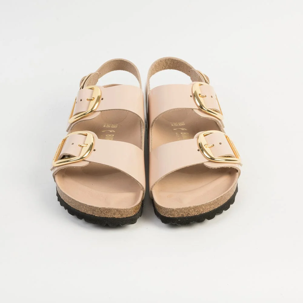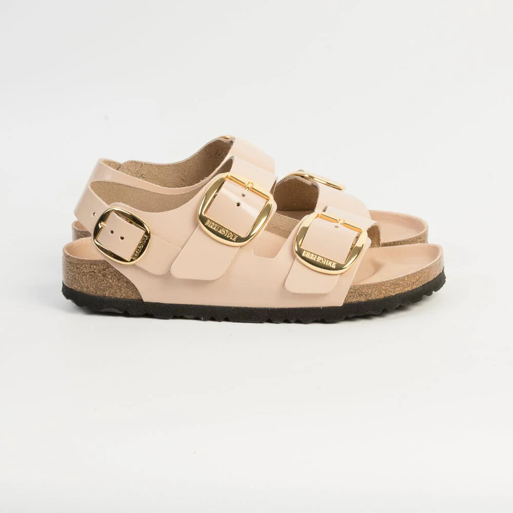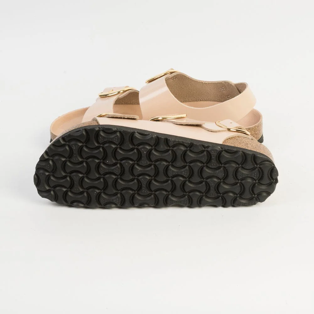 Iconico sandalo di Birkenstock modello Milano, realizzato in pelle verniciata di colore nudo con doppia fibbia dorata. Plantare dalla forma anatomica in pelle. Suola in EVA di colore nero.