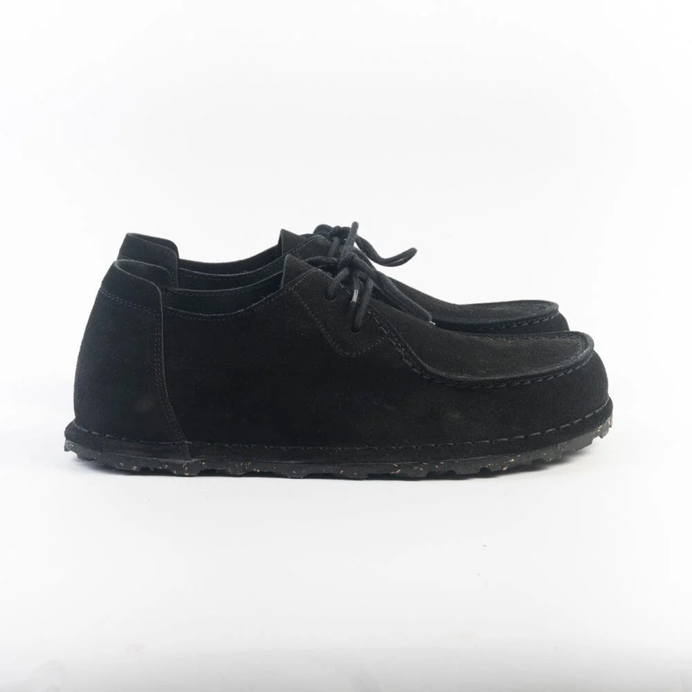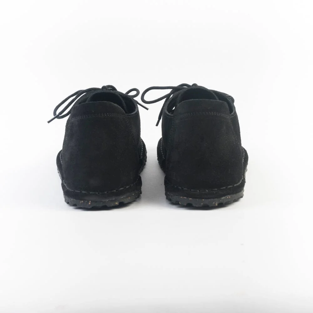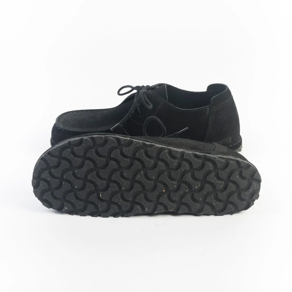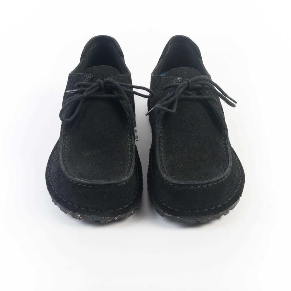 Scarpa unisex allacciata Birkenstock, in camoscio di colore nero. Cucitura in rilievo su tomaia. Interno della scarpa completamente sfoderato e rustico. Soletto interno estraibile e anatomico, suola in EVA.