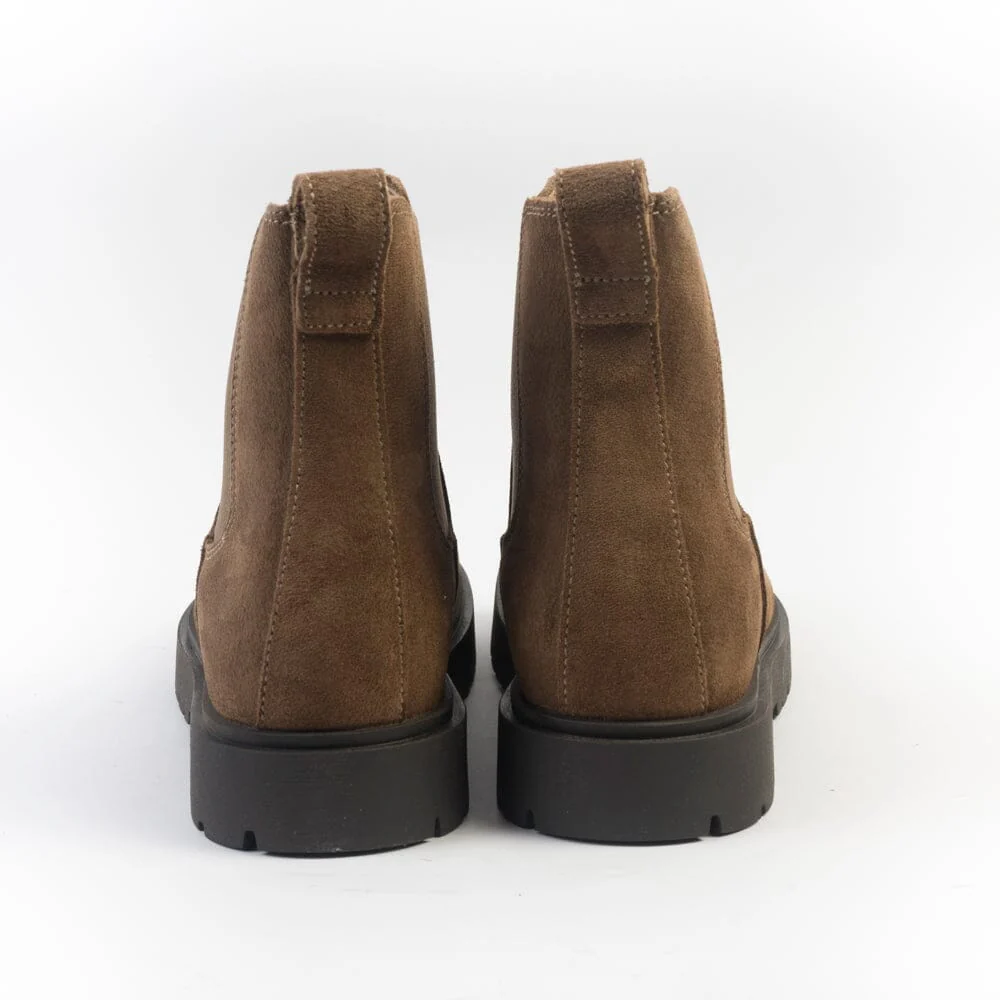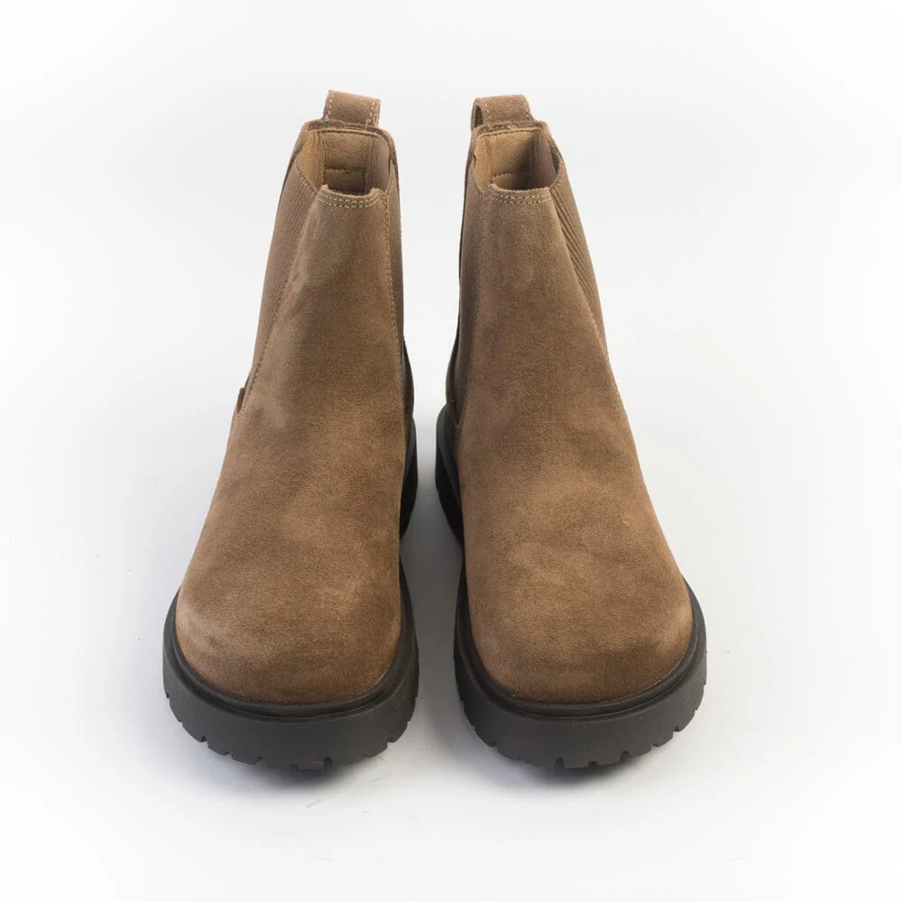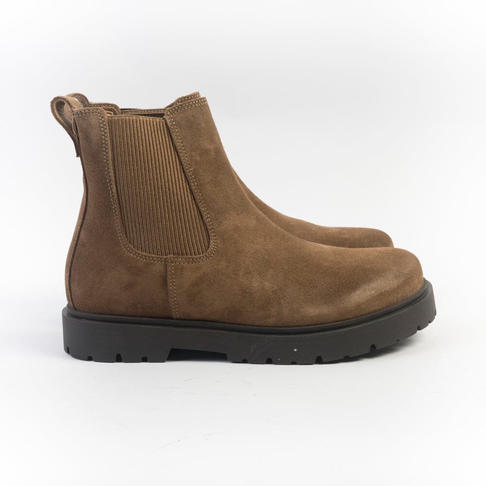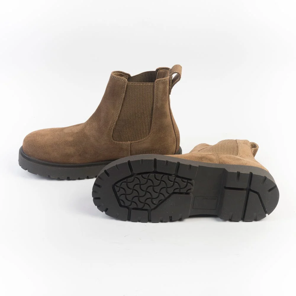 Stivaletto beatles Highwood di Birkenstock realizzato in camoscio di colore cuoio con elastici ai lati in nuance per facilitare la calzata. Plantare estraibile dalla forma anatomica. Suola in gomma di 2 cm.