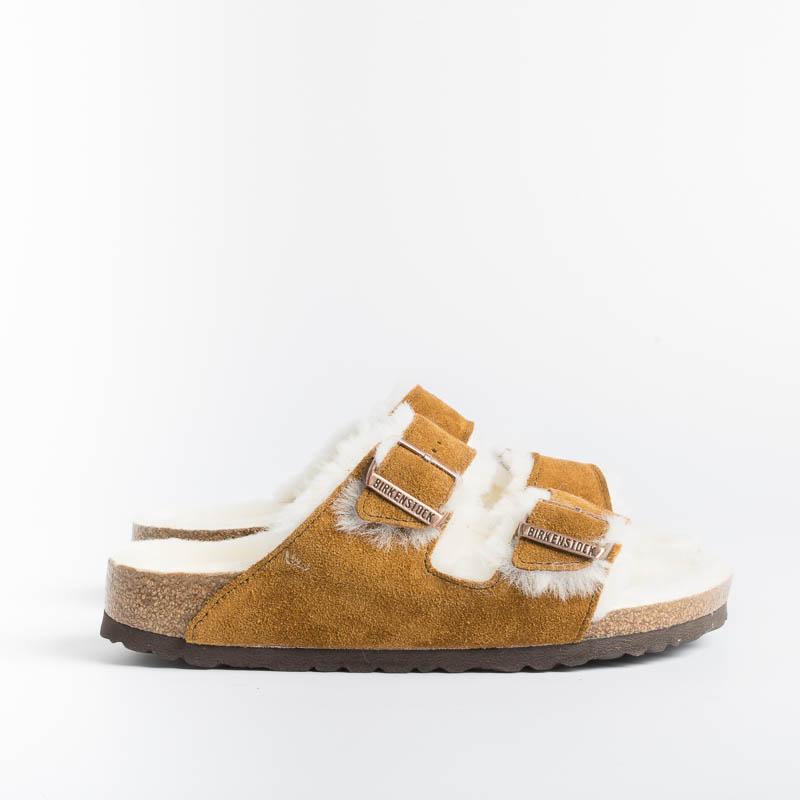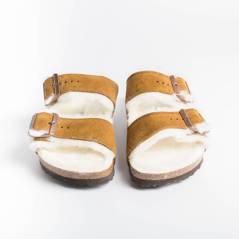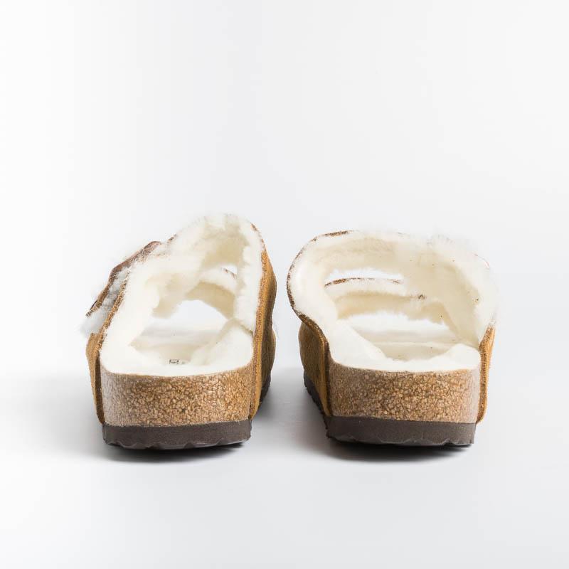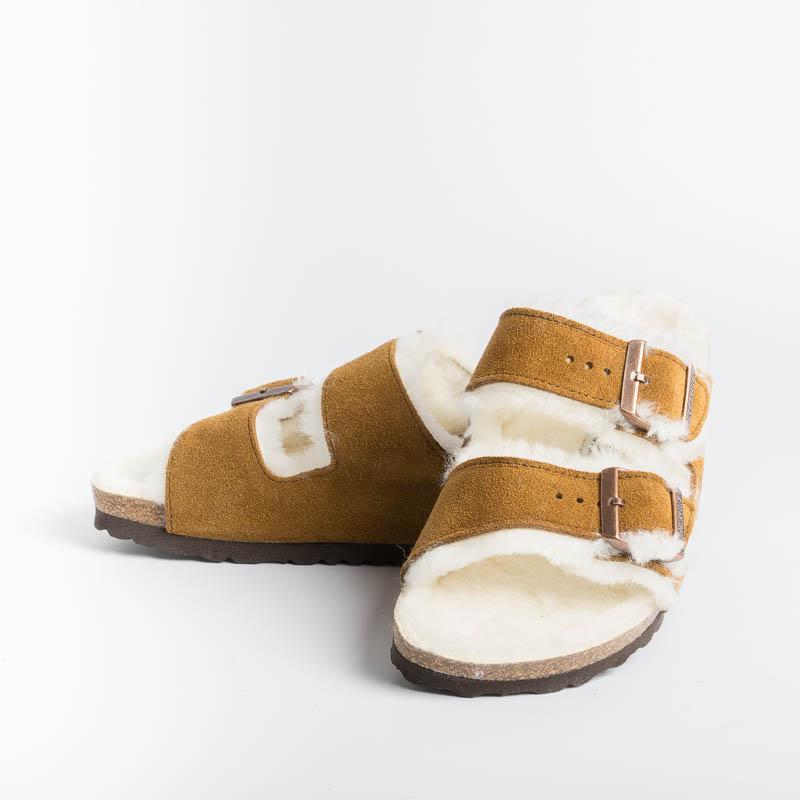 Sandalo Arizona con doppia fibbia regolabile in morbida pelle scamosciata di colore cuoio, internamente rivestito in montone di colore bianco. Plantare dalla forma anatomica e suola in EVA.