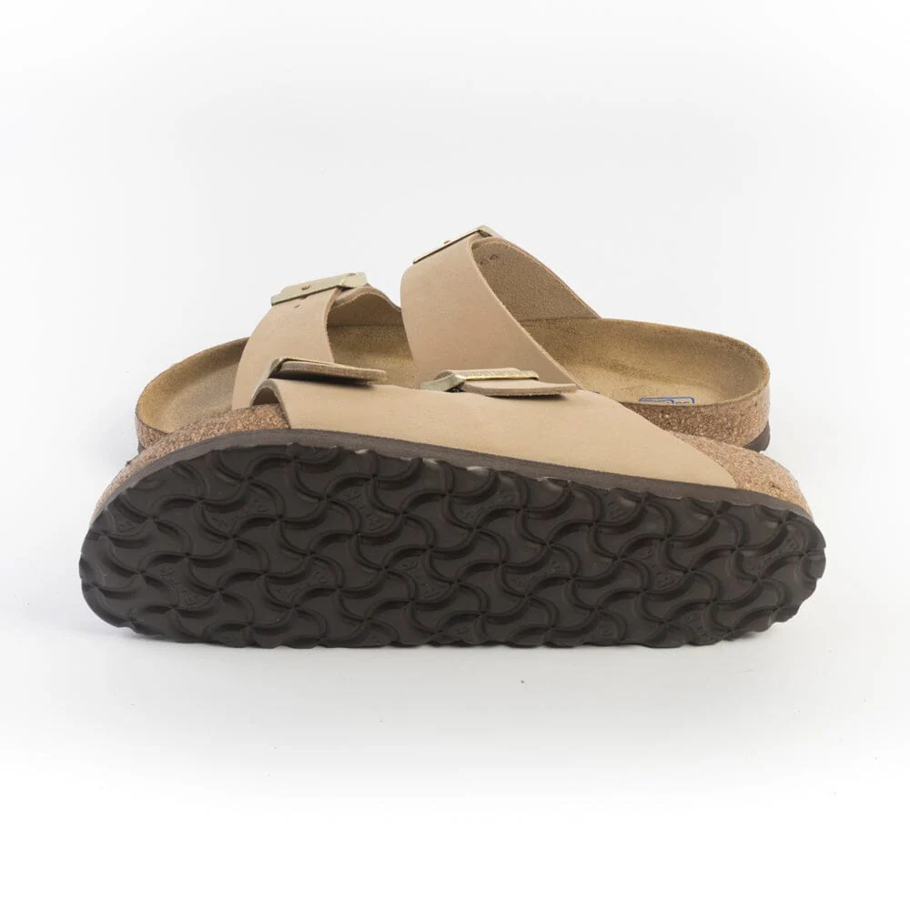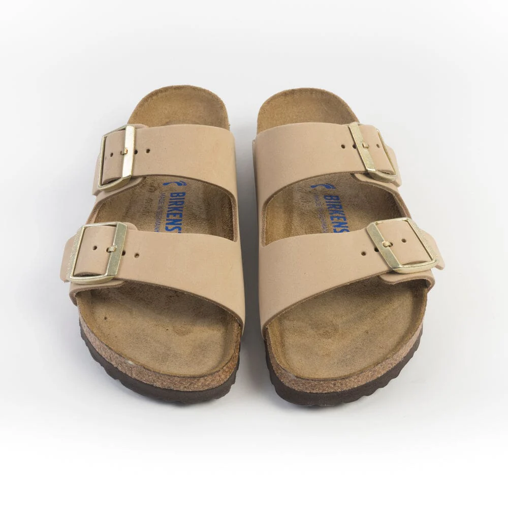 Sandalo Arizona con doppia fibbia regolabile, realizzato in morbido nabuk di colore sabbia. Plantare dalla forma anatomica in camoscio. Suola in EVA.