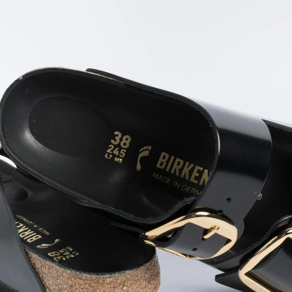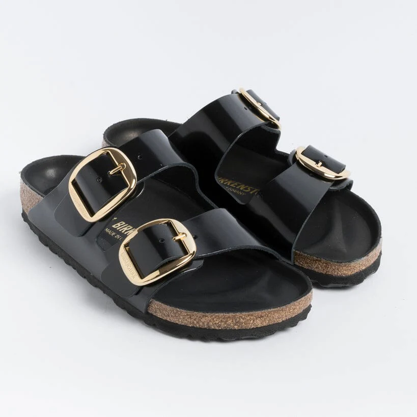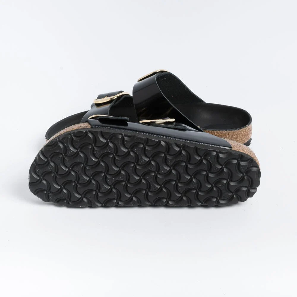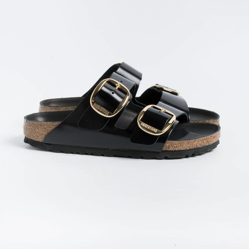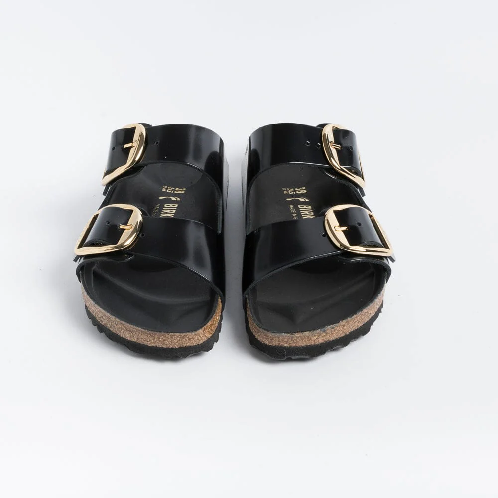 Iconico sandalo Arizona di Birkenstock con doppia fibbia colore oro, regolabile, realizzato in pelle spazzolata lucida di colore nero. Plantare dalla forma anatomica in pelle. Suola in EVA. Calzata stretta.