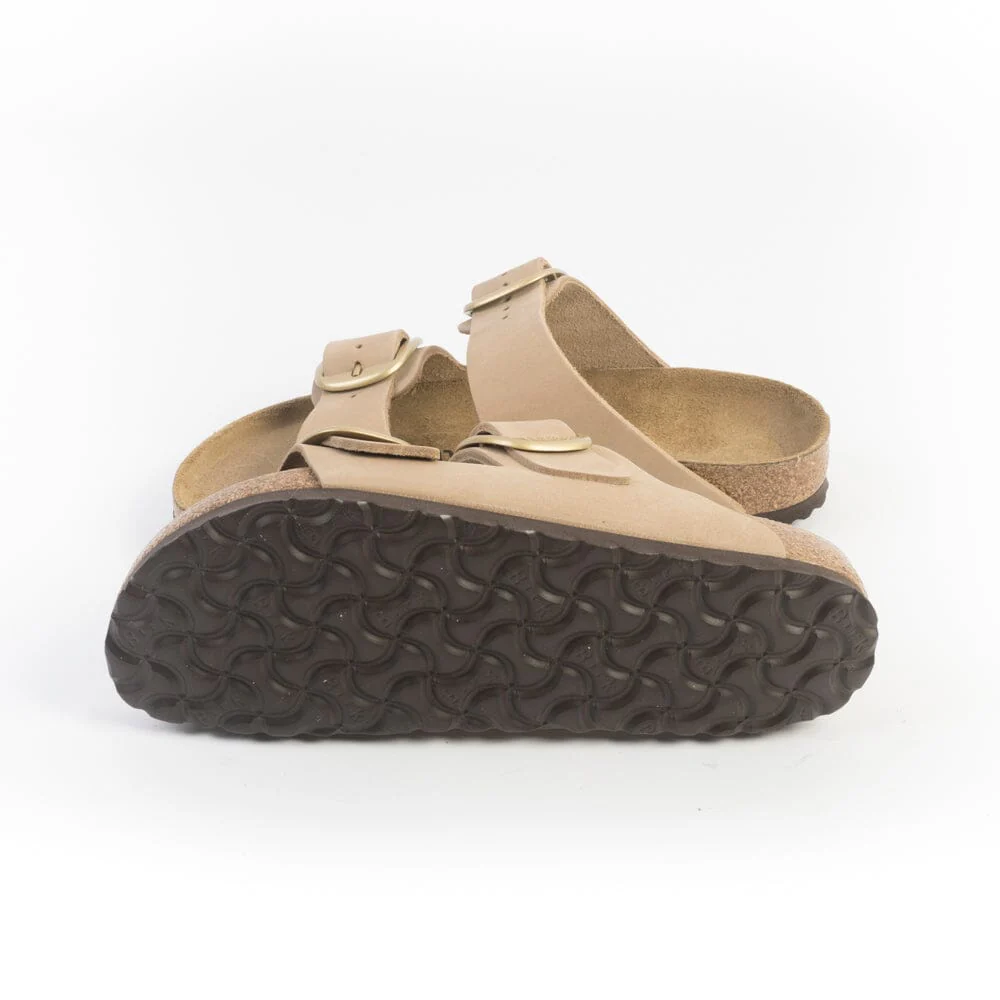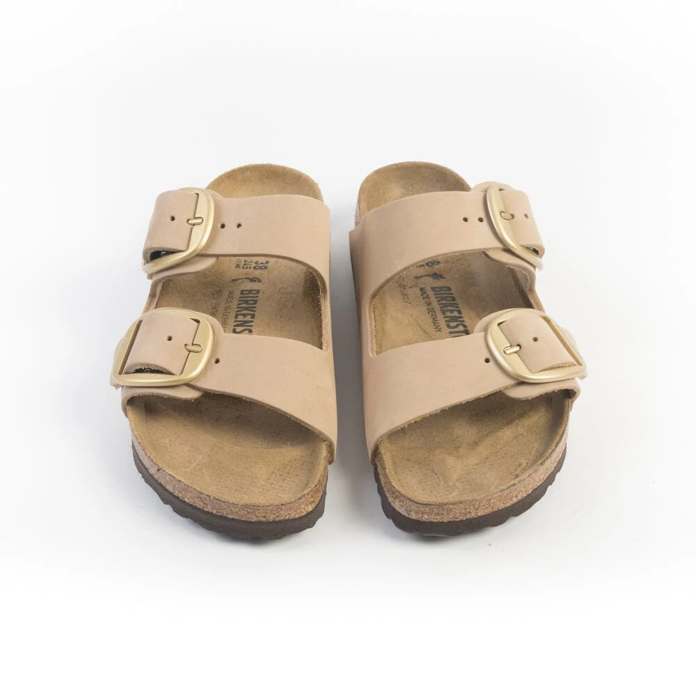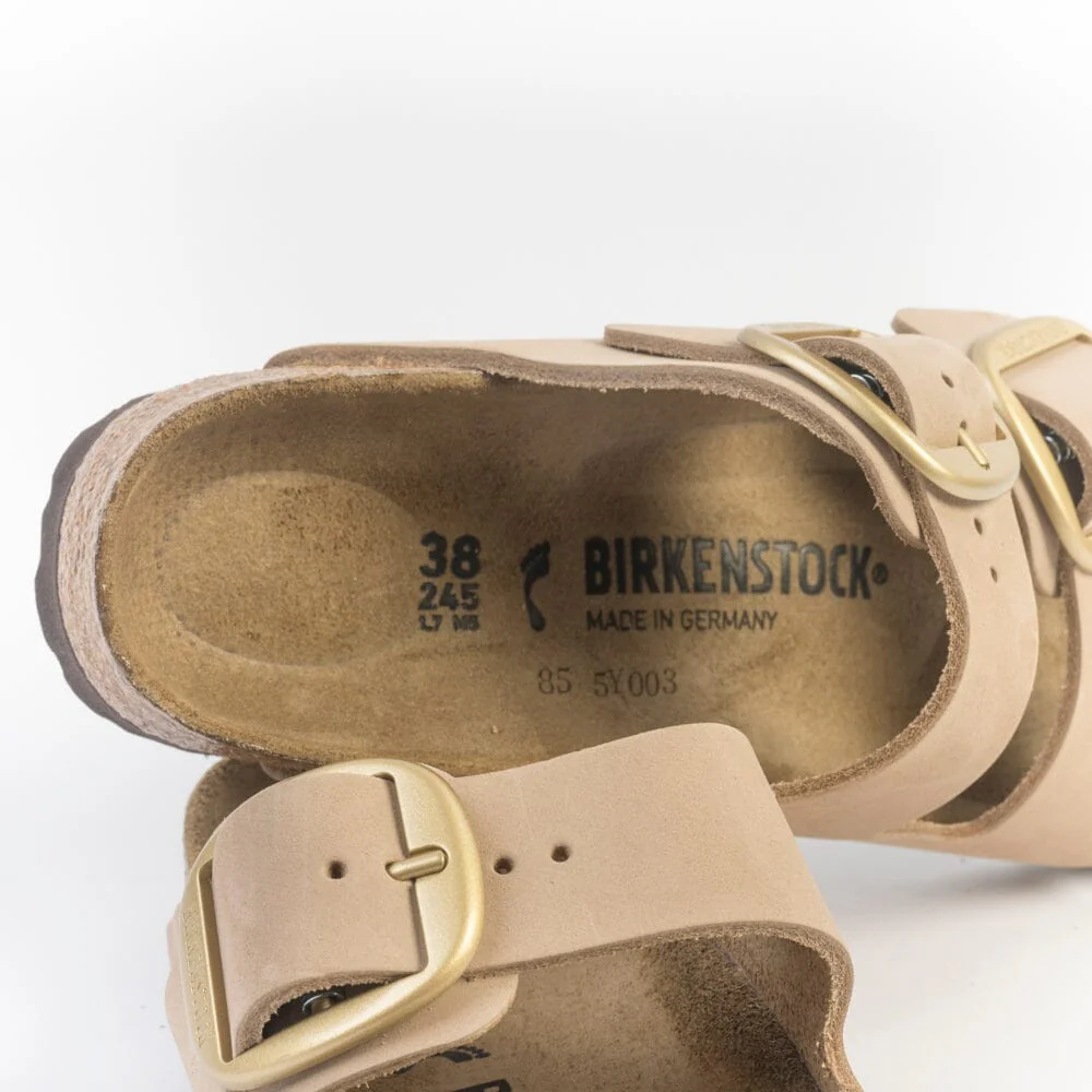 Sandalo Iconico Arizona di Birkenstock con doppia fibbia regolabile di colore oro, realizzato in nabuk pelle di colore sabbia. Plantare dalla forma anatomica in camoscio. Suola in EVA.