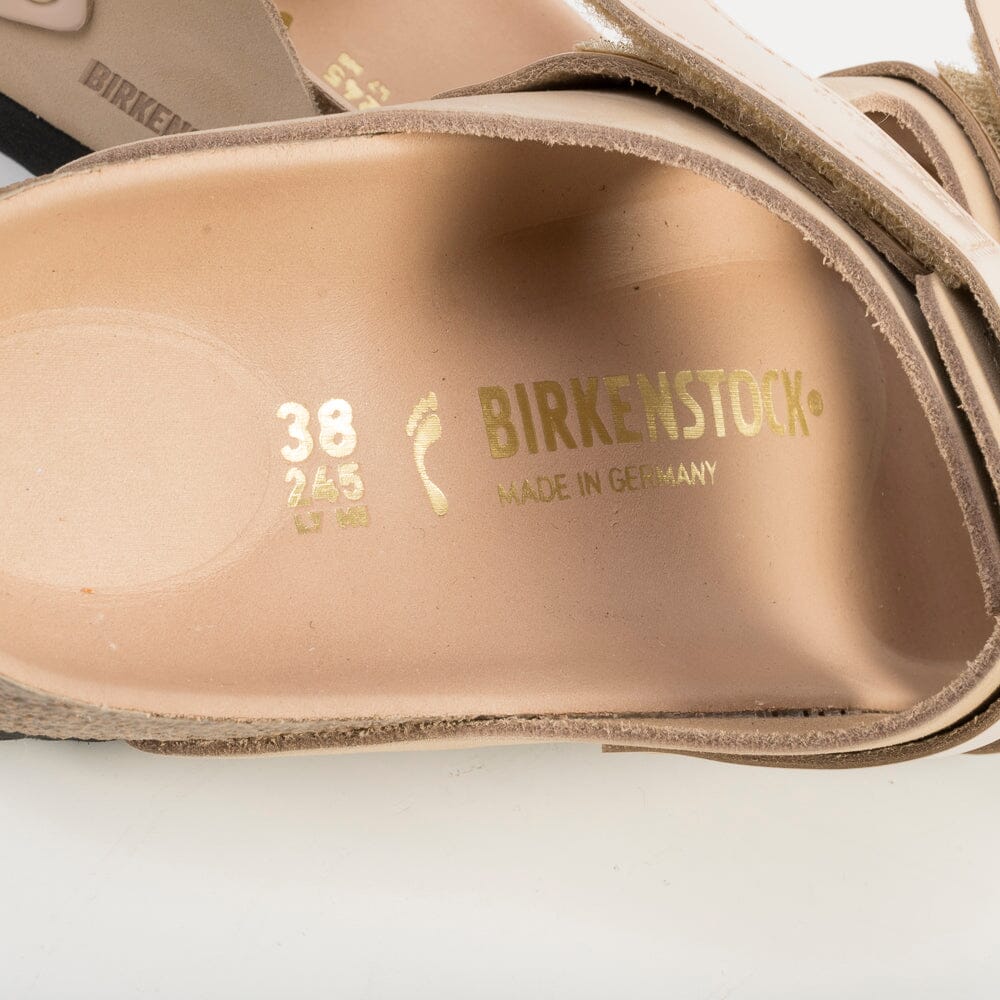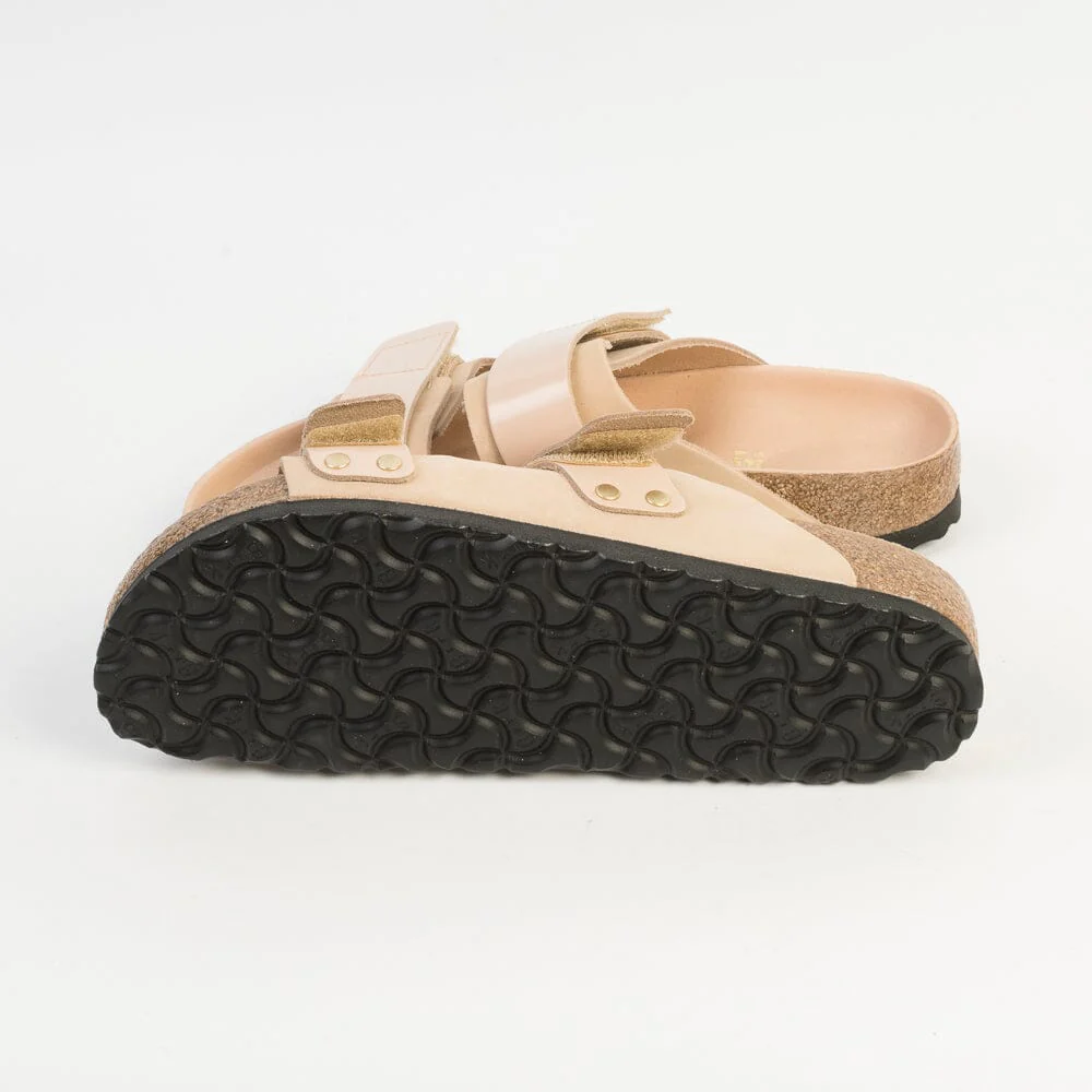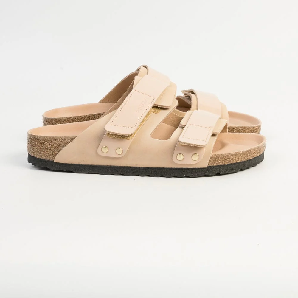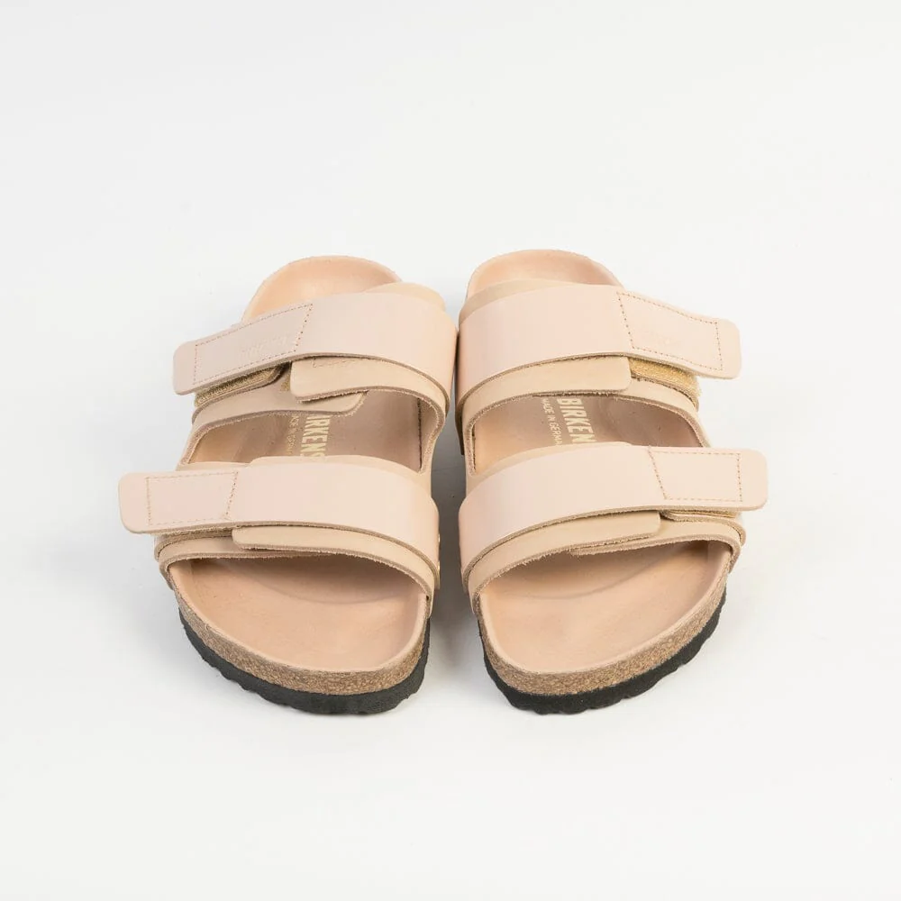 Nuovo Modello Uji di Birkenstock, realizzato in pelle semilucida di colore nudo. Chiusura con doppio strap in nuance. Plantare dalla forma anatomica in sughero e lattice. Suola in EVA.