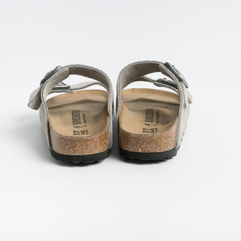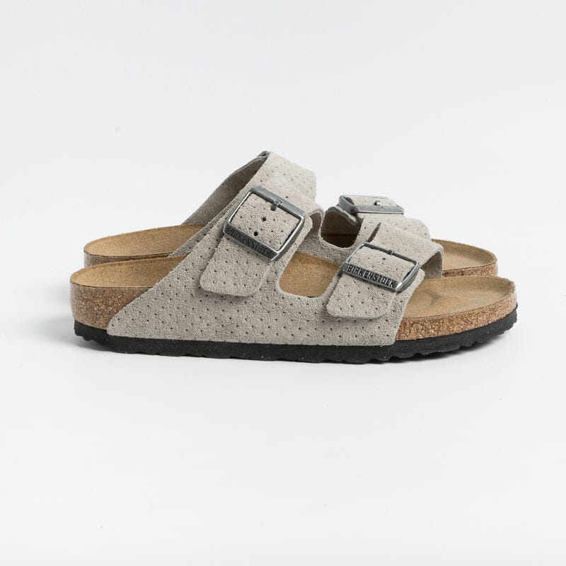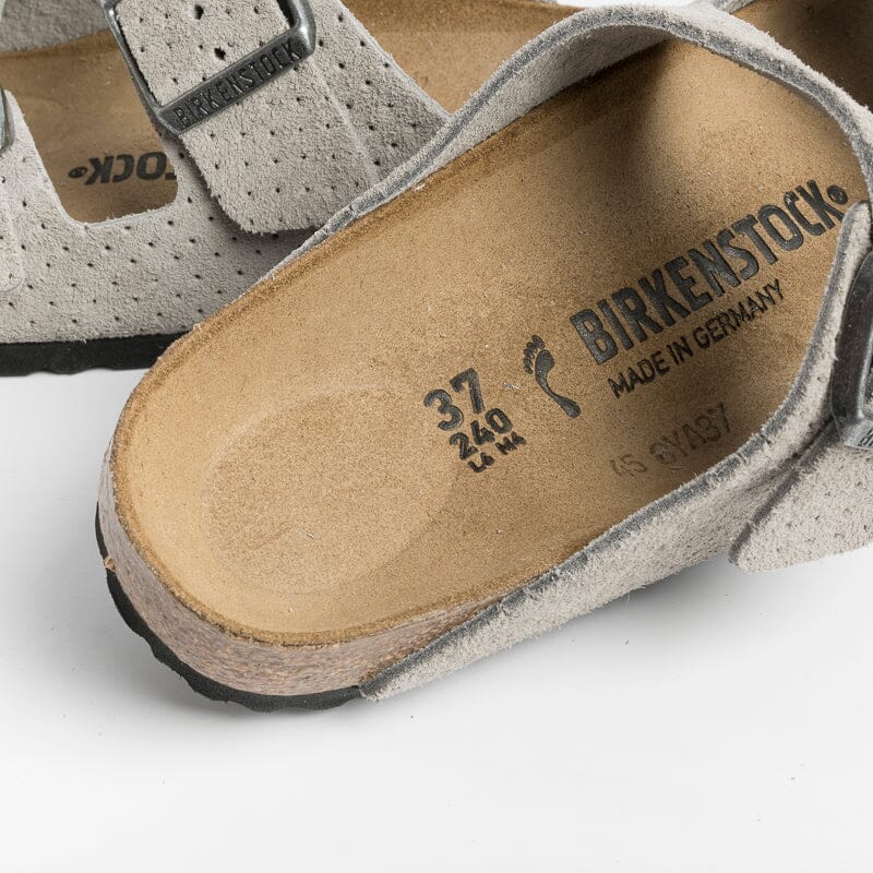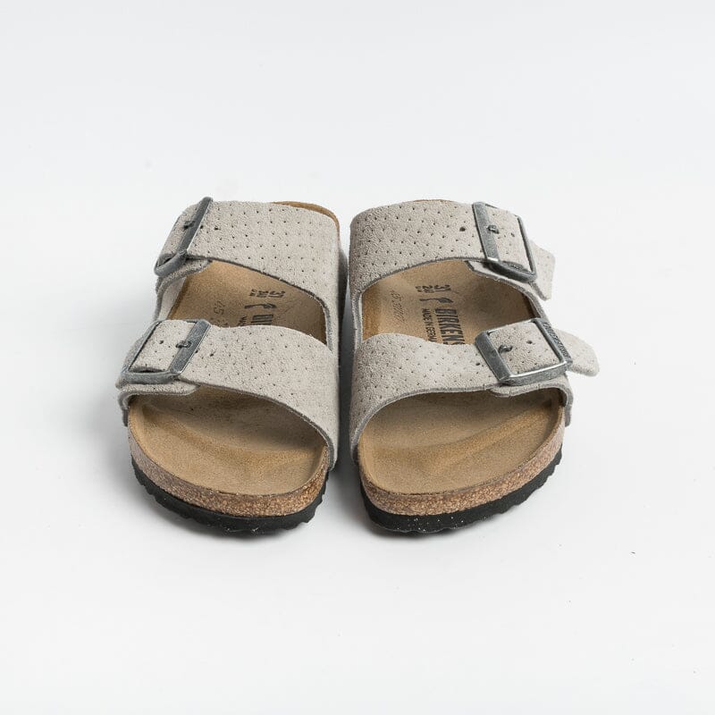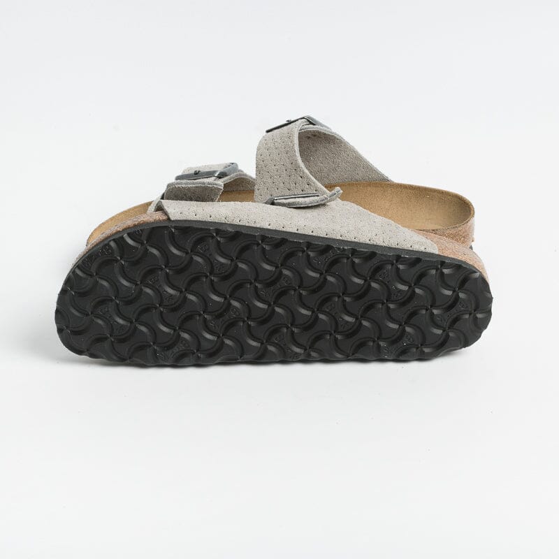 Sandalo Arizona con doppia fibbia regolabile, realizzato in camoscio traforato di colore grigio. Plantare dalla forma anatomica in camoscio. Suola in EVA.