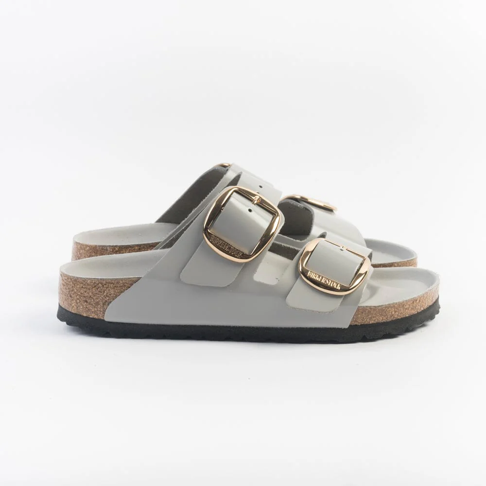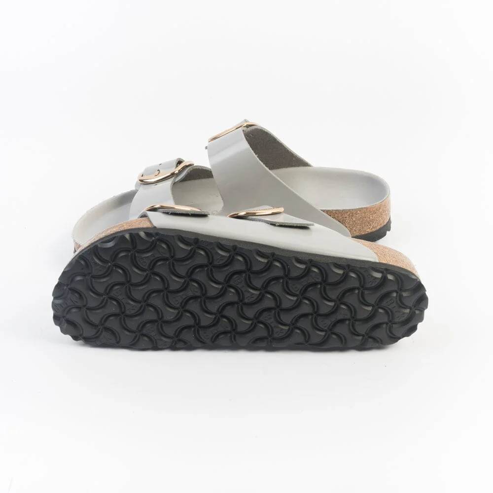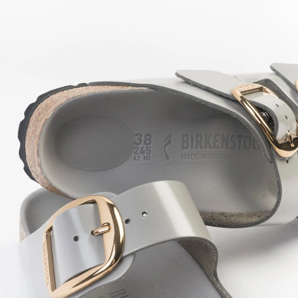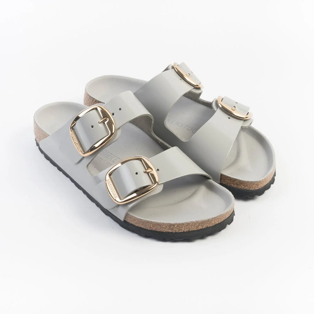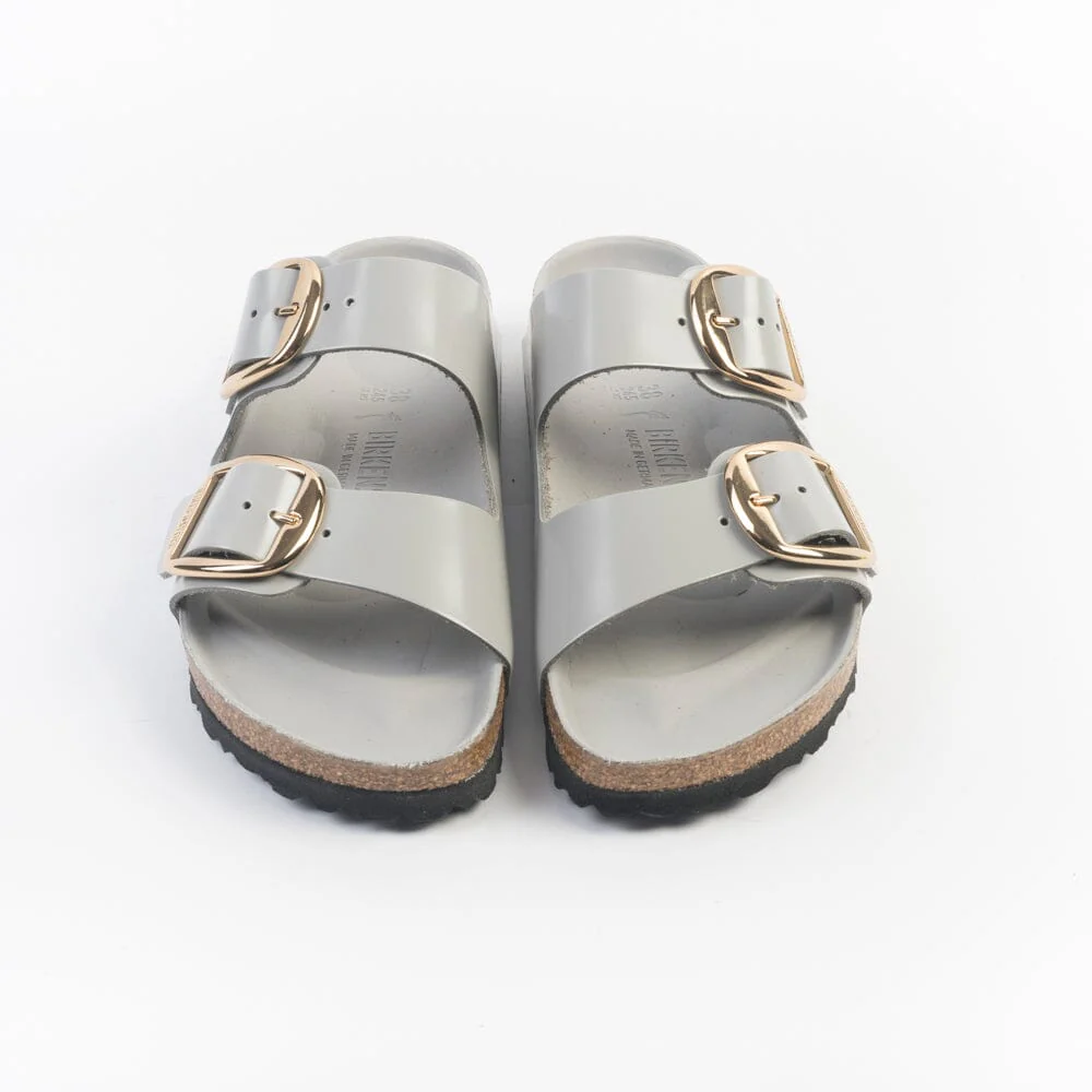 Sandalo Iconico Arizona di Birkenstock con doppia fibbia regolabile di colore oro lucido, realizzato in pelle lucida, abrasivata di colore grigio. Plantare in pelle, dalla forma anatomica, sottopiede in sughero. Suola in gomma nera.
