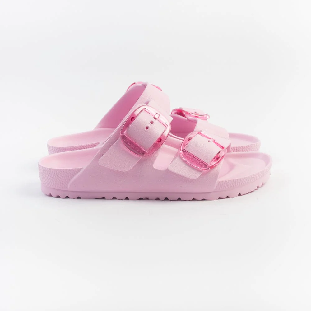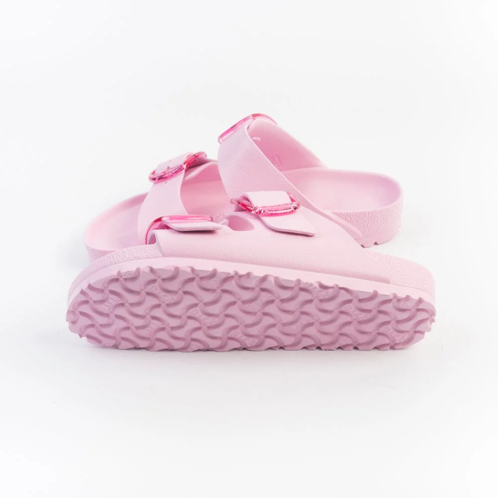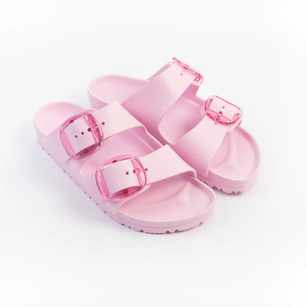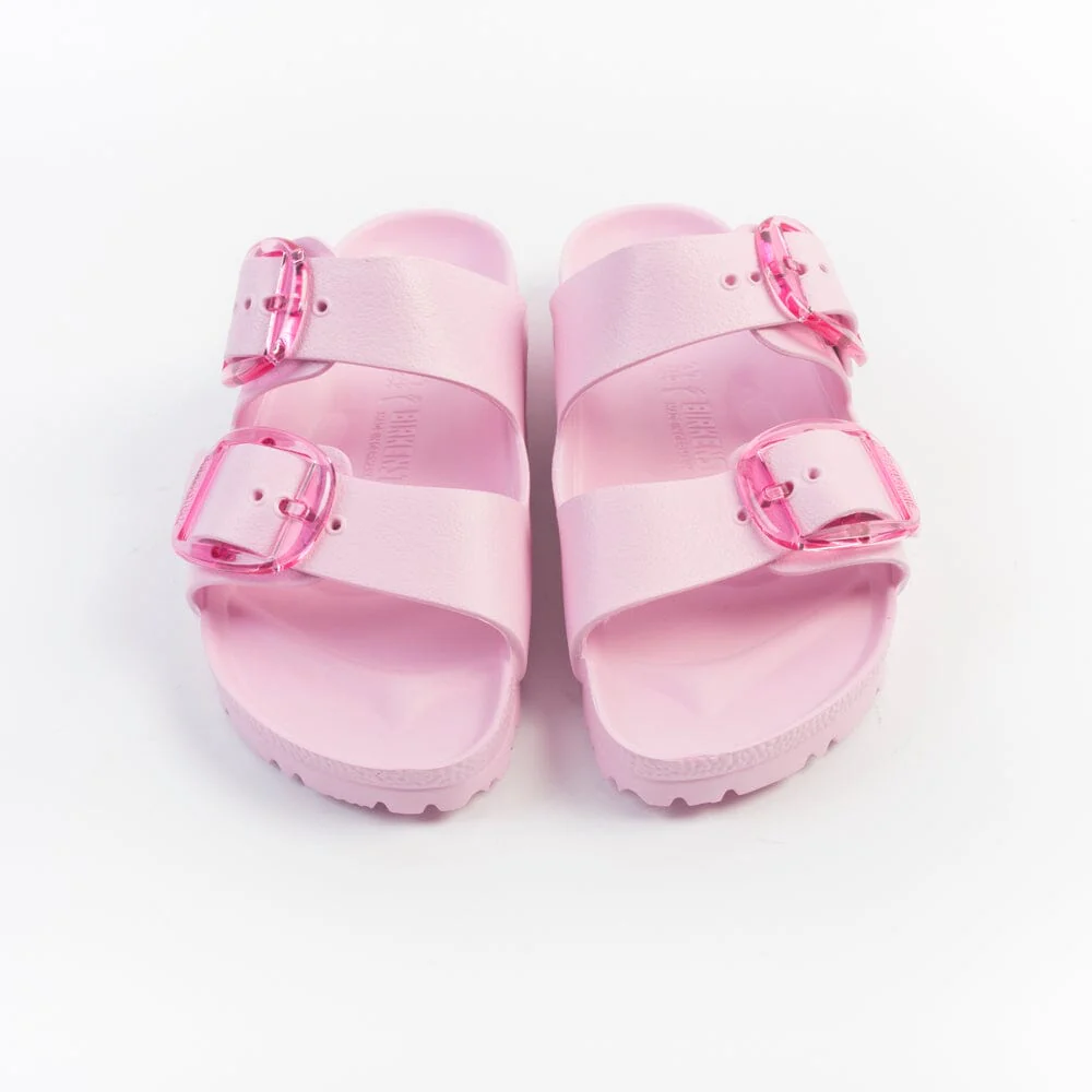 Sandalo Arizona di Birkenstock con doppia fibbia regolabile in pvc rosa trasparente, realizzato in EVA di colore rosa. Realizzate in Germania.