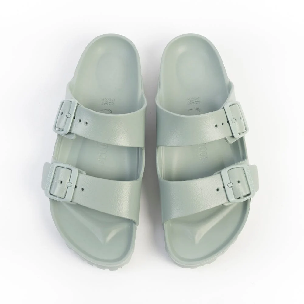 Iconico sandalo Arizona di Birkenstock con doppia fibbia regolabile, realizzato in EVA di colore verde salvia. Realizzate in Germania.