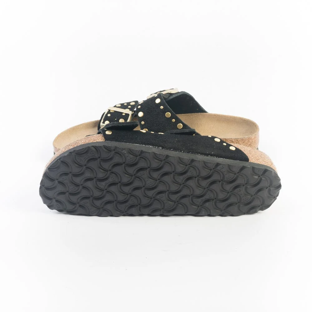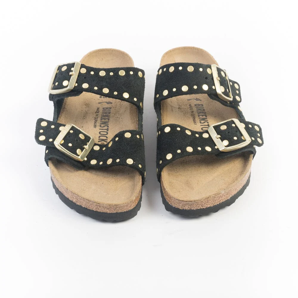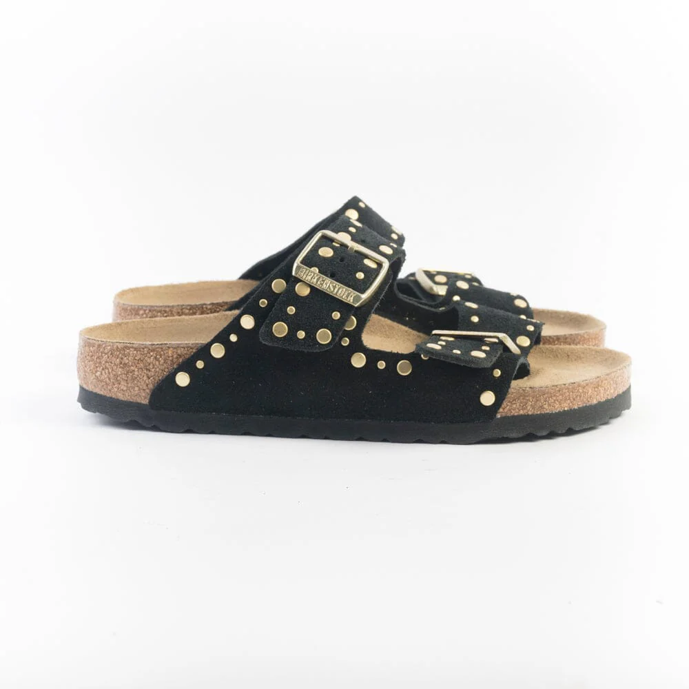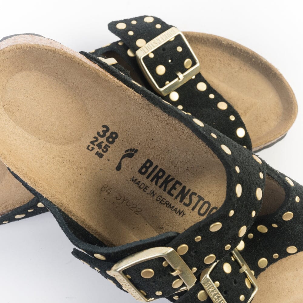 Sandalo Arizona di Birkenstock con doppia fibbia regolabile, realizzato in morbido camoscio di colore nero e applicazione di rivetti di metallo dorato opaco. Plantare ergonomico in sughero. Suola in EVA.