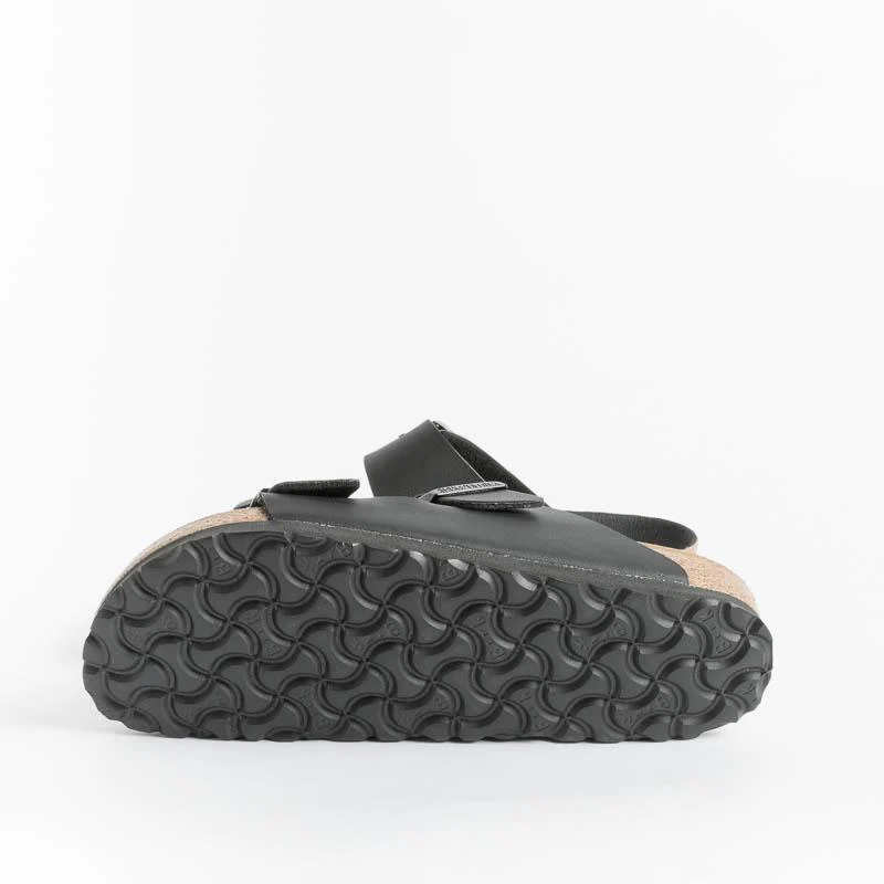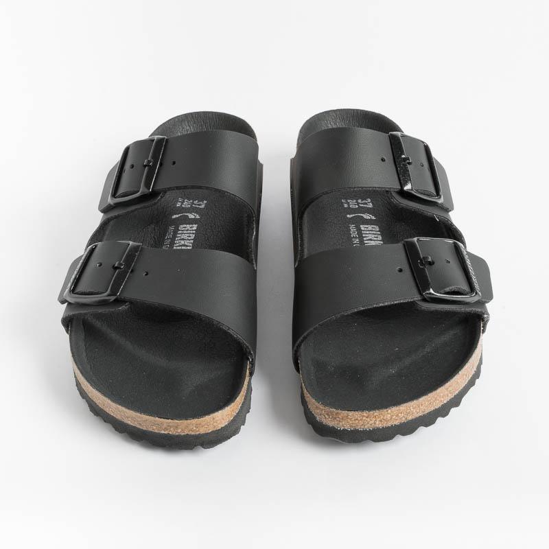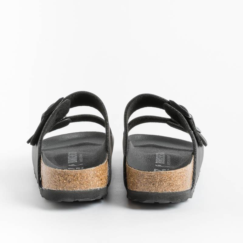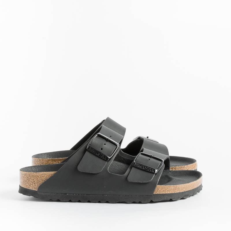 Iconico sandalo Arizona di Birkenstock con doppia fibbia regolabile in Birko flor (materiale sintetico dermocompatibile) di colore nero. Plantare dalla forma anatomica in sughero, sottopiede in microfibra e suola in EVA. Calzata stretta.
