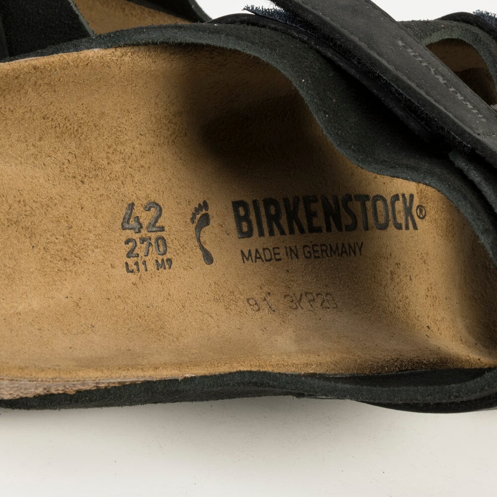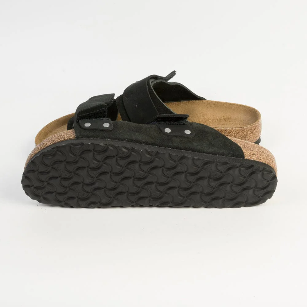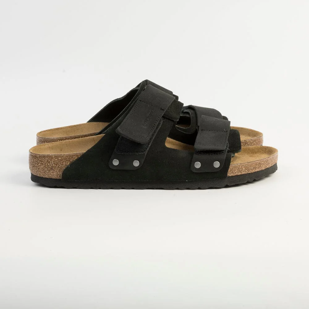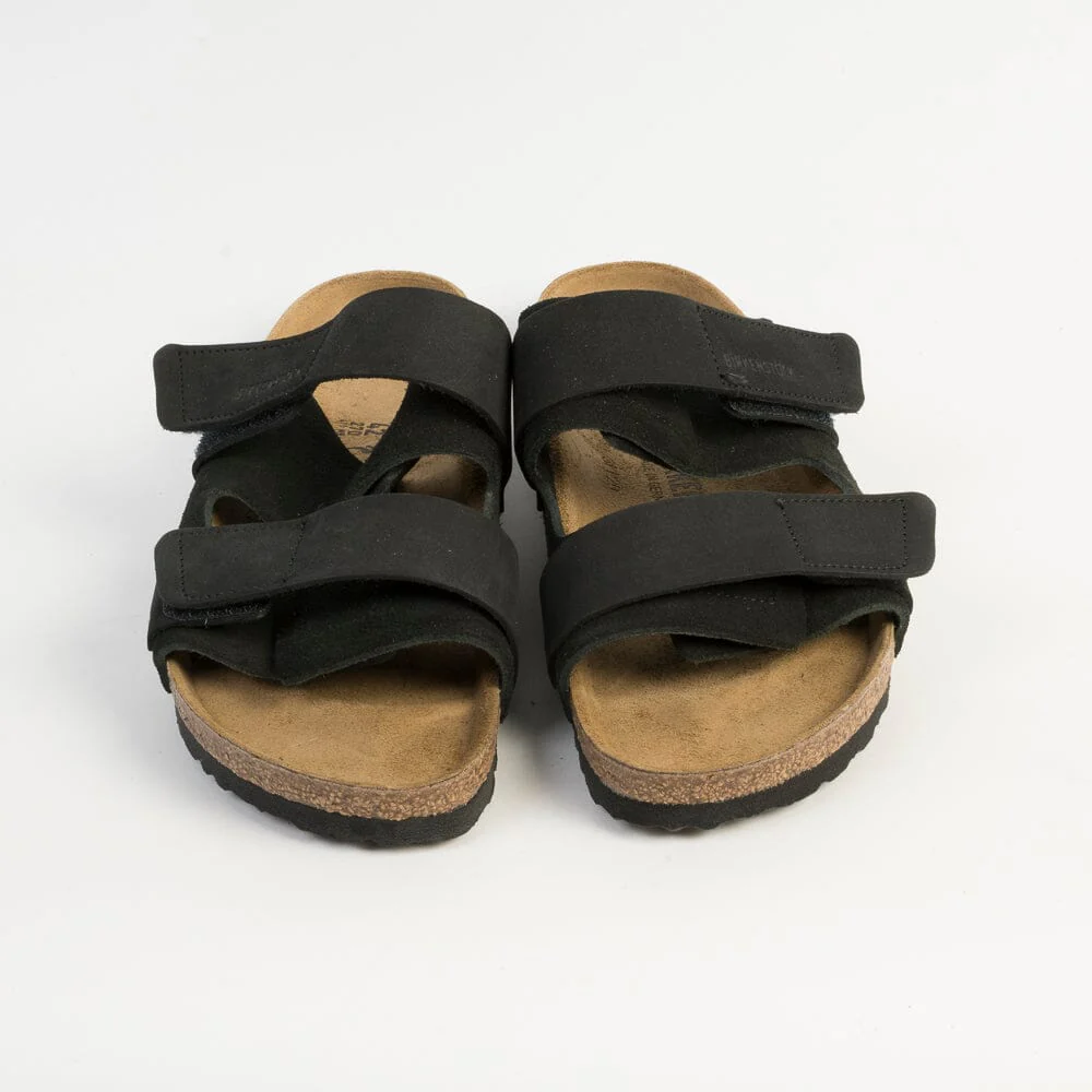 Nuovo Modello Uji di Birkenstock, realizzato in pelle scamosciata di colore nero. Chiusura con doppio strap in nabuk in nuance. Plantare dalla forma anatomica in sughero e lattice. Suola in EVA.