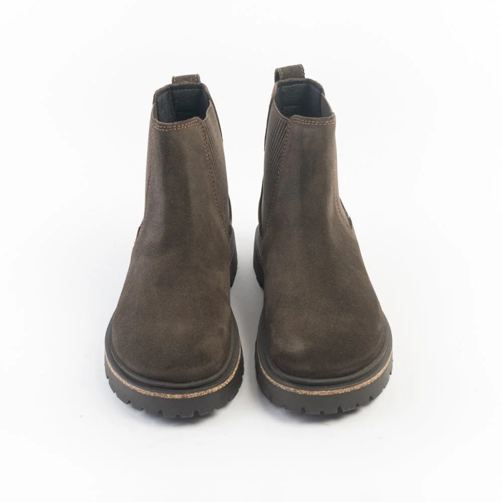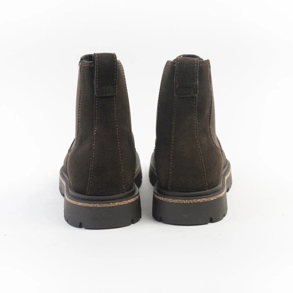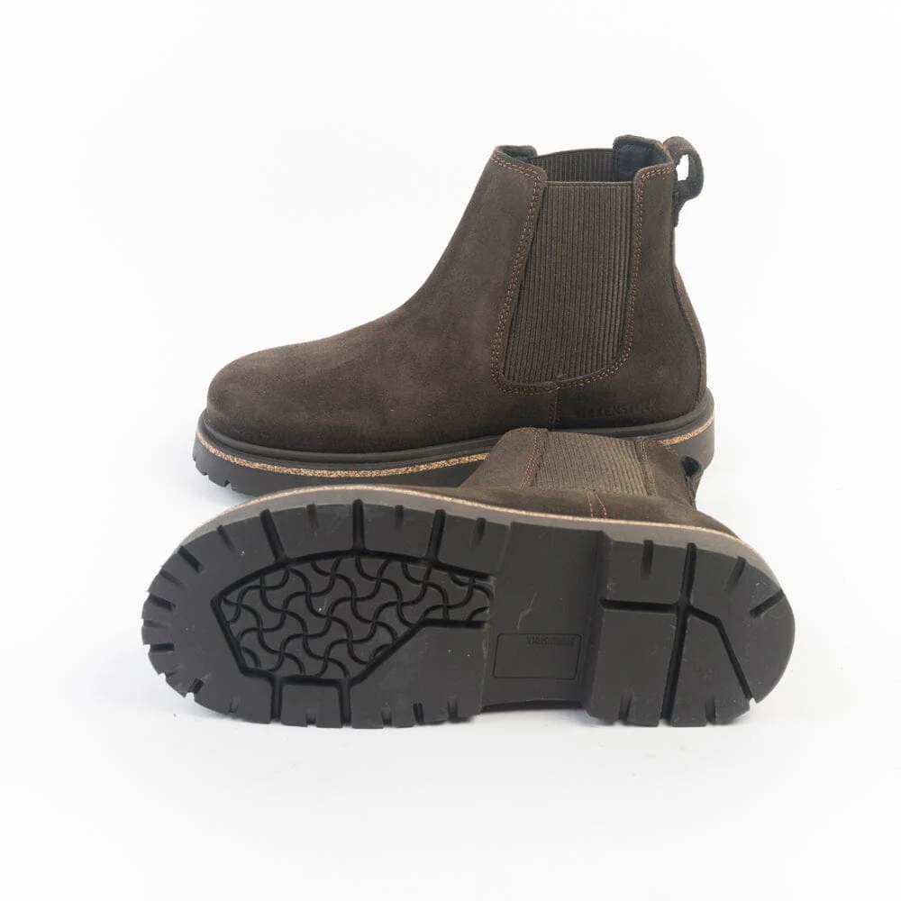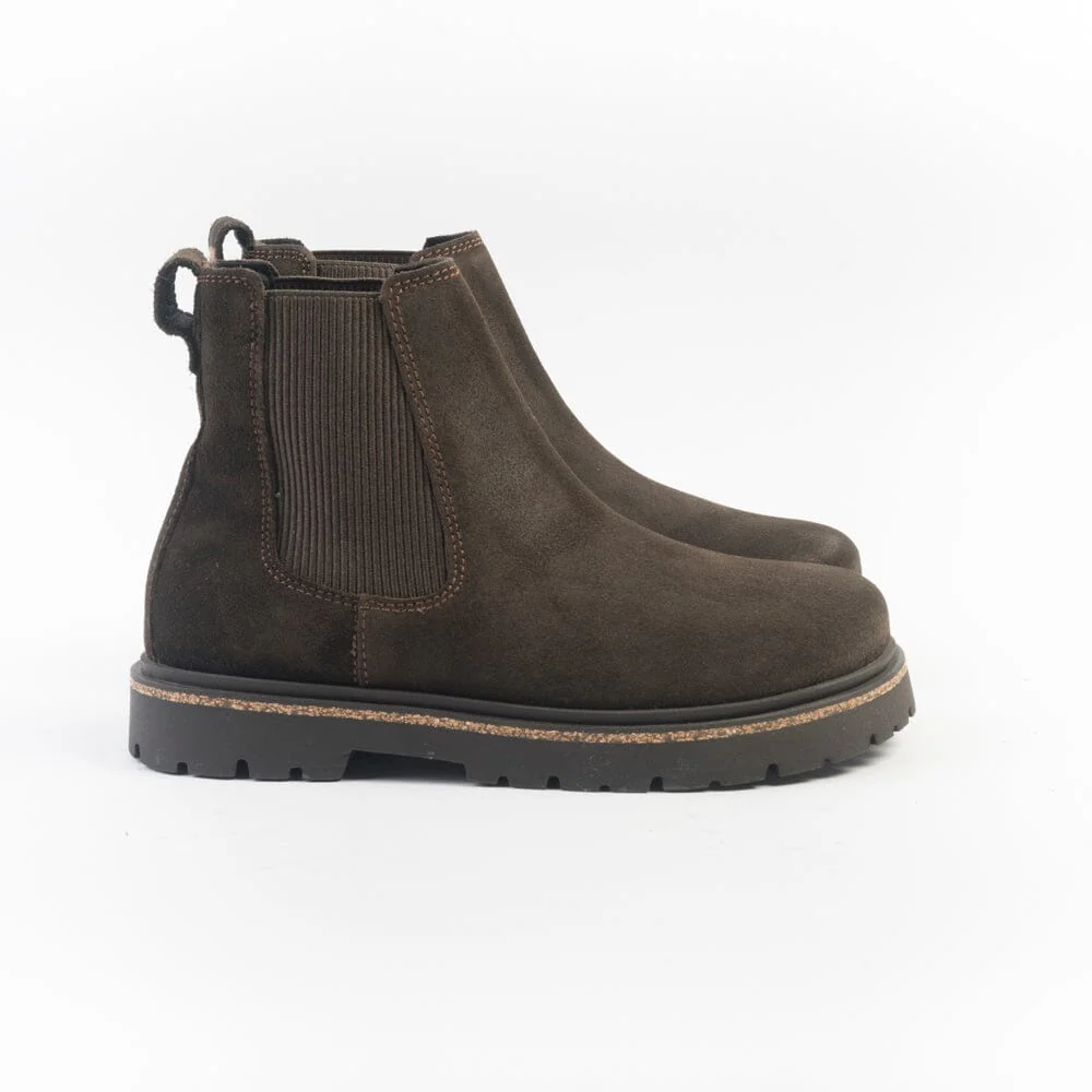 Stivaletto beatles Highwood di Birkenstock realizzato in camoscio di colore marrone testa di moro con elastici ai lati in nuance per facilitare la calzata. Plantare estraibile dalla forma anatomica. Suola in gomma di 2 cm.