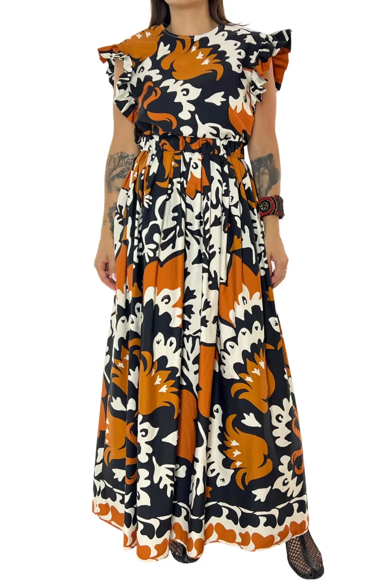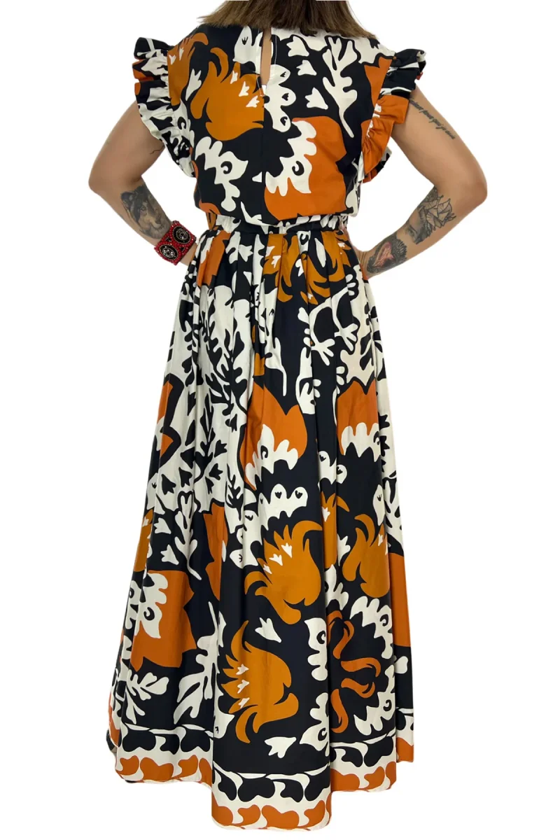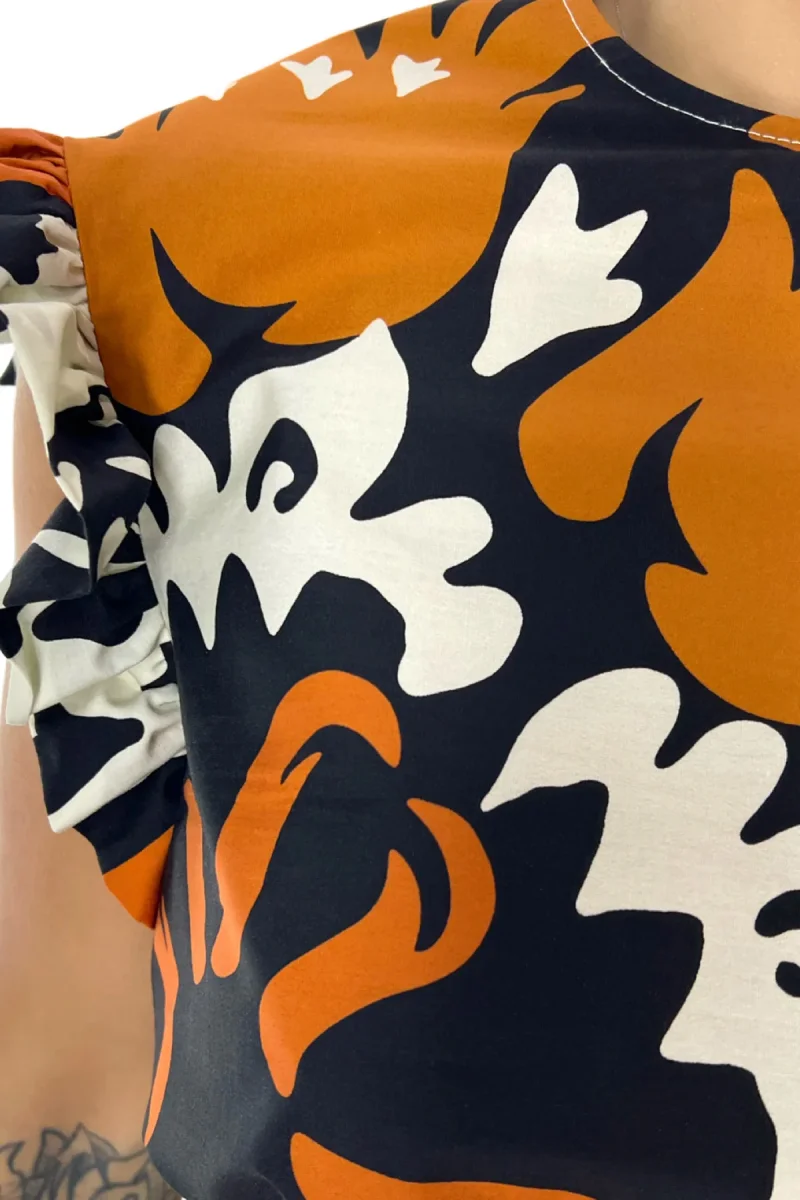 Blusa donna con volant sulla manica in cotone organico e stampa con chiusura a goccia sul retro