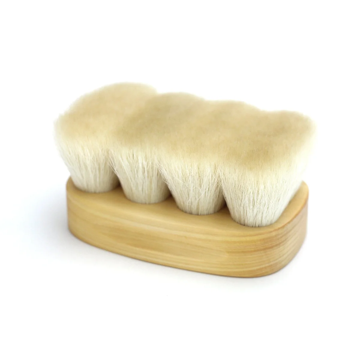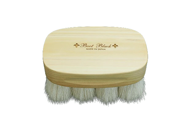 Spazzola per rifinitura scarpe, fatta a mano con una tradizionale lavorazione di Hiroshima, chiamata Kumano Fude, in pelo di capra e cavallo. Le setole sono volutamente infoltite verso la fine per rendere la spazzolatura ottimale nella fase della lucidatura.