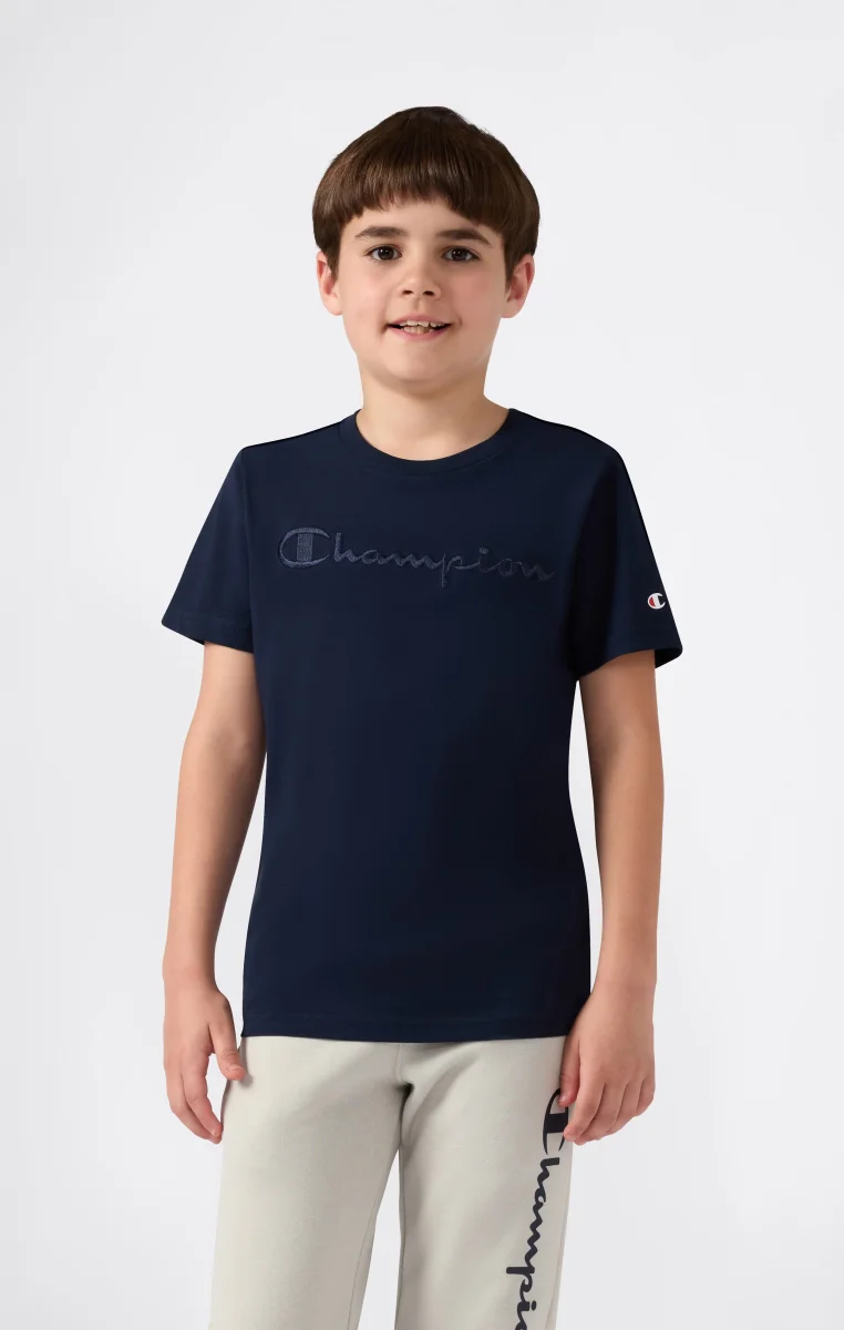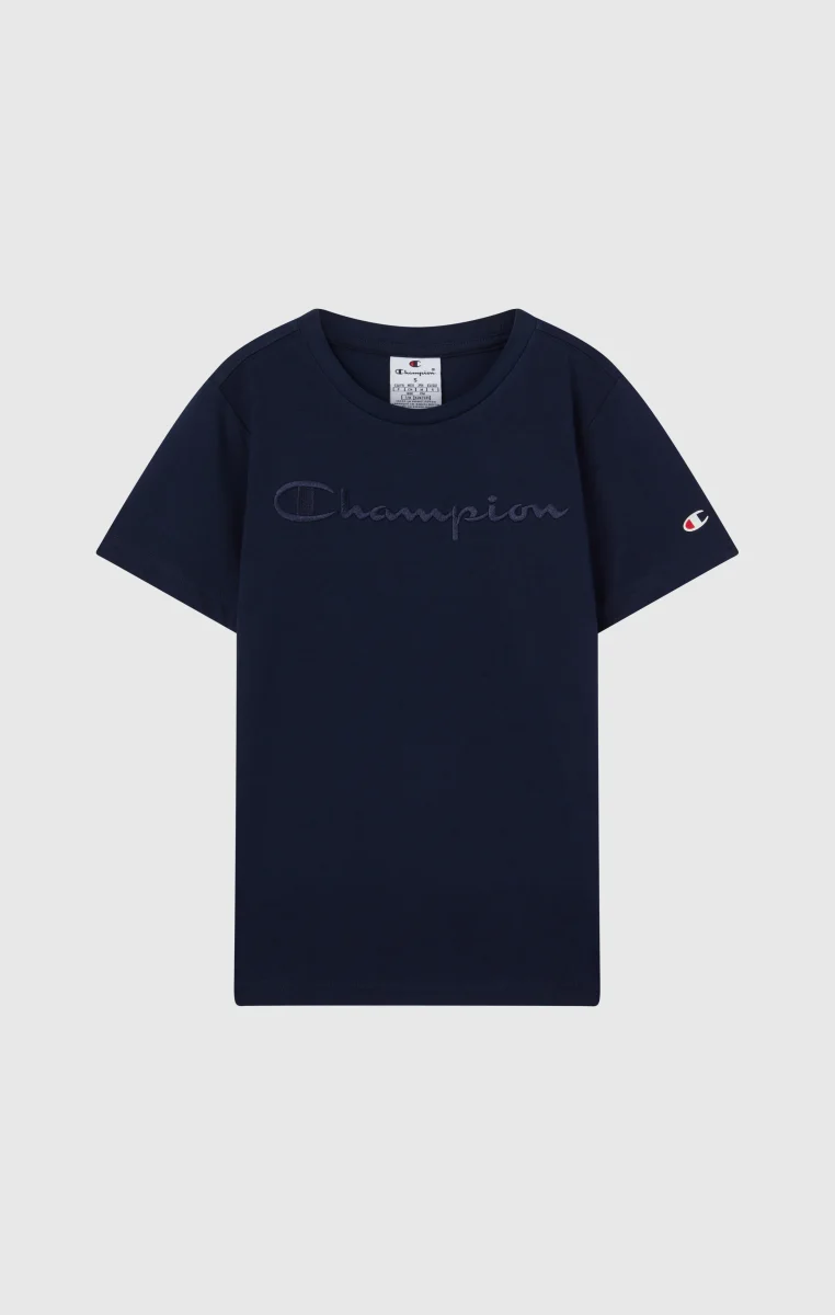 Essential pure cotton t-shirt with a simple design, perfect for any occasion. Features a tone-on-tone embroidered Champion logo on the chest, adding a distinctive touch to a comfortable and easy-to-style piece.@@@Fabric: Lightweight cotton jersey 150 g/m² |Composition: 100% Cotton |Ribbed crew neck |Tone-on-tone embroidered Champion logo |Printed internal label |Fit: Standard Fit – versatile and comfortable with standard widths and lengths. Close to the body with simple lines that don’t cling. Regular shoulder cut.