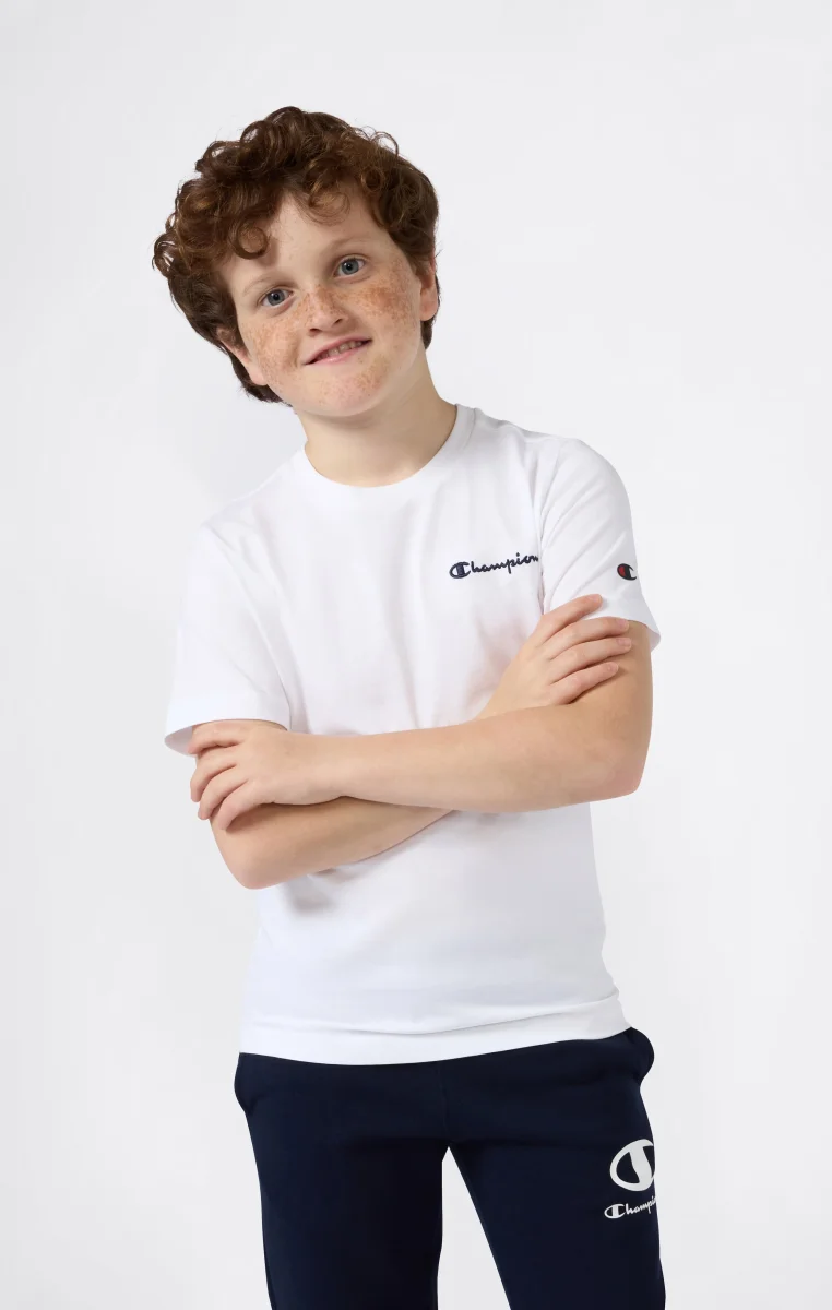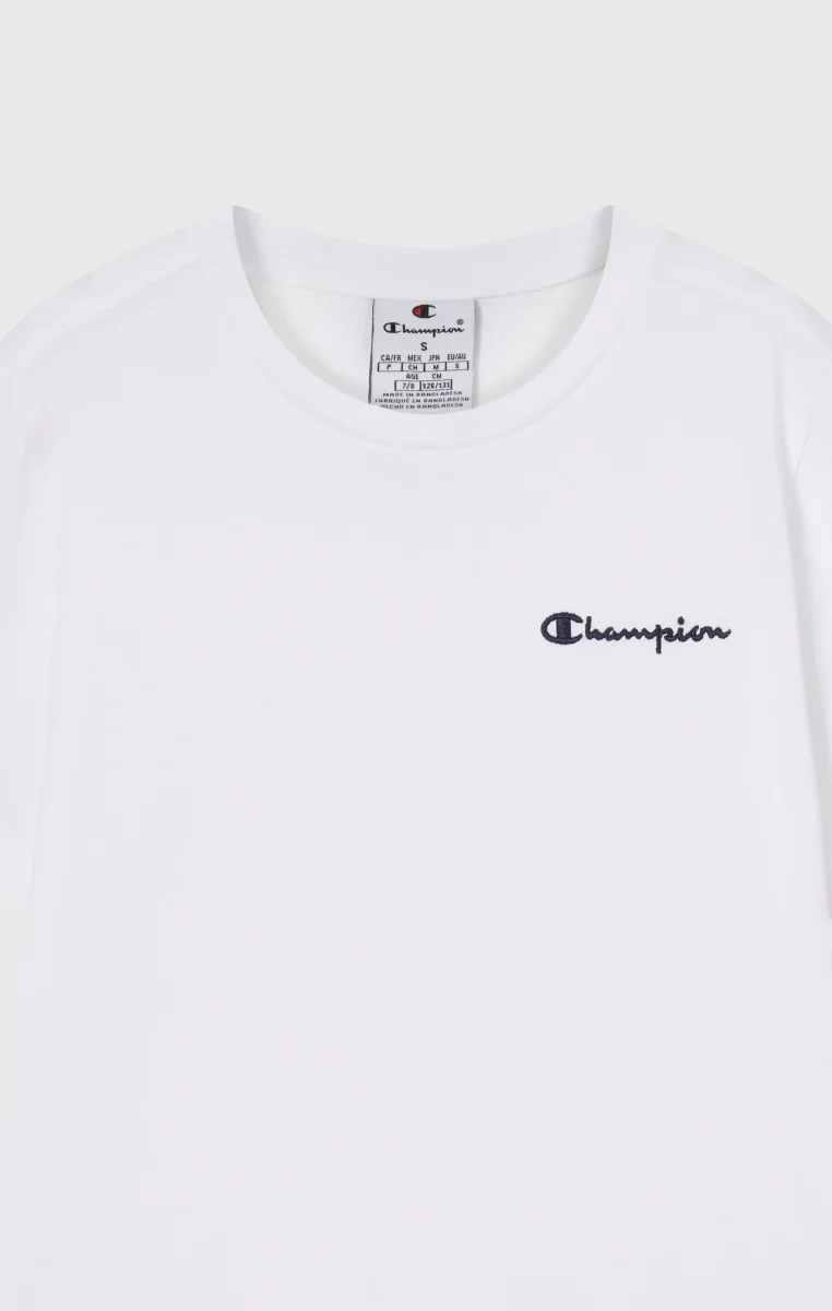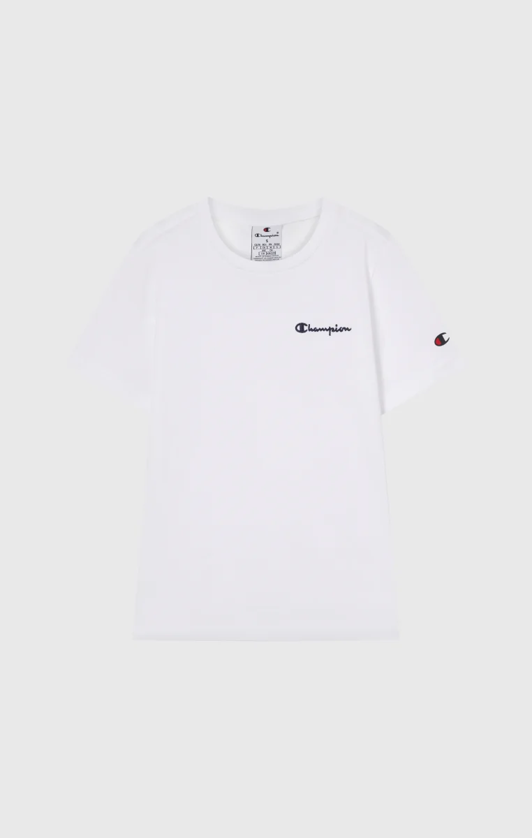 Essential everyday t-shirt made from lightweight cotton jersey, soft on the skin and perfect worn alone or under a sweatshirt. Features an embroidered Champion logo for an authentic heritage-inspired look.@@@Fabric: Lightweight cotton jersey 150 g/m² |Composition: 100% Cotton |Champion logo embroidered on chest |Ribbed crew neck |Fit: Standard Fit – versatile and comfortable with standard widths and lengths. Close to the body with simple lines that don’t cling. Regular shoulder cut.