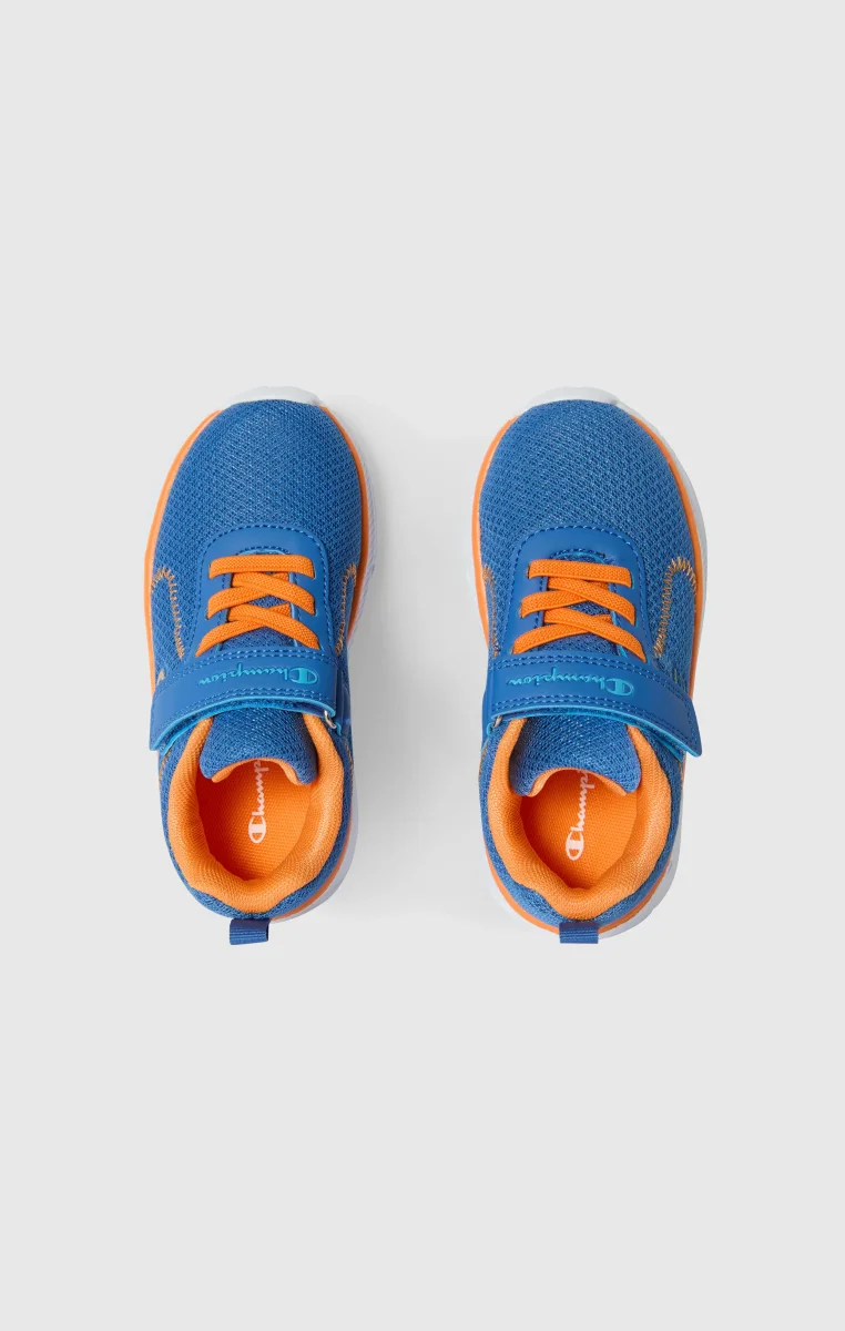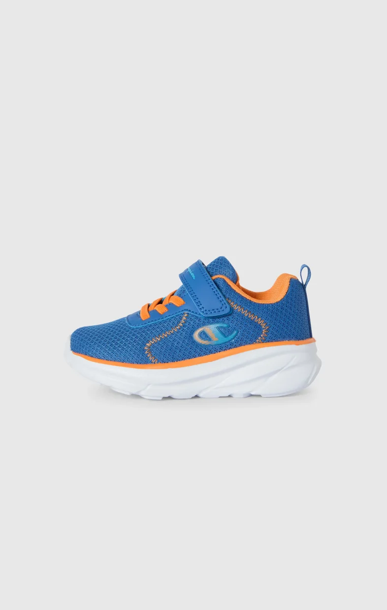 These low-cut kids’ trainers, inspired by the running world, are designed to support everyday activities with comfort and practicality. The polyester textile upper offers lightweight breathability, while polyurethane details add durability. The hook-and-loop strap with elastic laces makes them easy to put on and take off independently. The EVA outsole provides a lightweight and comfortable feel during movement, making these trainers ideal for school and leisure time. The sporty design is completed by the Champion logo on the side.@@@Practical and comfortable fit |Low-cut design |Synthetic textile upper |Upper composition: 85% Polyester, 15% Polyurethane |Polyester inner lining |EVA outsole – lightweight and comfortable for everyday wear |Hook-and-loop closure with elastic laces |Champion logo on the side