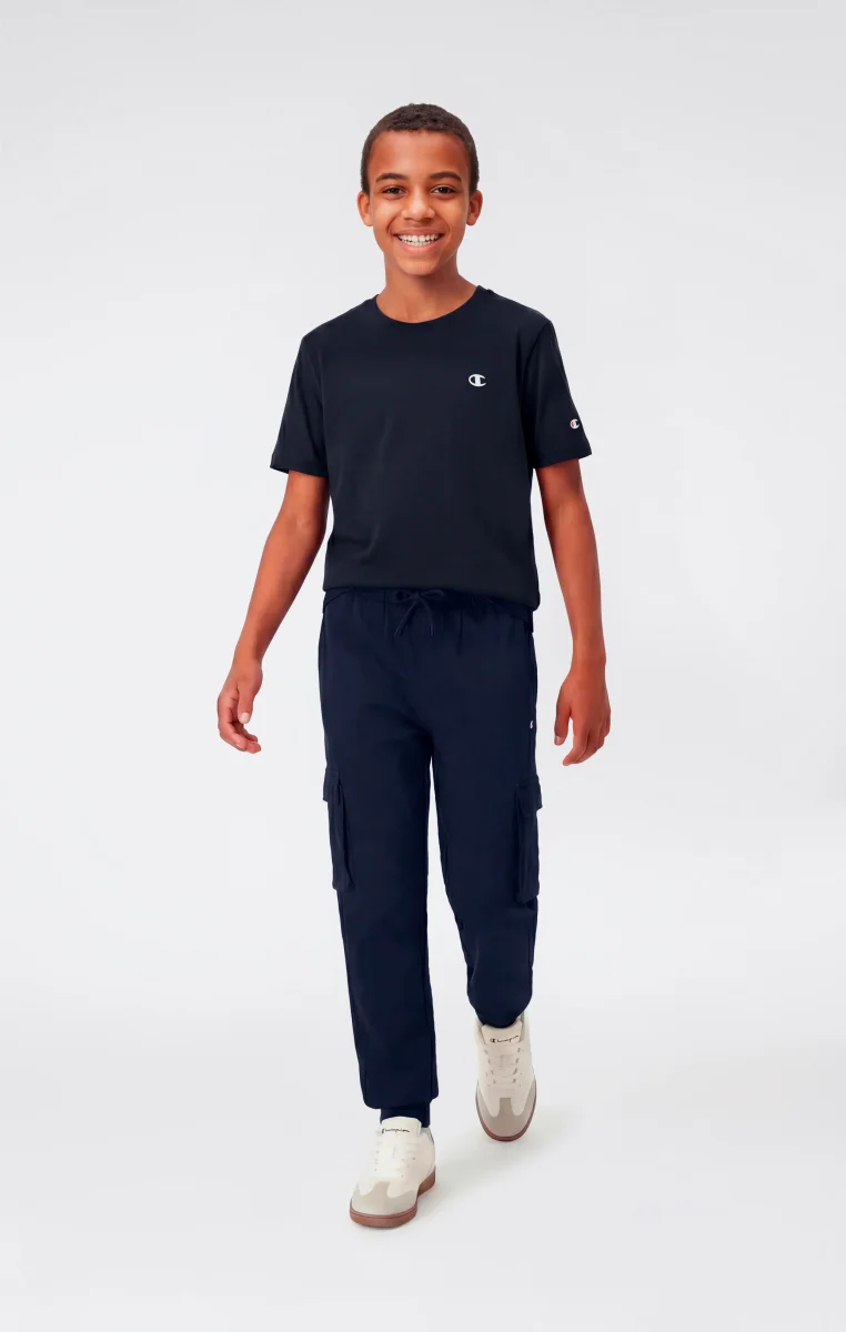 Boys’ cargo pants made from soft lightweight terry fabric, compact in structure and pleasant to the touch. Ideal for everyday wear, they offer comfort and practicality thanks to a regular fit that follows movement naturally. The cargo design with side pockets defines a clean utility aesthetic, consistent with Champion’s sportswear DNA.@@@Fit: Standard Fit – comfortable, regular line |Fabric: Ultra Light Soft Compact Spring Poly Terry, lightweight and compact terry fabric |Composition: 73% Cotton, 27% Polyester |Weight: 240 g/m² |Design: long leg with elasticated hem |Pockets: applied side pockets |Unbrushed interior