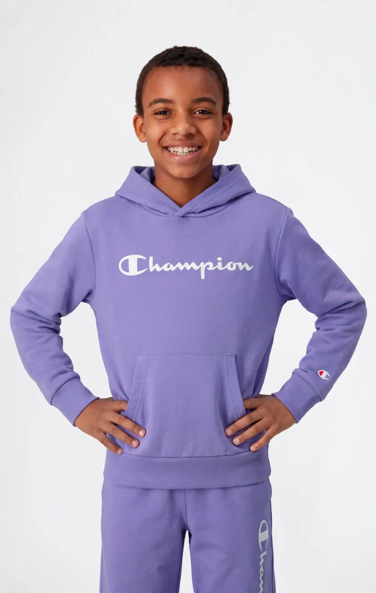 This boys’ hooded sweatshirt is part of Champion’s classics and is made from lightweight cotton-blend fleece designed for everyday comfort. The regular fit ensures an easy and comfortable feel, ideal for school, leisure time and daily activities. The clean design is defined by a large printed Champion logo on the chest, an iconic and instantly recognizable detail.@@@Fit: Standard Fit – comfortable, regular line |Fabric: Ultra Light Basic Terry, lightweight and compact fleece fabric |Composition: 55% Cotton, 45% Polyester |Weight: 240 g/m² |Details: hood and front kangaroo pocket |Logo: maxi printed Champion logo on the chest |Unbrushed interior