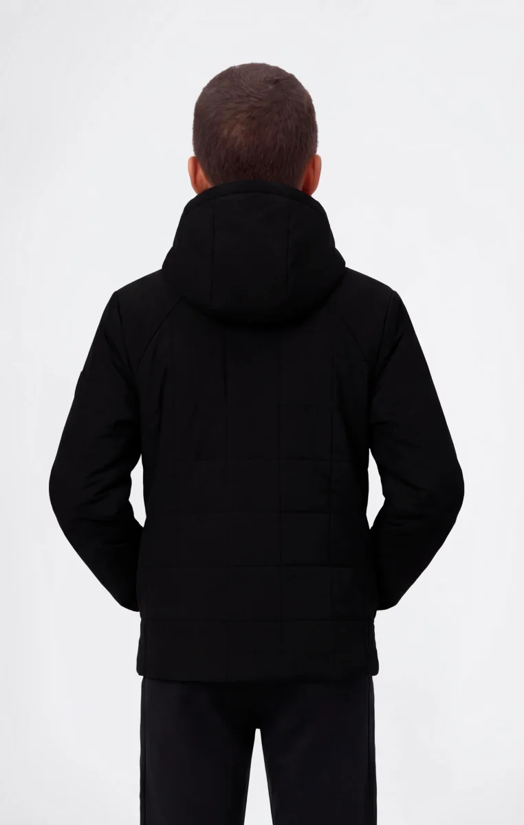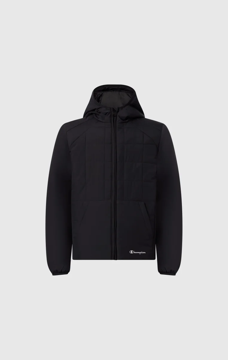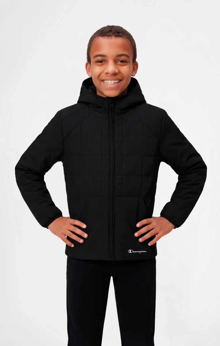 Boys’ padded jacket designed to deliver lightweight warmth, comfort and protection for everyday wear and outdoor activities. Made from woven fabric with a water-resistant finish, it is ideal for transitional seasons and cooler days. The fixed hood and full zip closure provide practical coverage, while the lightweight 80 g padding offers warmth without bulk. A functional, sporty style inspired by Champion’s heritage.@@@Standard Fit, comfortable and functional |Full zip front closure |Fixed hood |Front pockets |Woven fabric with water-resistant treatment |Lightweight padding, 80 g |Composition: 100% Polyester