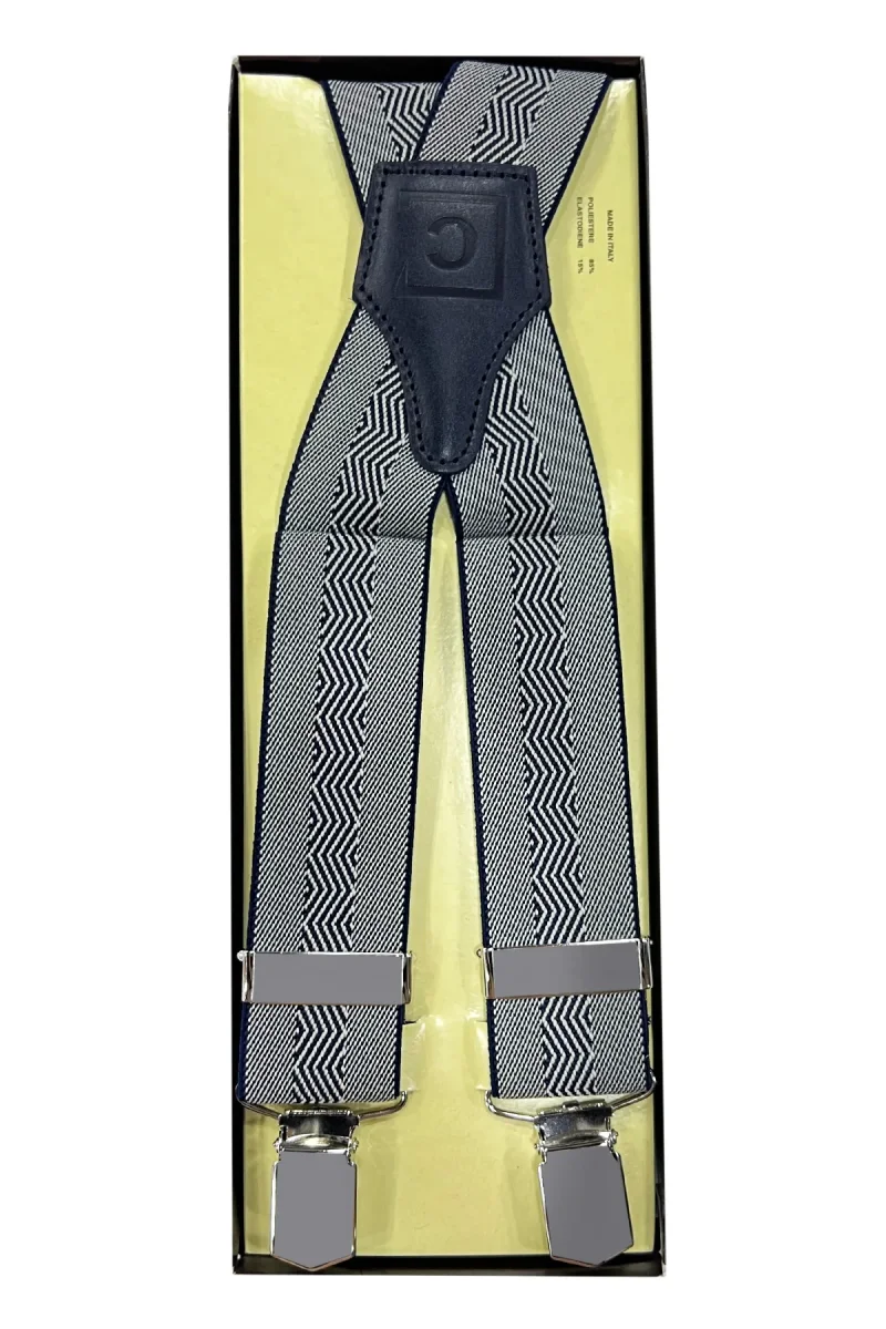 BRETELLE DA UOMO BLU FANTASIA ELASTICIZZATE 3,5 CM REGOLABILI CON CHIUSURA PINZE ARGENTO