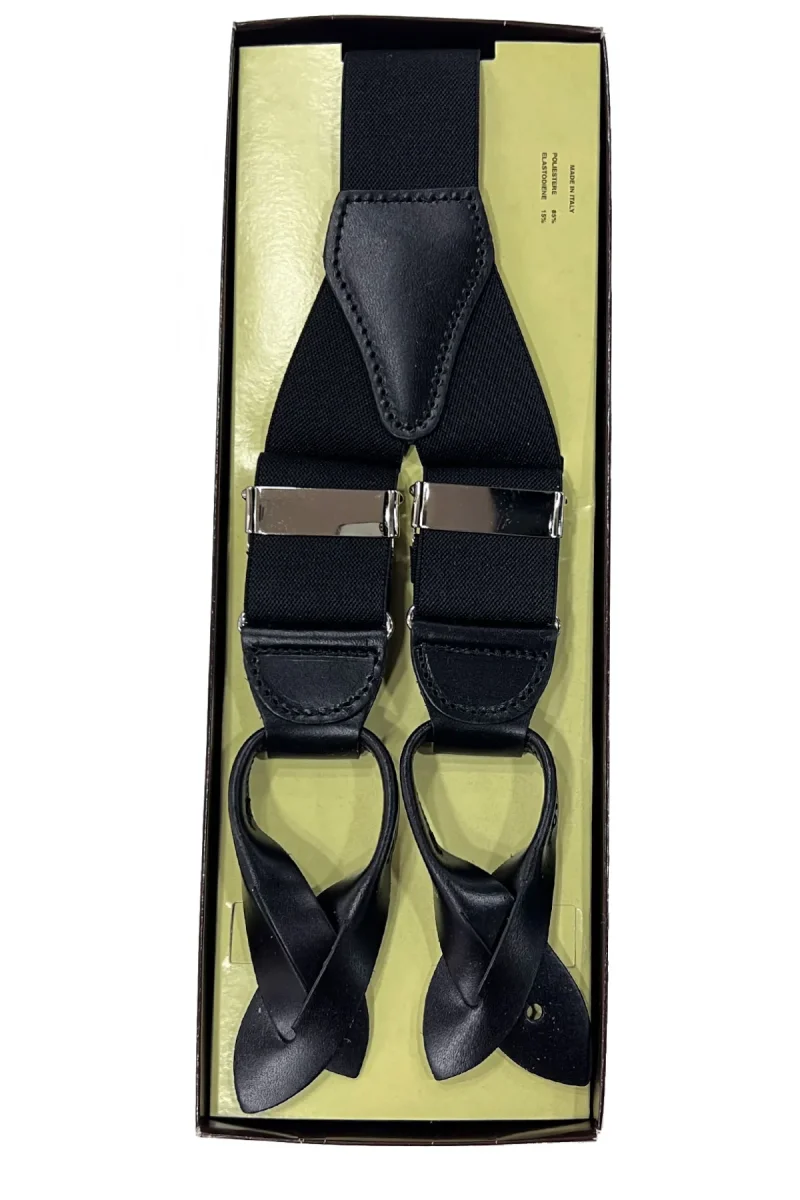 BRETELLE DA UOMO NERE TINTA UNITA ELASTICIZZATE 3,5 CM REGOLABILI CON CHIUSURA CUOIO PER BOTTONI